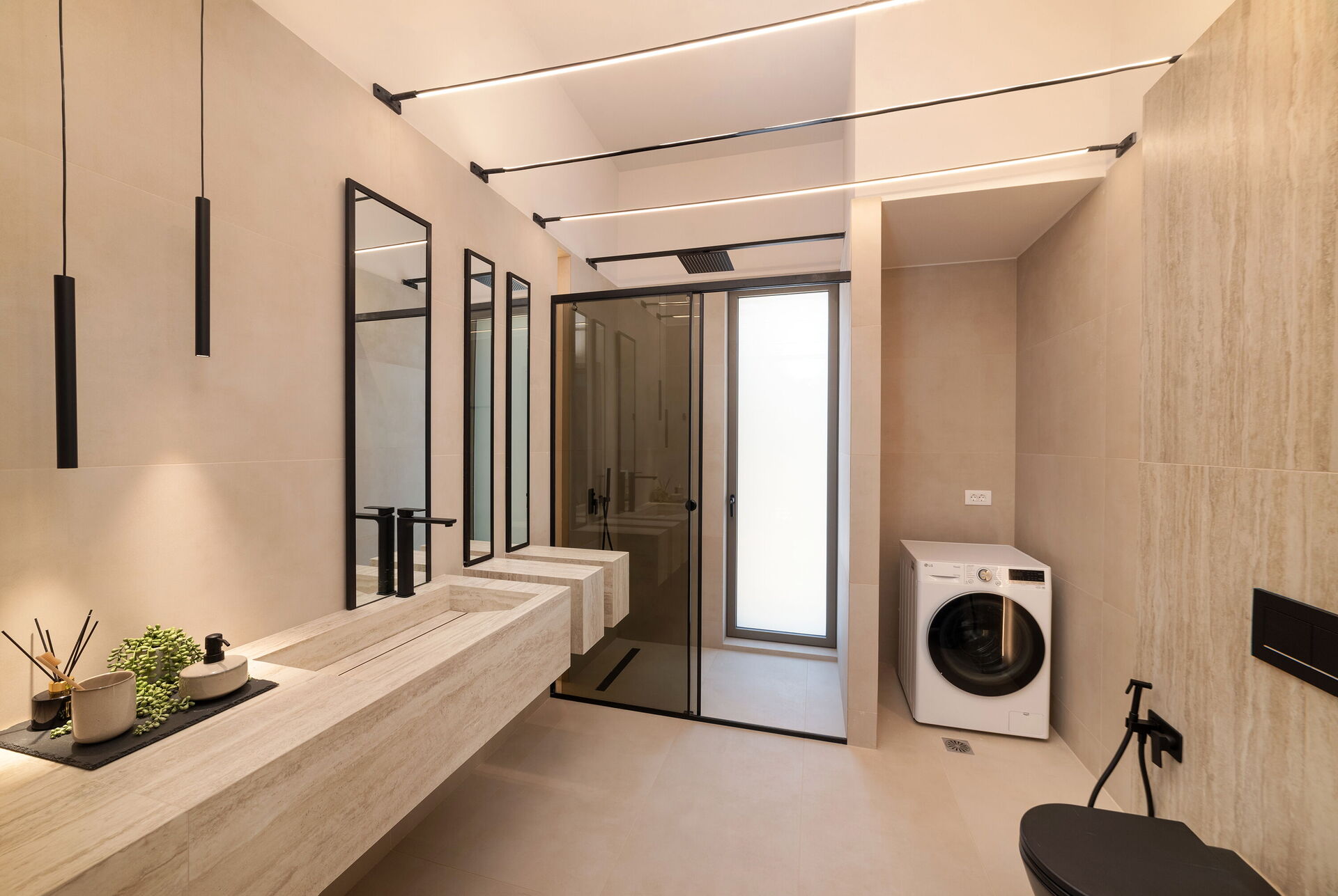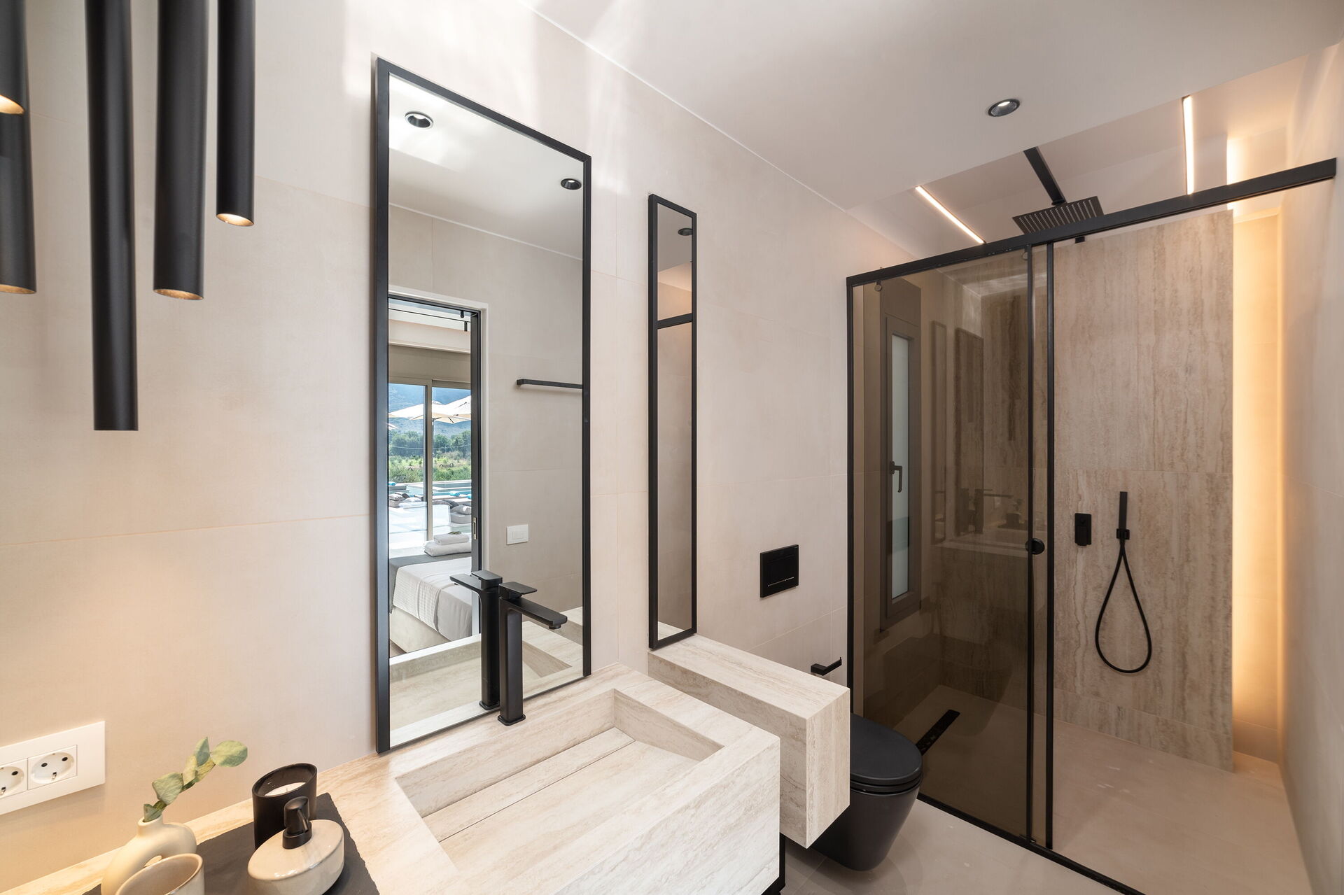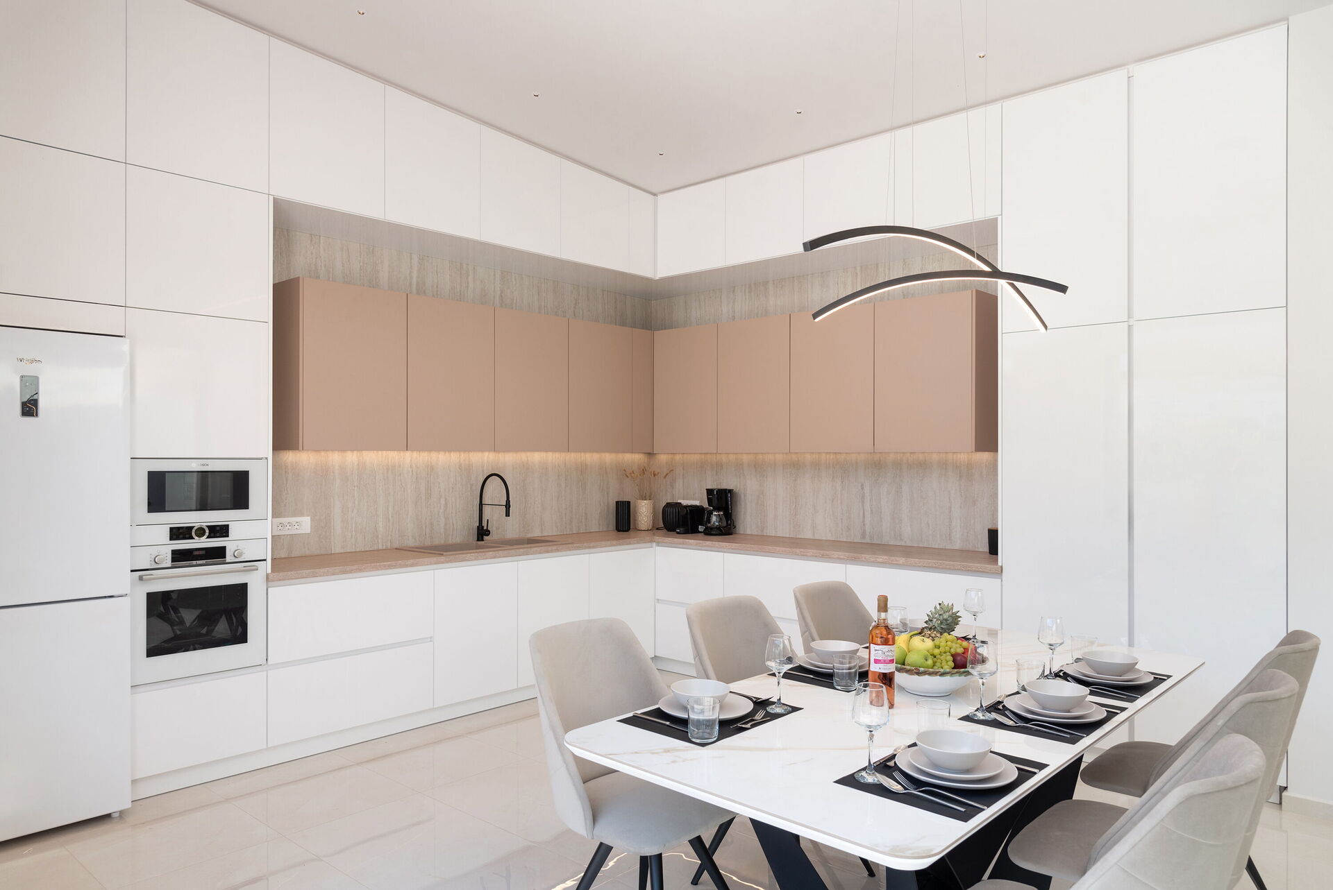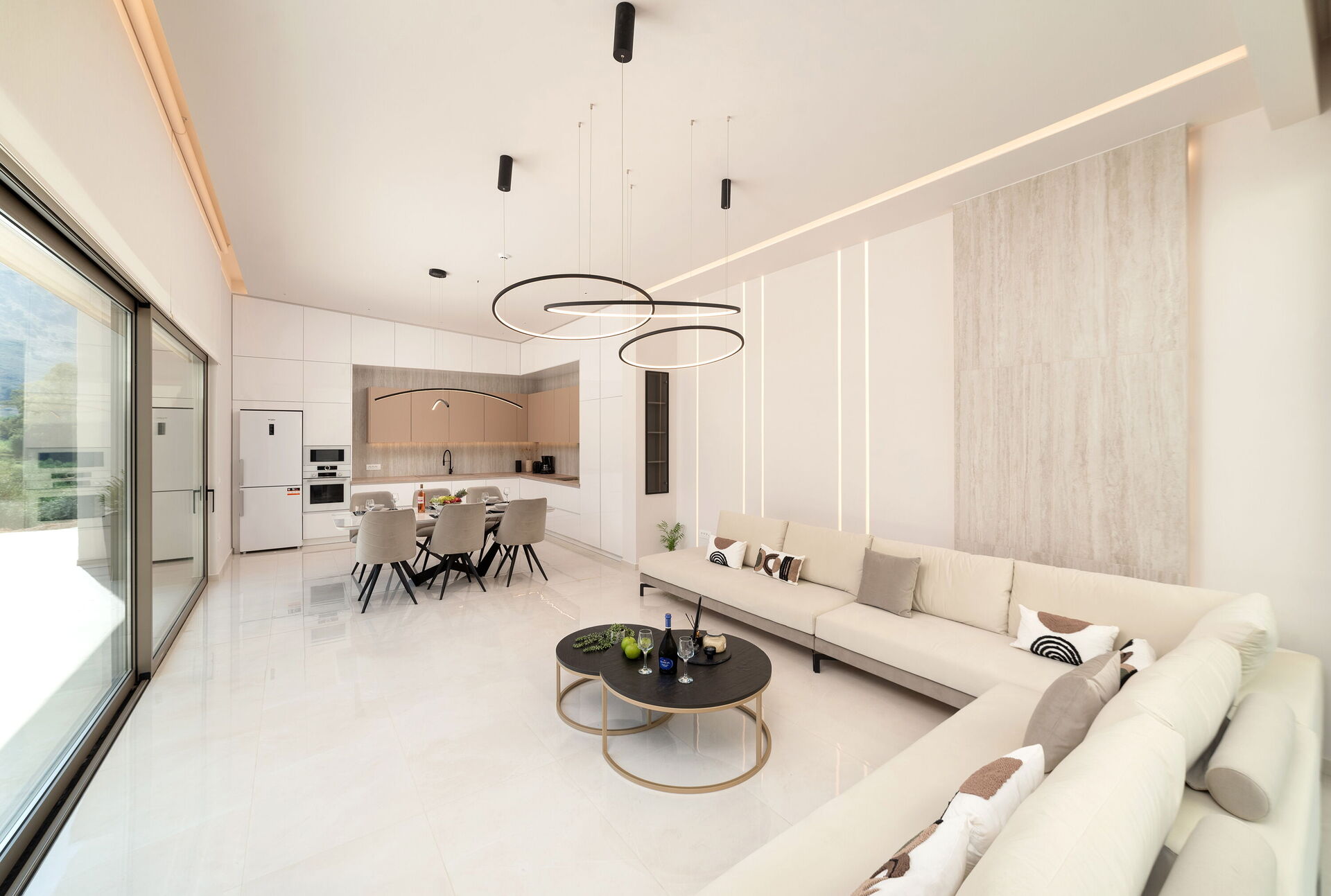 Design och komfort kännetecknar denna ljusa, lyxiga villa: möblerna och planlösningen har valts med stor omsorg. Invändigt och utvändigt är fastigheten designad för att erbjuda högsta komfort. Semesterhuset har plats för 7/8 personer i 4 sovrum och på uteplatsen finns ett stort möblerat område med utekök och matplats där du kan njuta av vackra soliga dagar på Kreta. I den privata poolen (med bubbelpool) kan gästerna svalka sig och ha kul.