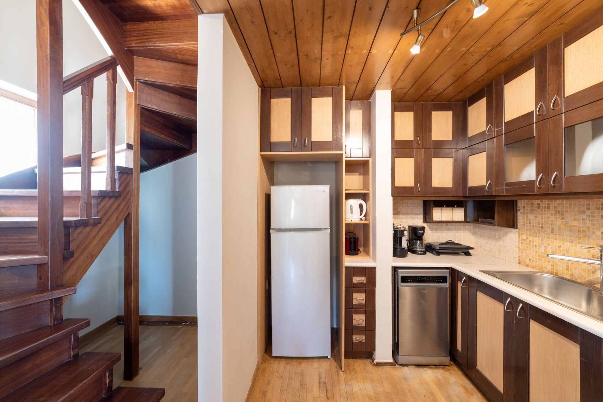 Vardagsrum (TV, DVD) med öppen spis och pentry (ugn, diskmaskin, espressomaskin), dusch.