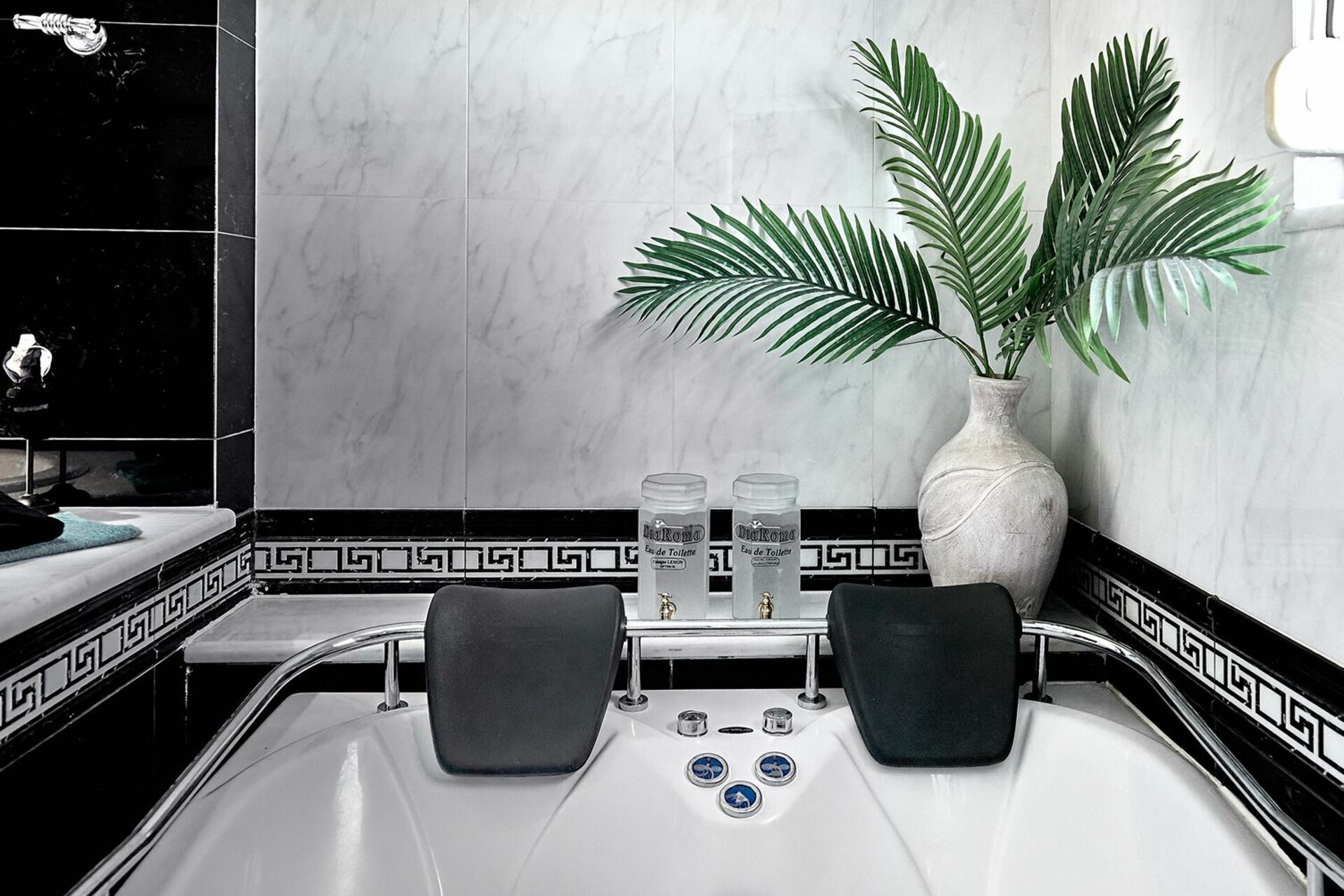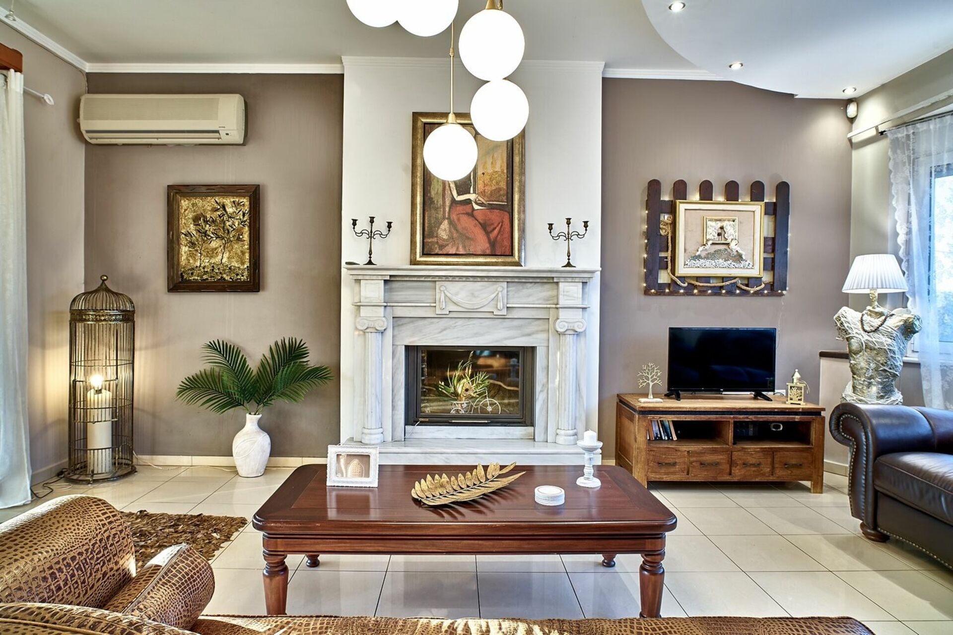 Stort vardagsrum med öppen spis i marmor och tillgång till stor möblerad täckt terrass; WC, sovrum med king size-säng och tillgång till privat balkong; dubbelrum; sovrum med 2 enkelsängar; badkar med bubbelpool; badrum med dusch och tvättmaskin
