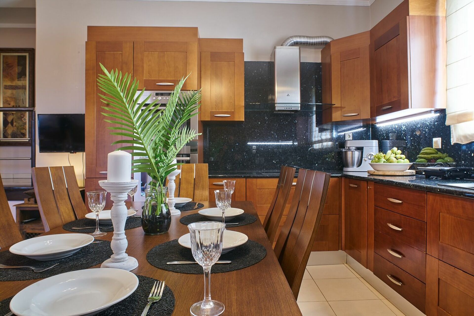 Välutrustat kök (ugn, kyl med ismaskin, frys, diskmaskin) med matplats och pentry
