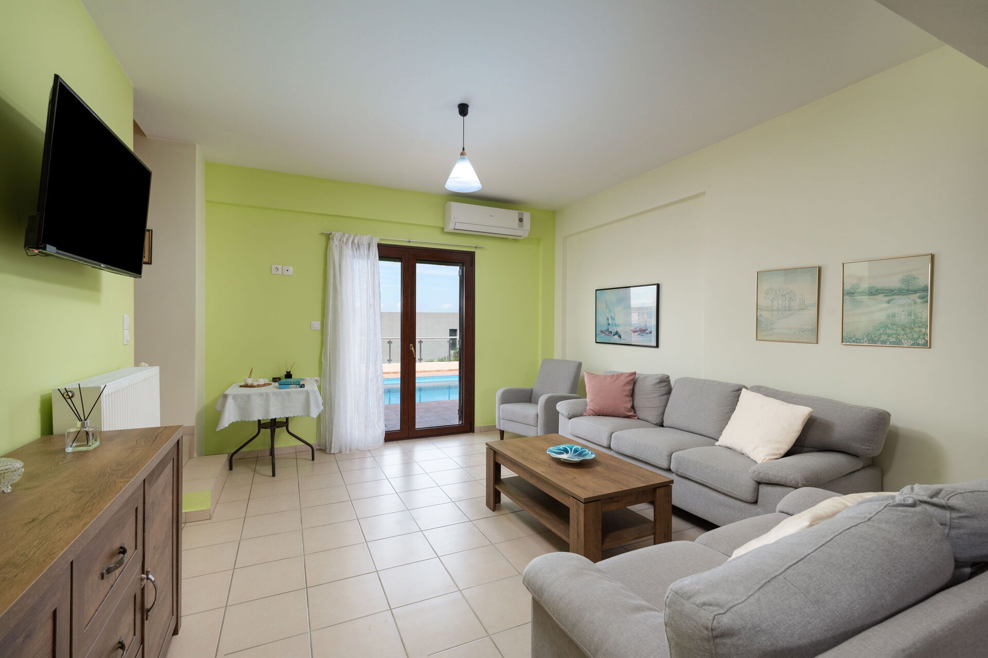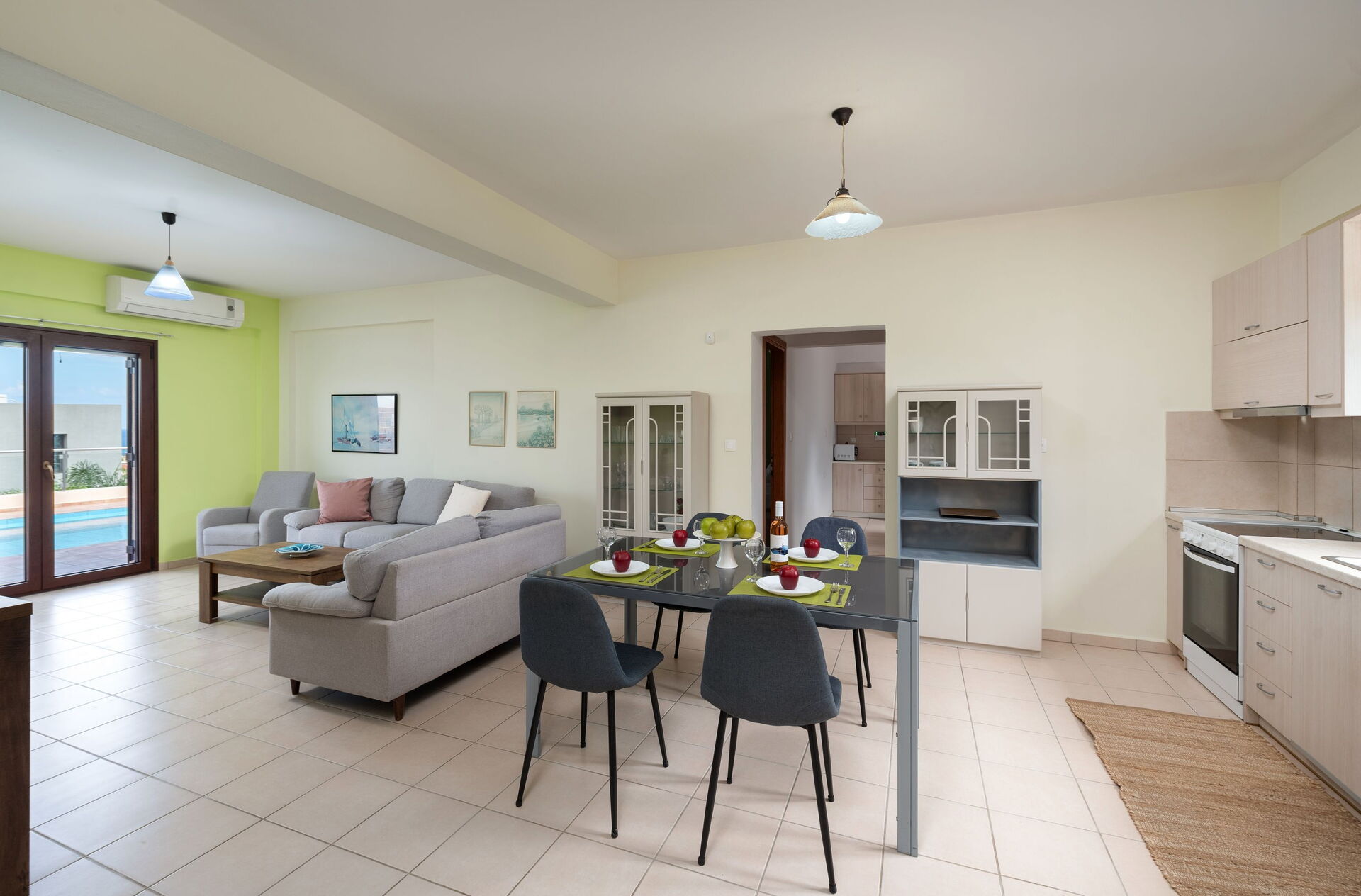 Vardagsrummet har tillgång till poolområdet och det lilla köket har tillgång till terrassen på framsidan med tegelgrillen.