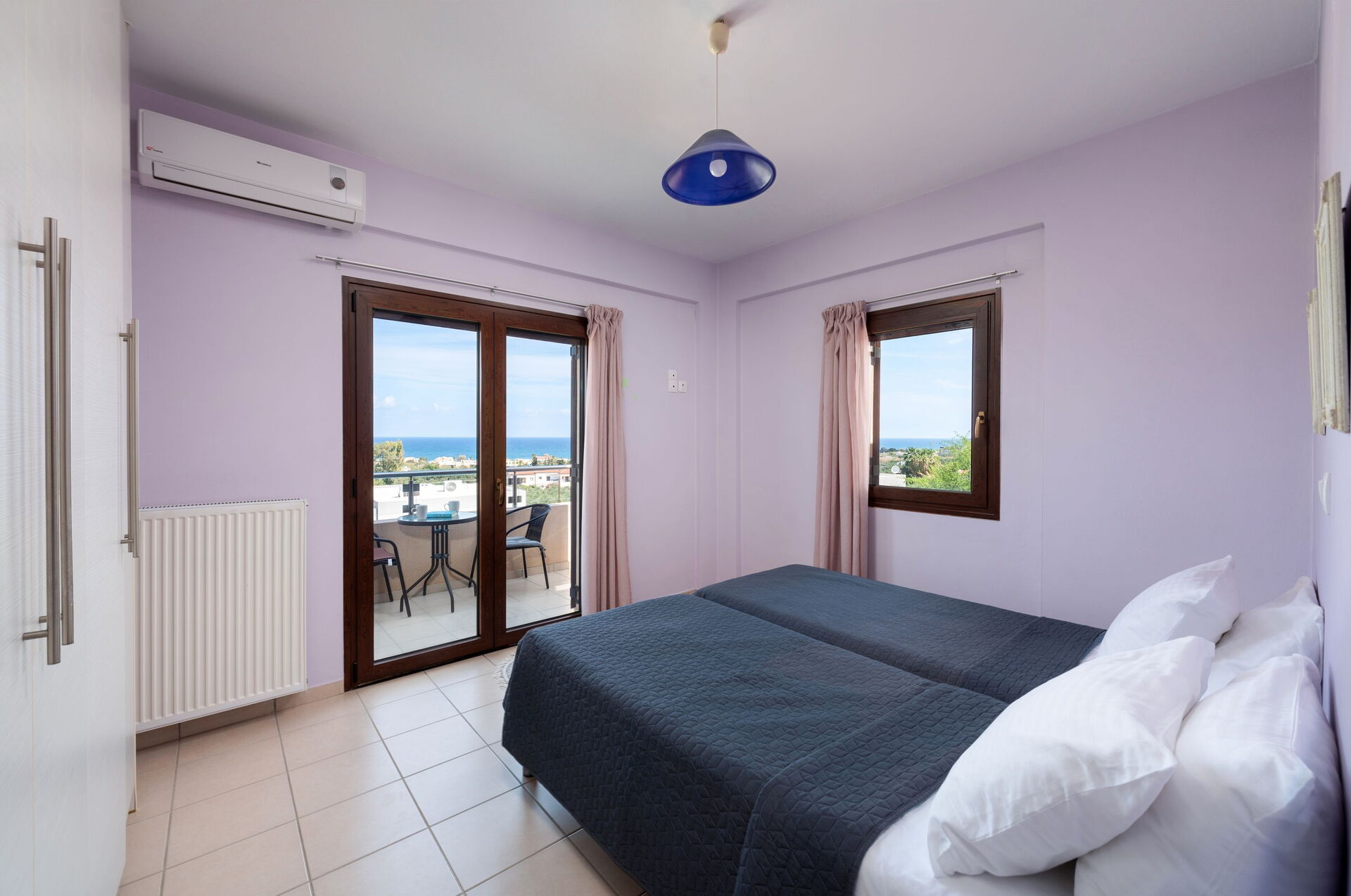 Tvåbäddsrum och utgång till panoramaterrass, badrum med badkar och dusch (tvättmaskin), dubbelrum och utgång till en mindre balkong (poolutsikt och havsutsikt).
