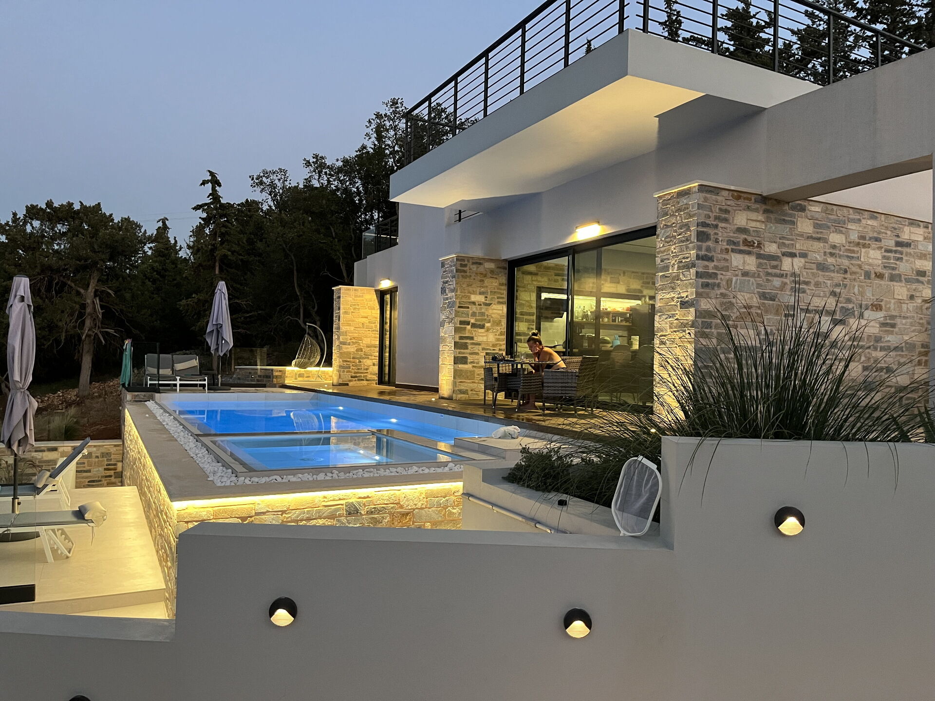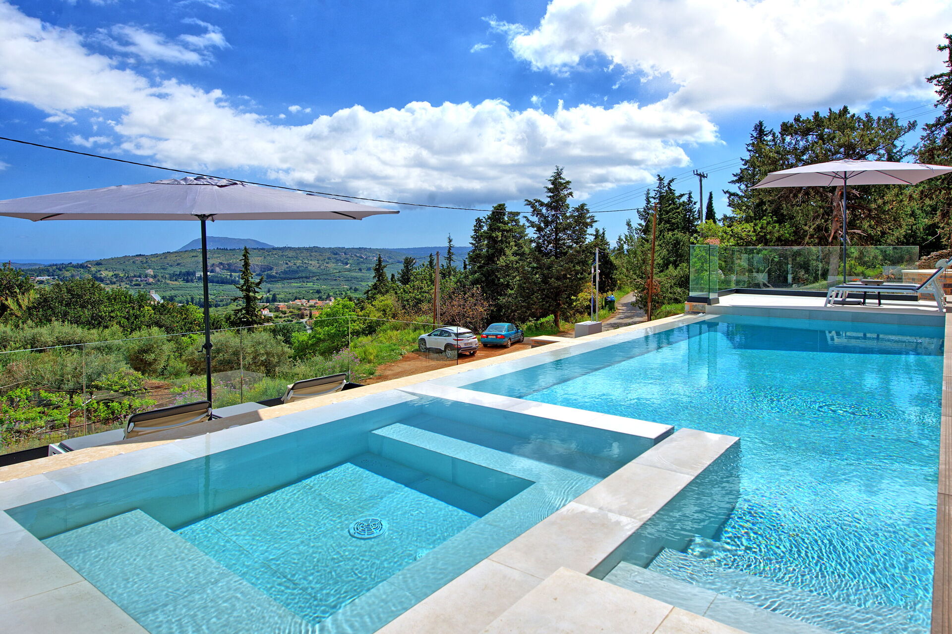 Beautiful new and modern, state of the art 1-story villa in a quiet and picturesque area of Crete. Amazing view. All amenities present, very hospitable and friendly owner, personal touches make you feel very welcome. Owner delivered the villa super-clean and stopped by 1-2 times per week to change bed linens and towels. The main east/west highway on the island is within a 5 minute drive. There is no hustle and bustle, no noise, just crickets. Beautiful infinity type pool with steps leading into it. 0.9m deep on the shallow end, about 1.5m on the deep end. 10 meters swimming length and additionally, a whirlpool type section with seats for enjoying drinks and conversation. No actual whirlpool function. Pool is well kept, pool boy visits regularly to clean it out and check water quality.