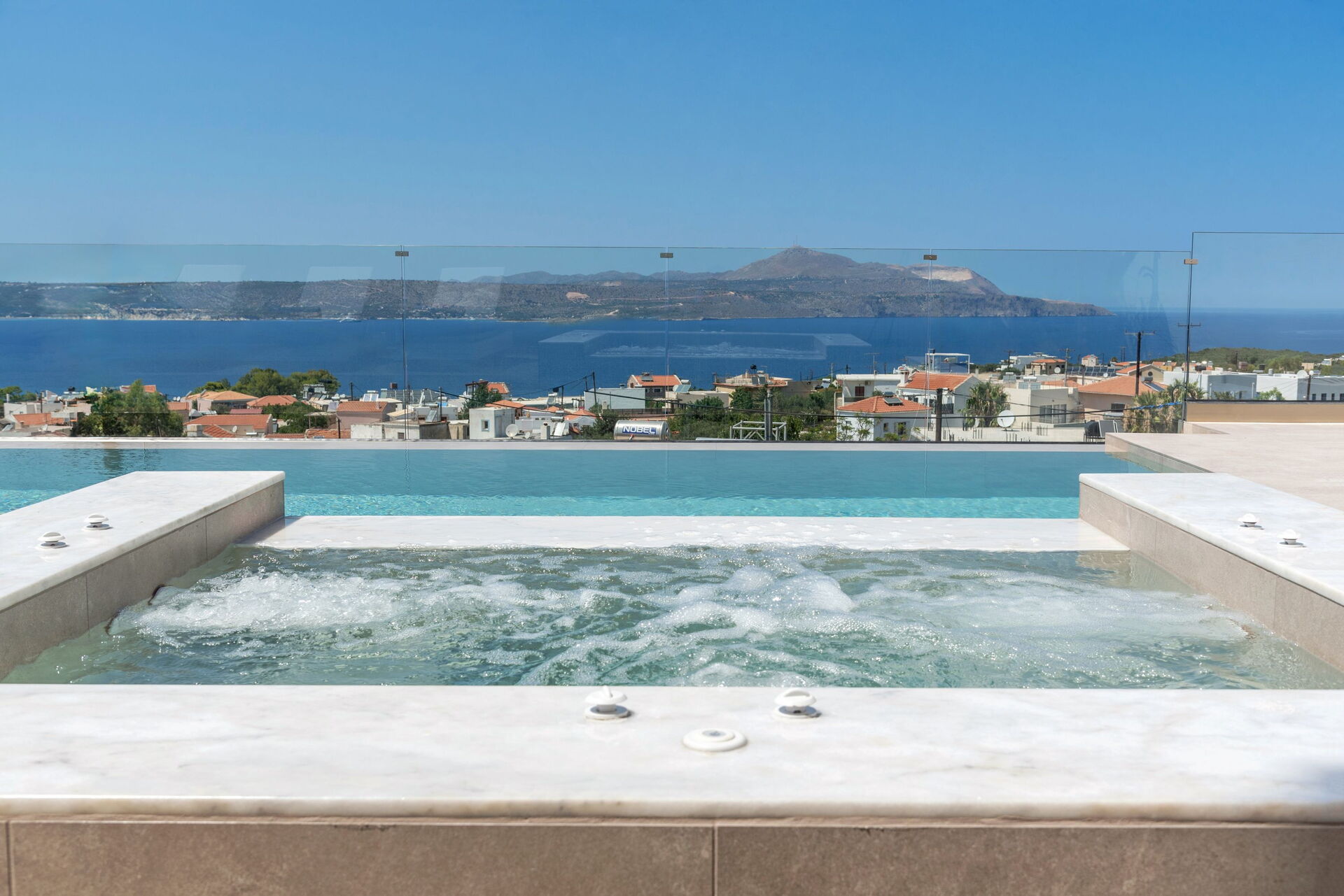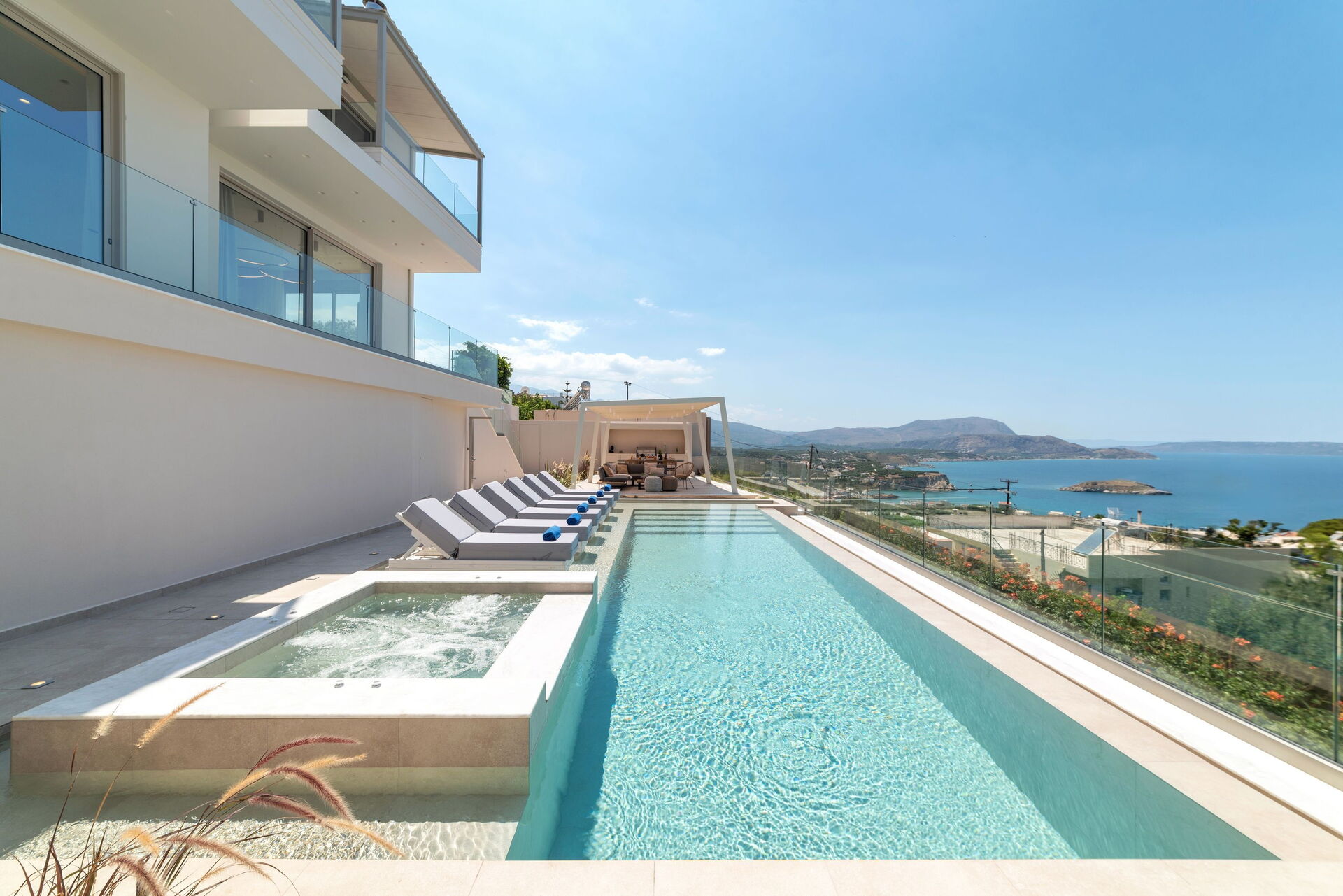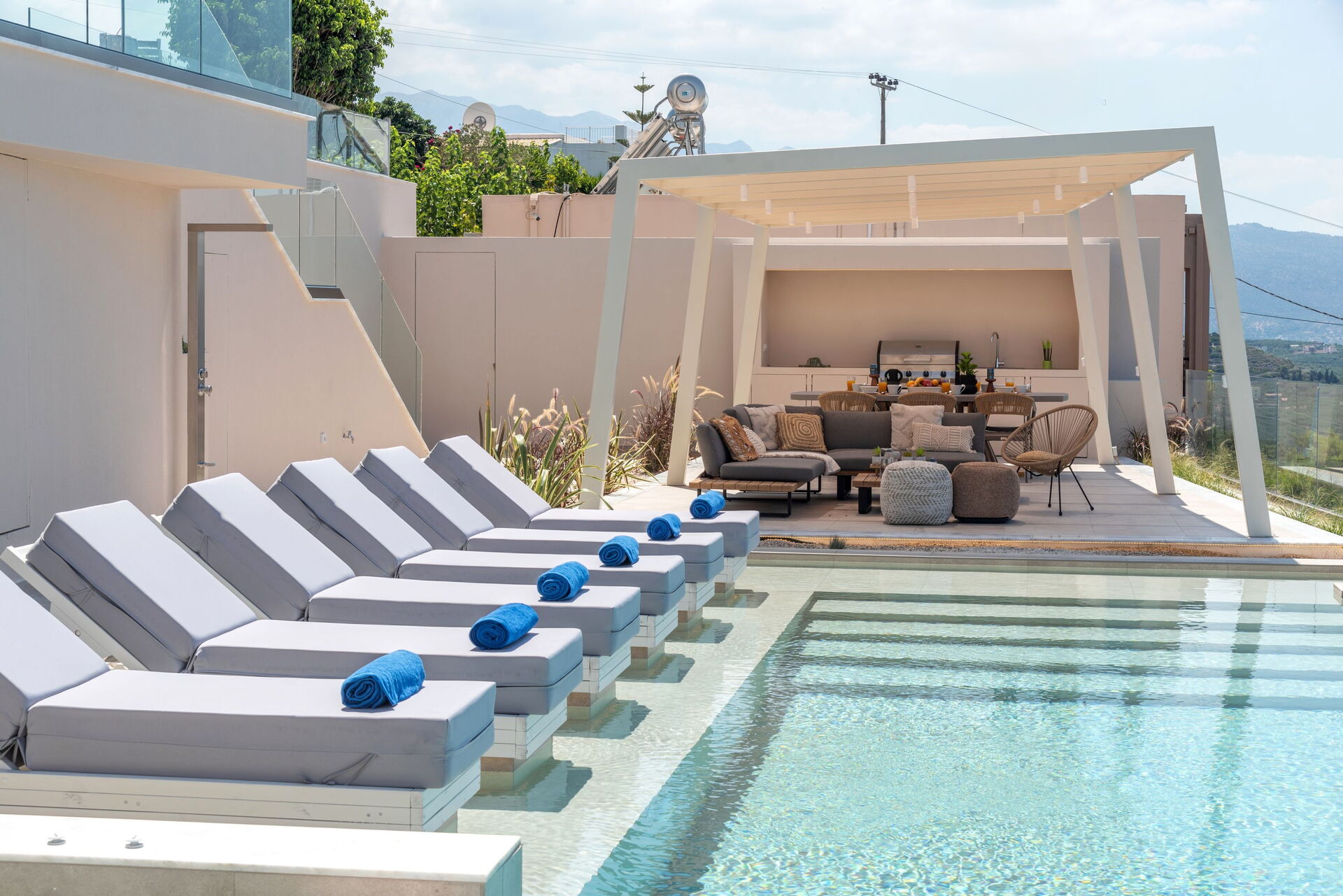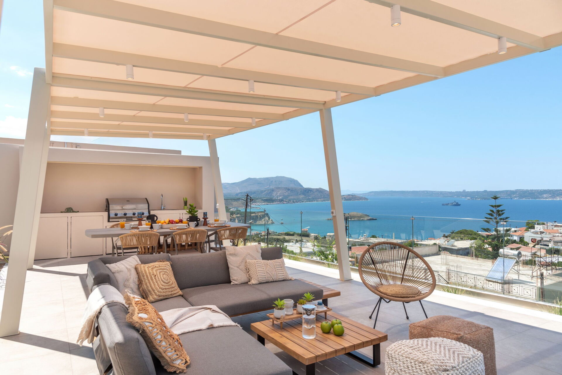Uteområdet är utrustat med grill och bord för läckra måltider, en helt ny pool med hydromassageavdelning och en vacker utsikt över Soudabukten och det kristallklara havet.