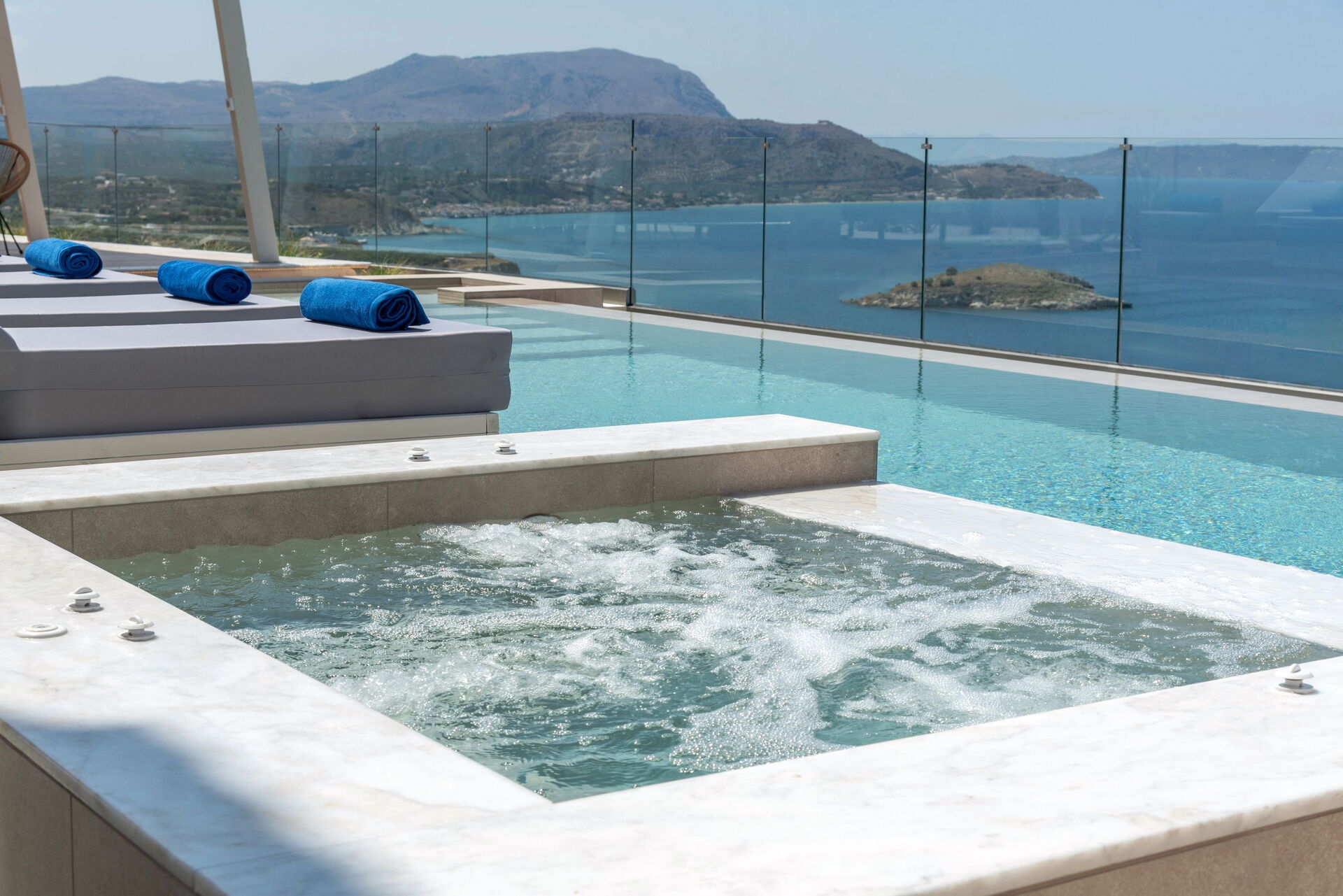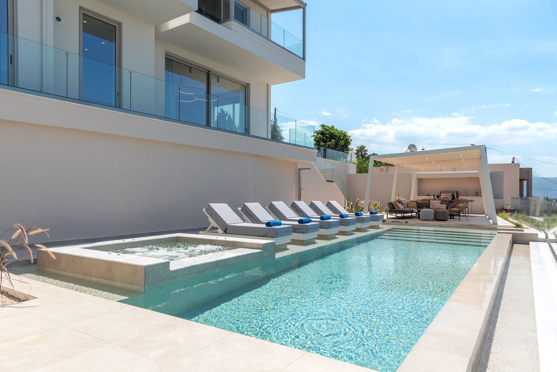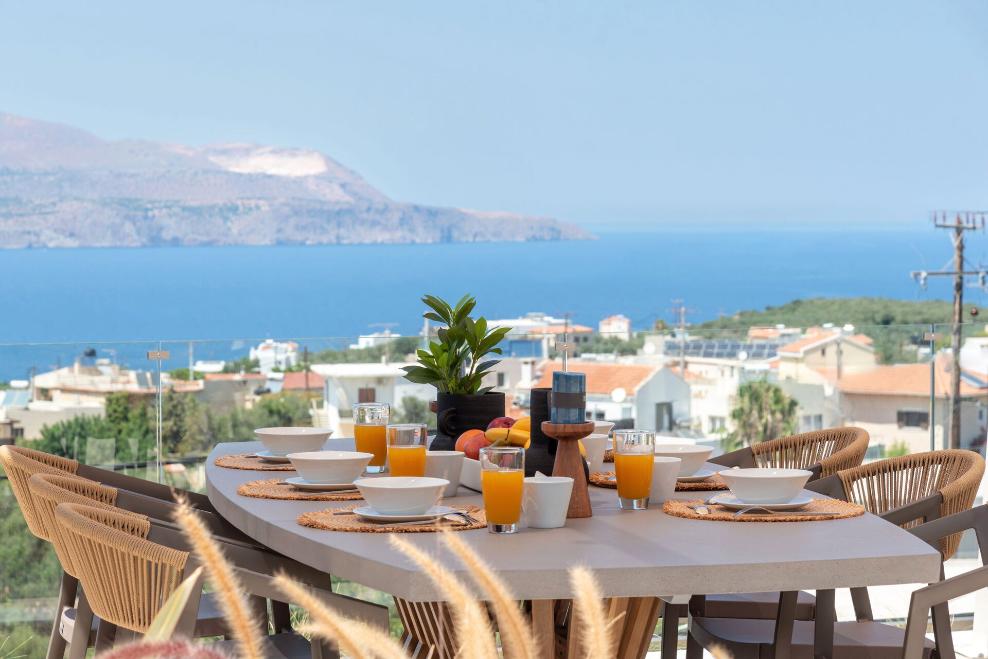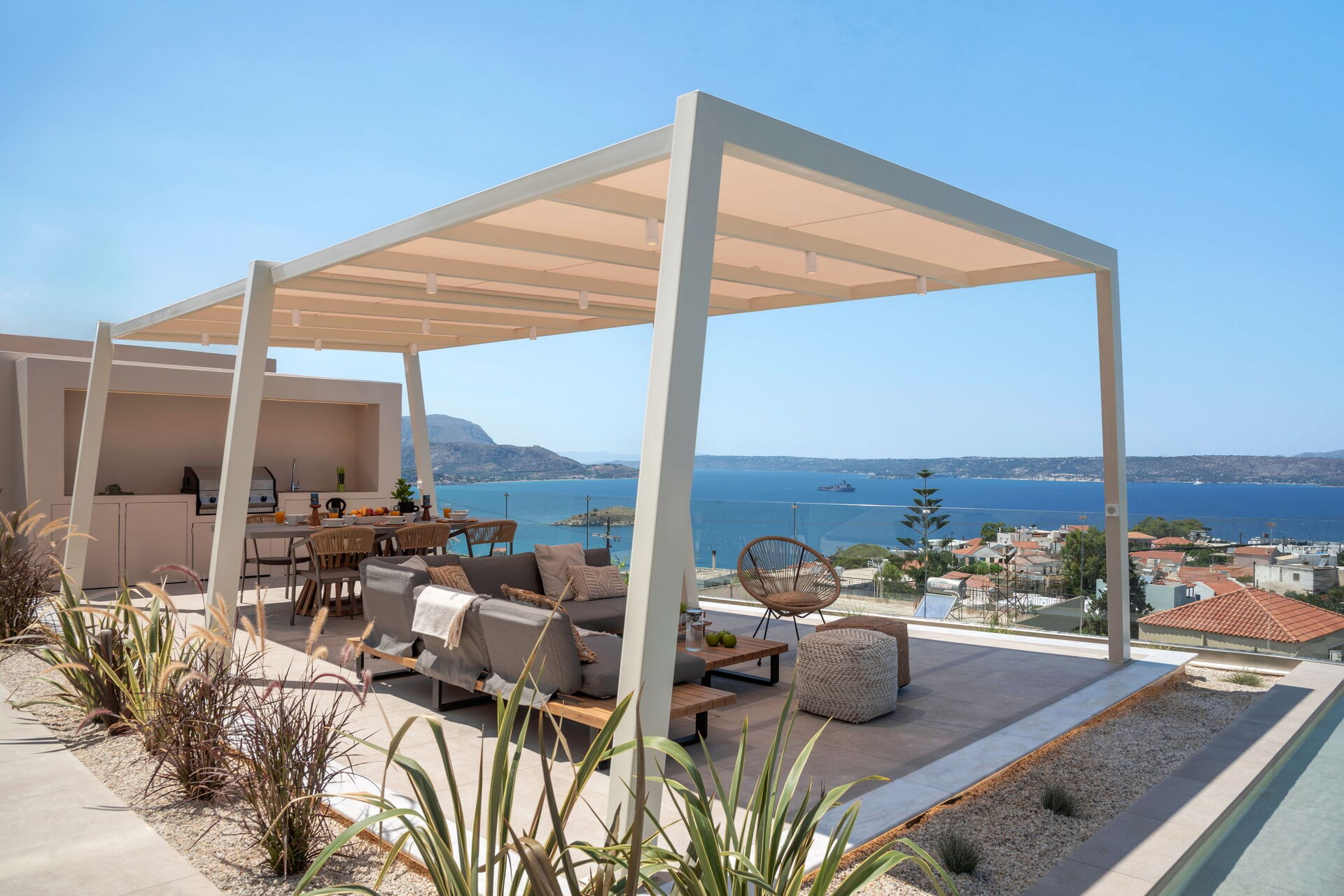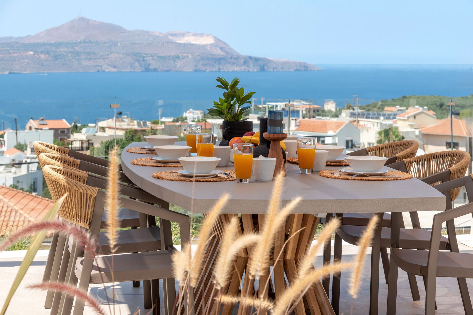 Uteområdet är utrustat med grill och bord för läckra måltider, en helt ny pool med hydromassageavdelning och en vacker utsikt över Soudabukten och det kristallklara havet.