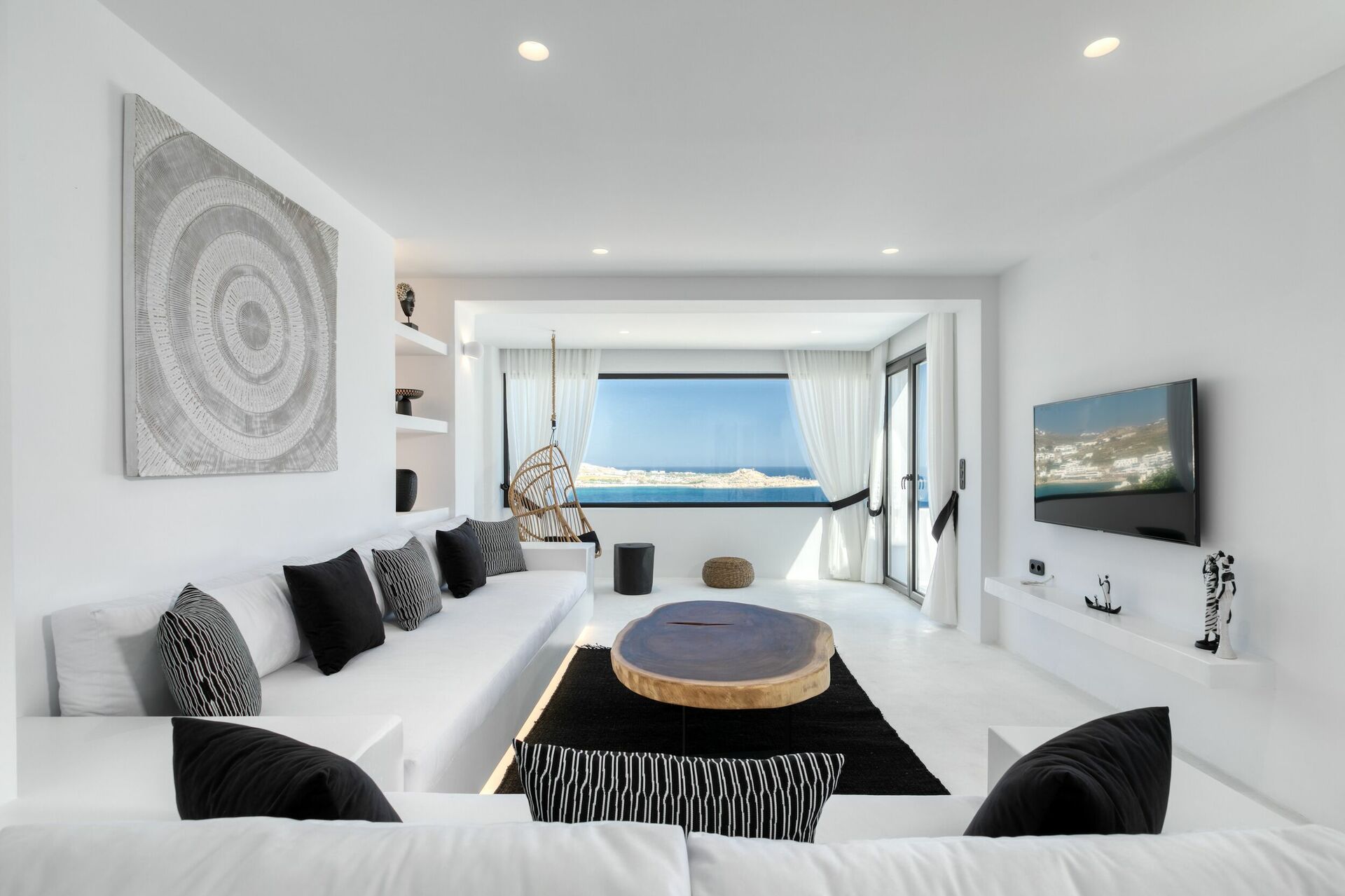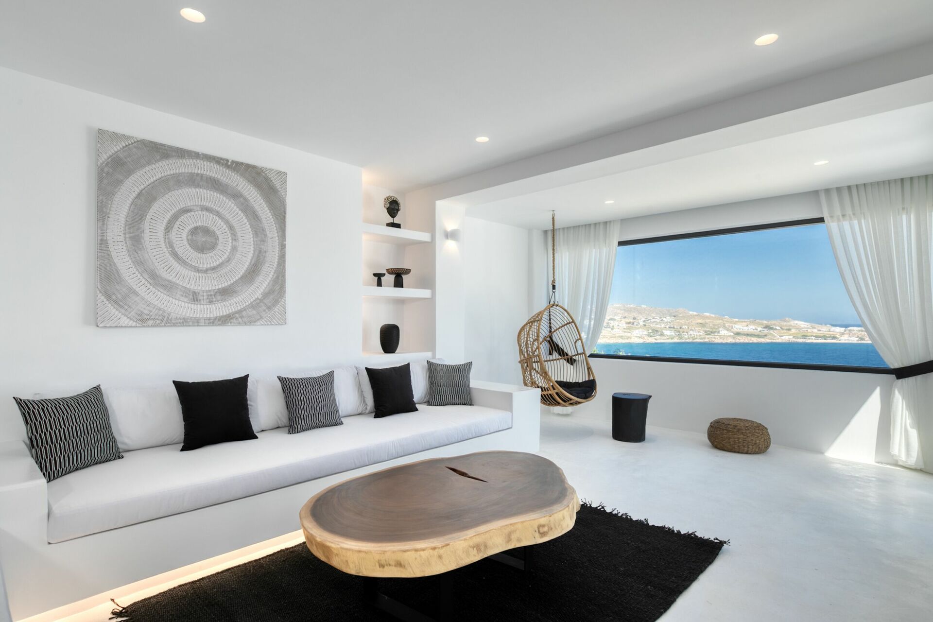 Njut av lyx, stora områden inomhus och utomhus, avskildhet, lugn och ro på Villa Lazaros. Semesterhuset ligger bara 5 km från Mykonos stad.