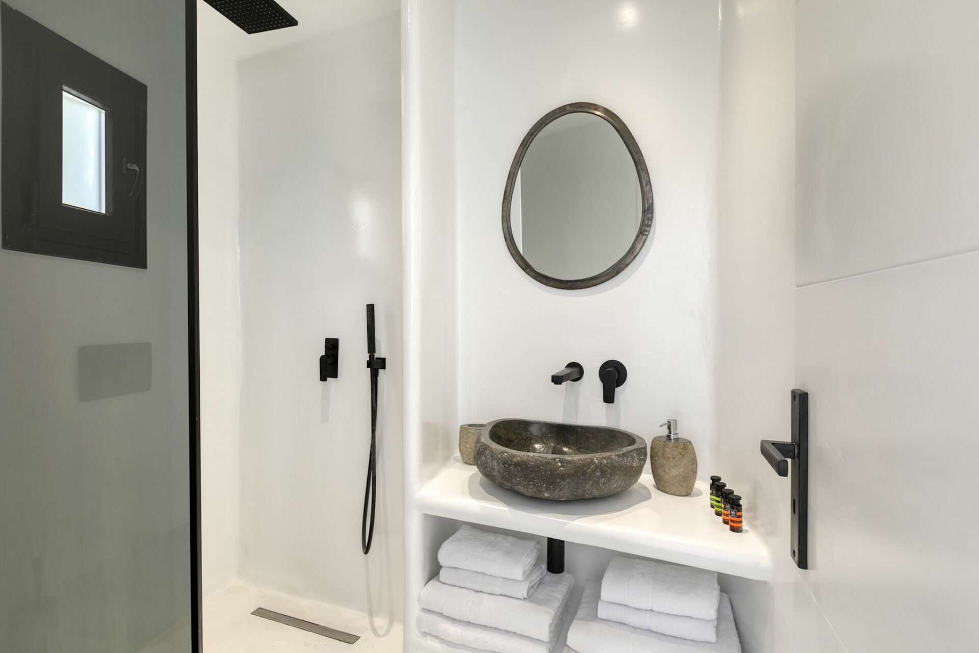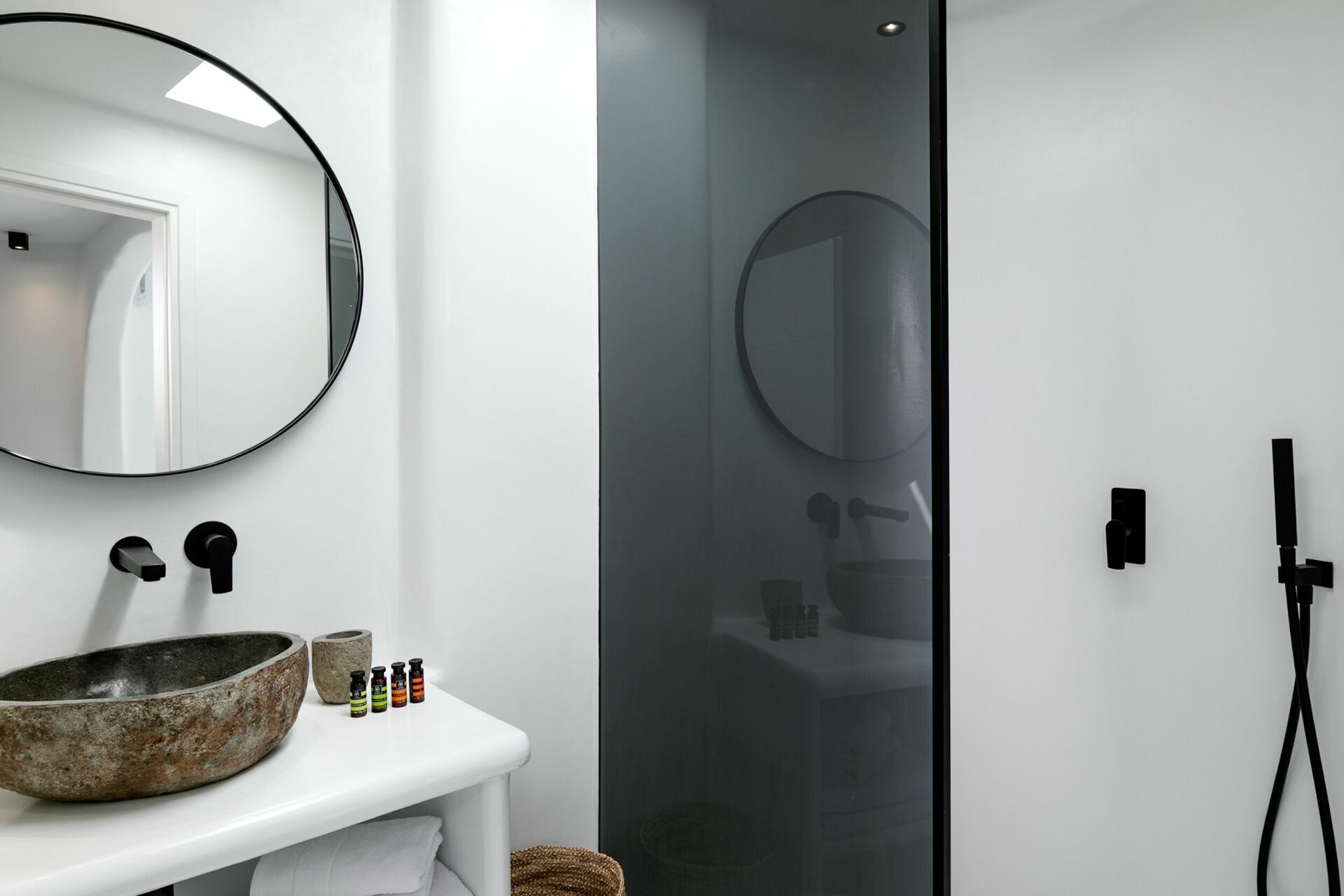 Den berömda stranden Psarou ligger bara 10 minuter bort med bil. Gästerna kan också gå till den fantastiska stranden på bara 3 minuter via en privat stig.