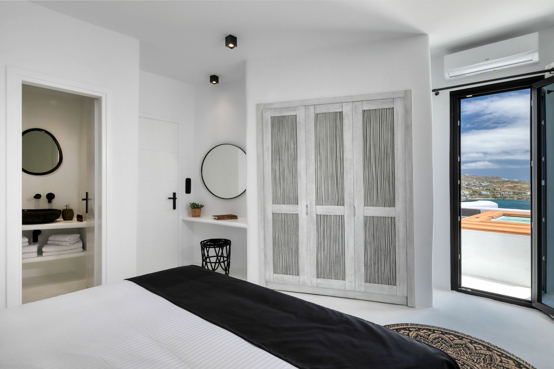 - Sovrum 5: king size-säng, TV, eget badrum med dusch, terrass med havsutsikt och bubbelpool utomhus.