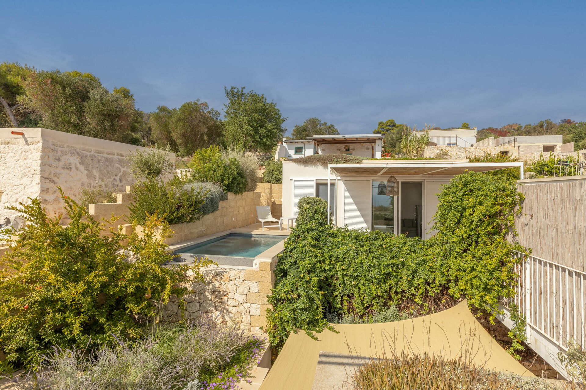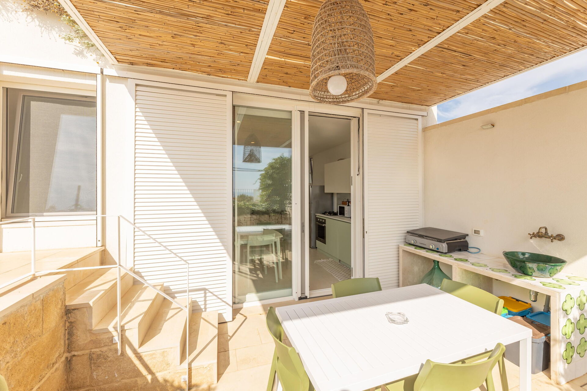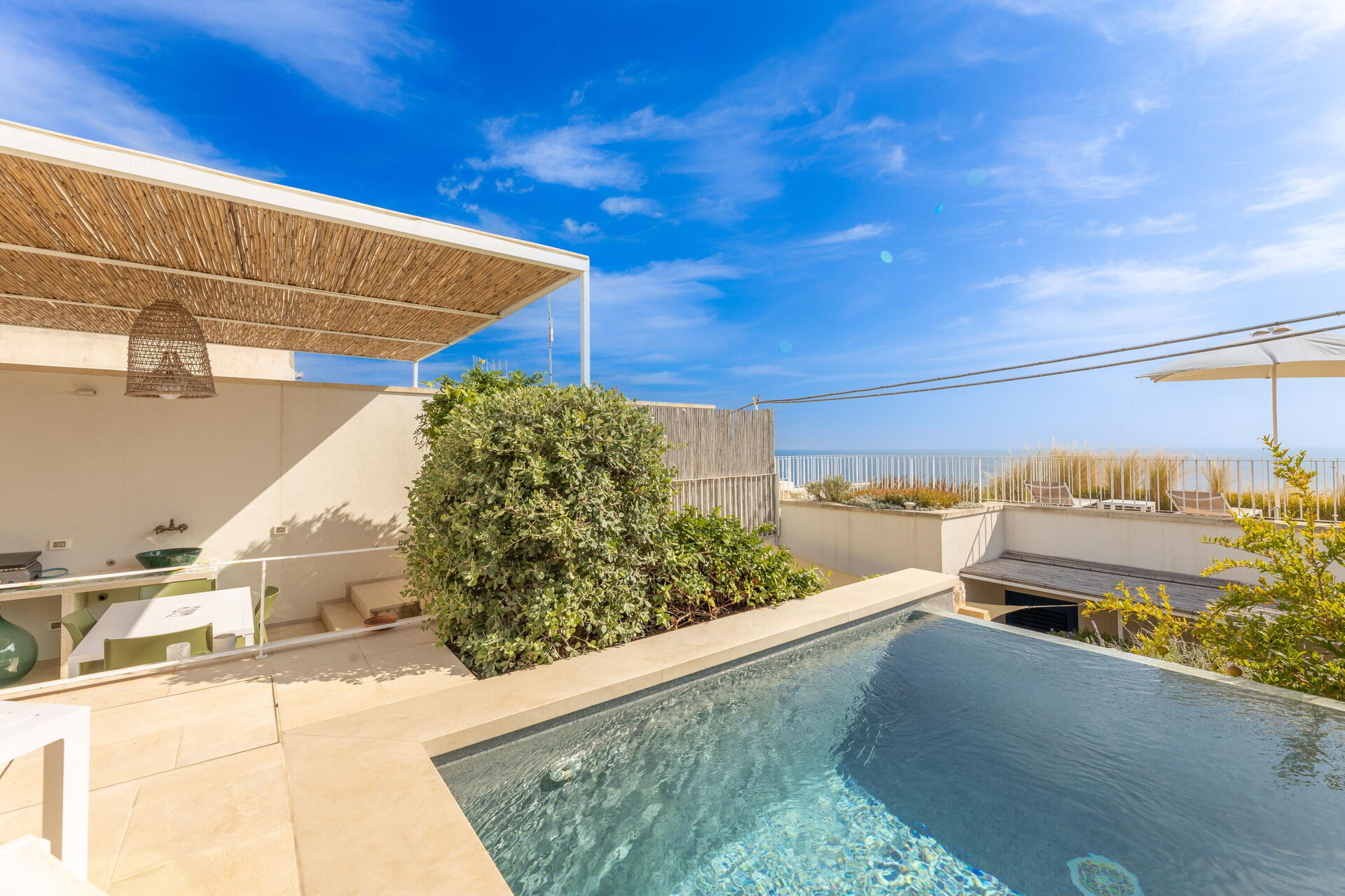 Utanför finns en privat pool som är ett utmärkt alternativ till stranden och perfekt för att svalka sig under soliga italienska dagar. Dessutom finns det en terrass med panoramautsikt över havet och solstolar och parasoller. Ett område med bord och stolar är den perfekta platsen för att äta utomhus och anordna middagar under bar himmel.