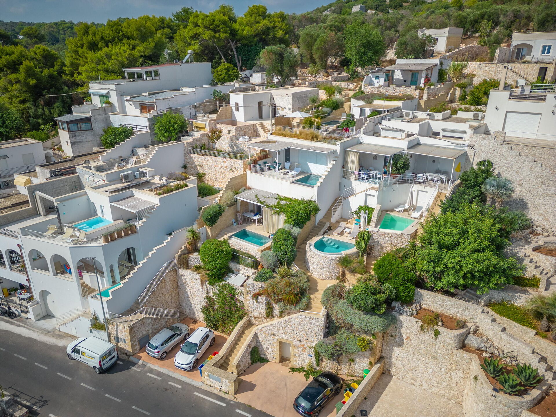 Avstånd: havet (steiner) 70 m, Cala dell'Acquaviva (rullesteinstrand) 500 m, Castro (alle slags butikker) 1,4 km, Marittima 2 km, Andrano (steinstrand og Grotta Verde) 4 km, Porto Miggiano ("Spiaggia dei cento Scalini" steiner og sand) 8 km, Otranto 22 km, Baia dei Turchi (sandstrand) 27 km, Santa Maria di Leuca 28 km, Marina di Pescoluse (Maldivene i Salento) 29 km, Gallipoli 47 km, Lecce 49 km, Lecce flygplats 58 km