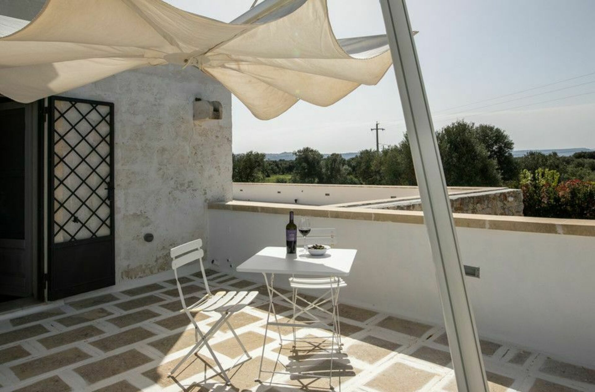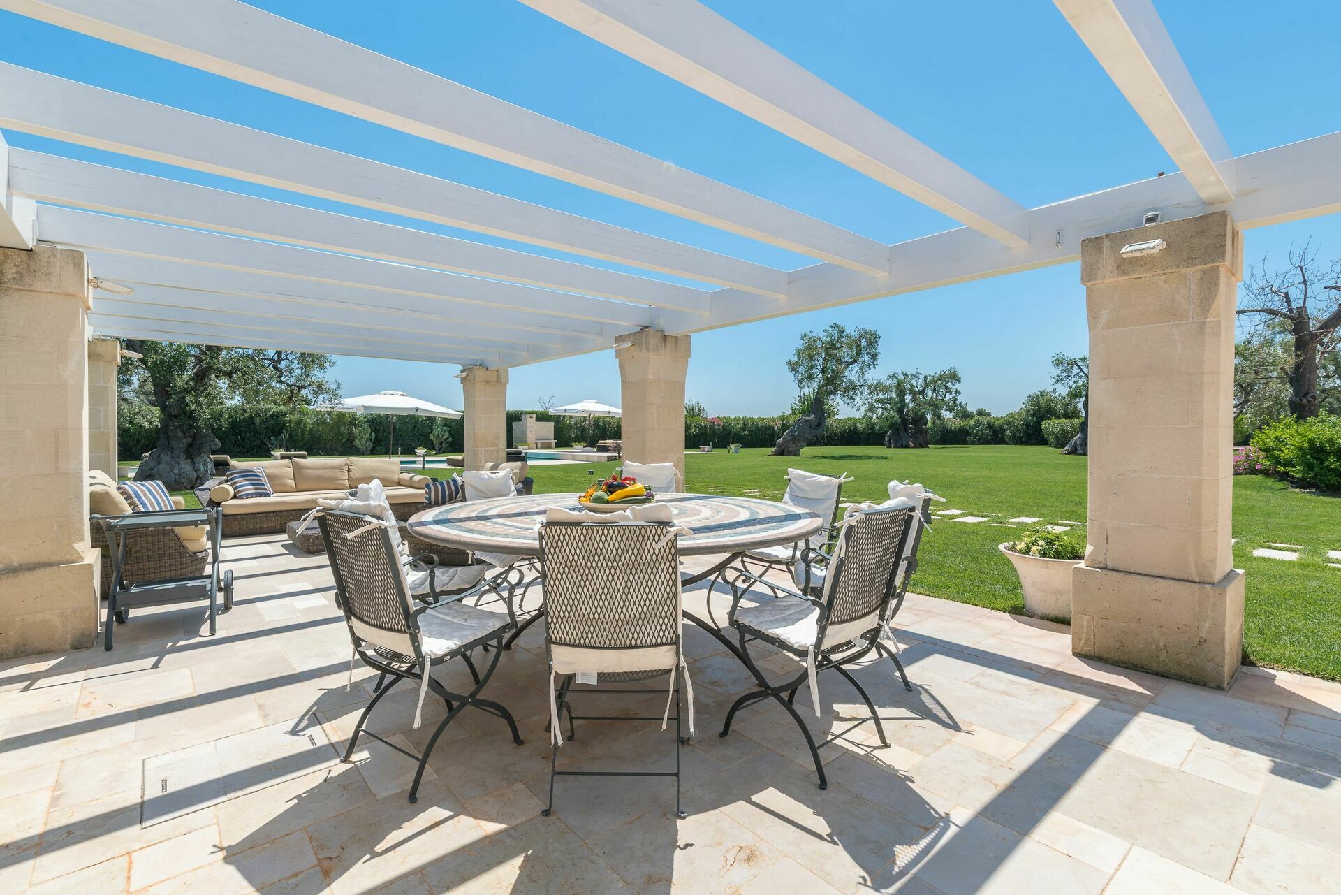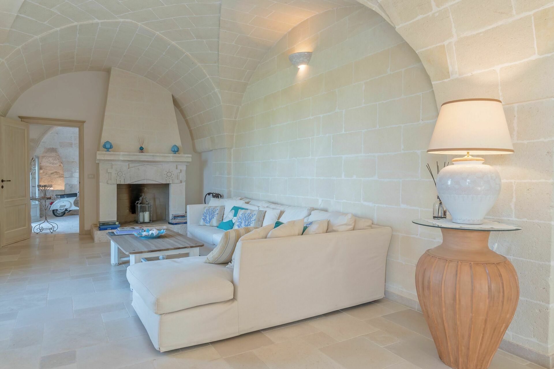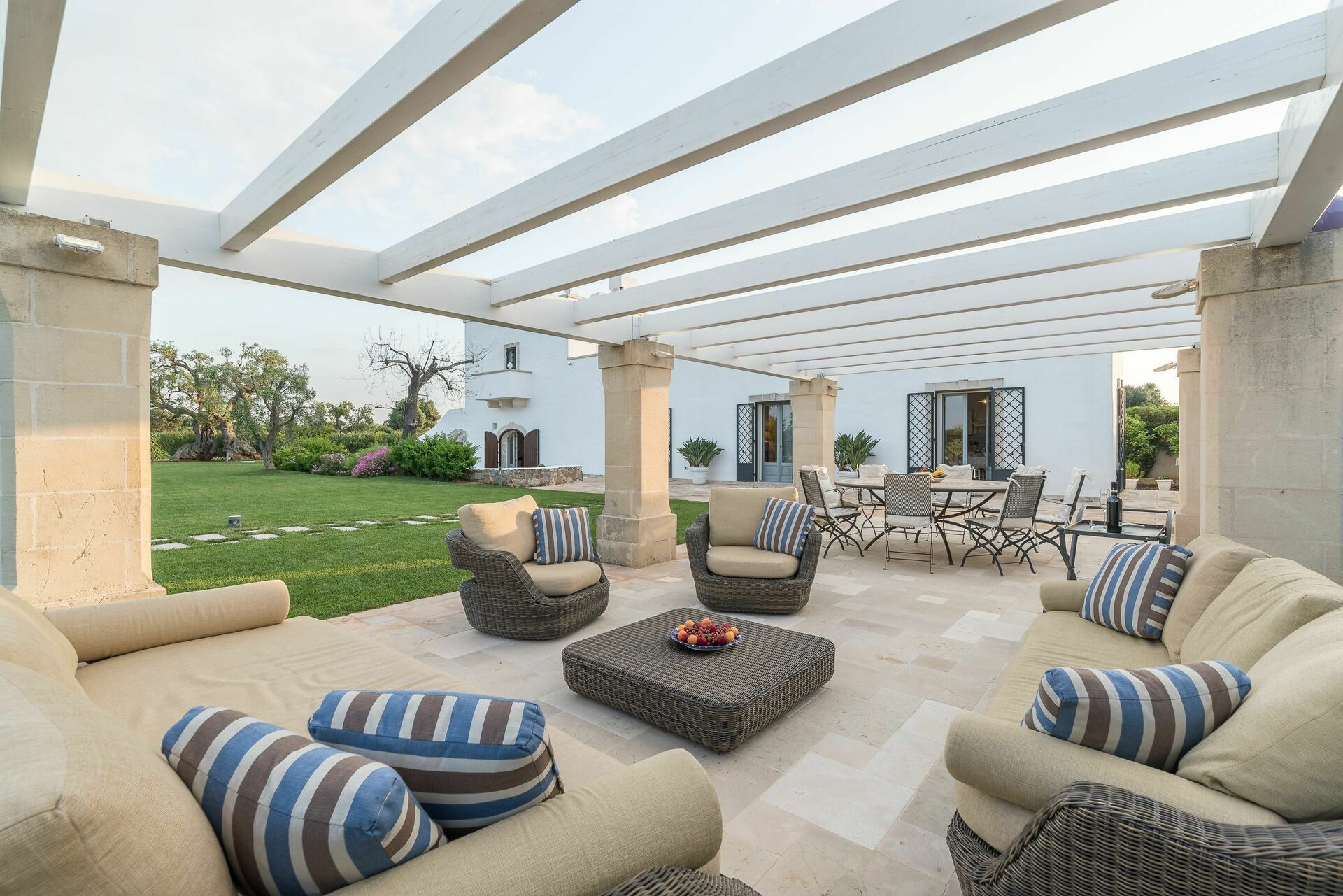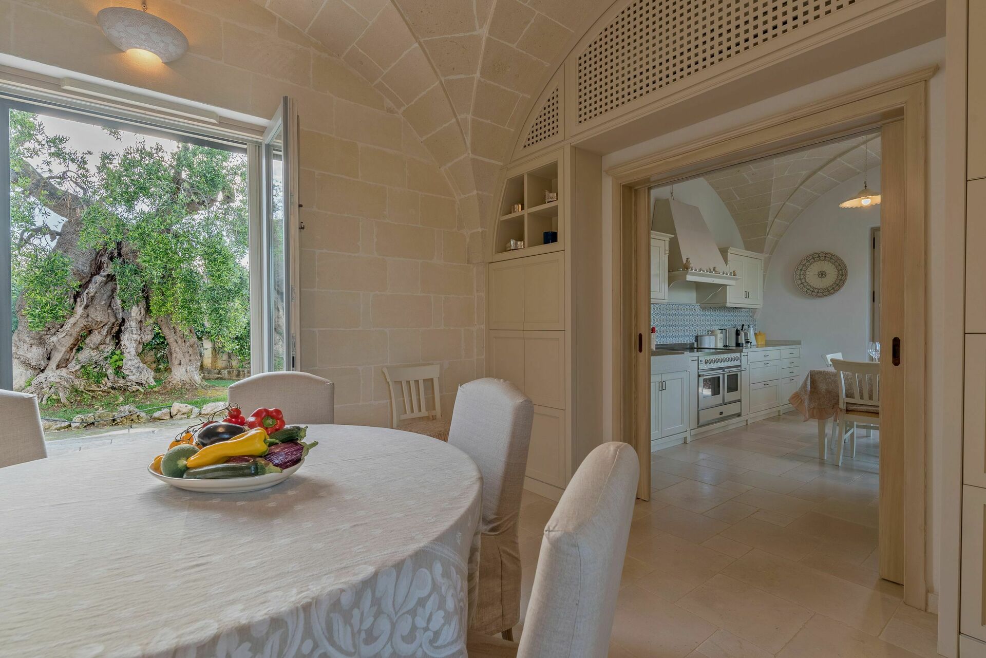 Den nyligen renoverade Masseria Villa Il Frantoio kombinerar elegant den apuliska traditionen med modern och funktionell stil. Det finns inslag av traditionell Salento-arkitektur genomgående, som välvda tak och stora tegelbågar som skiljer de olika rummen åt. Det finns tre dubbelrum med eget badrum på bottenvåningen och den yttre trappan leder till det fjärde sovrummet, med tillgång till den privata terrassen med fantastisk utsikt.