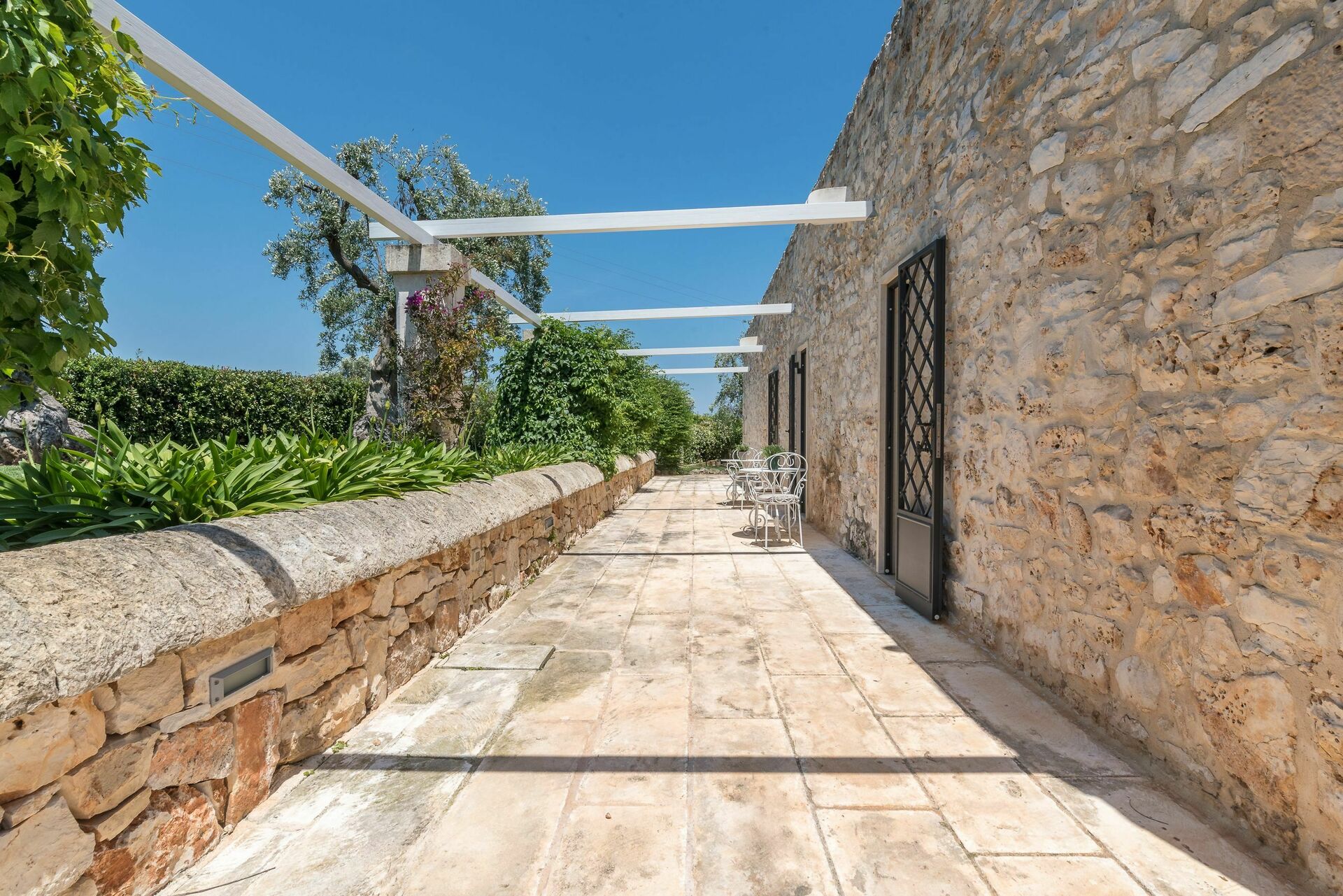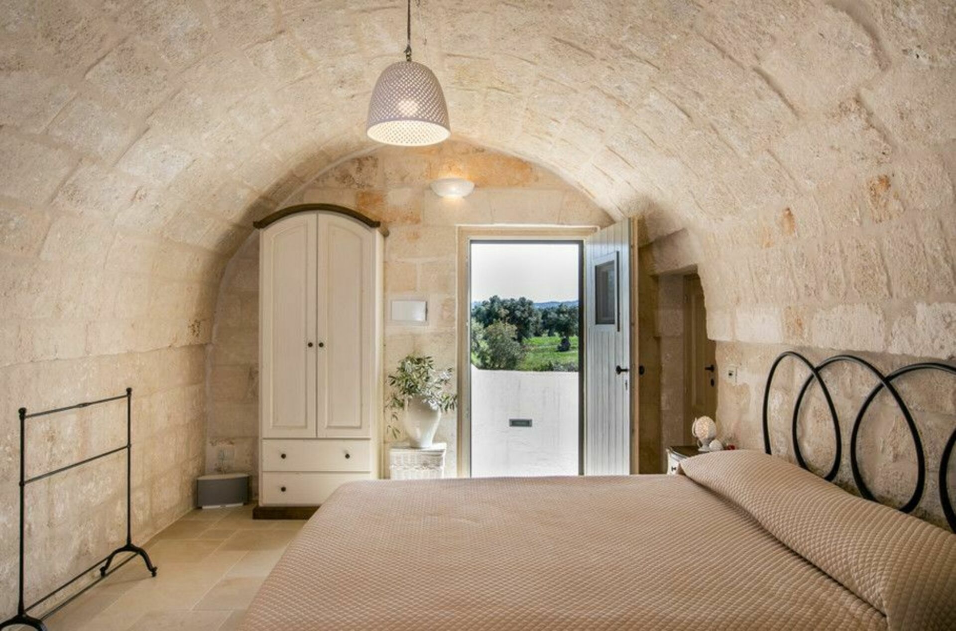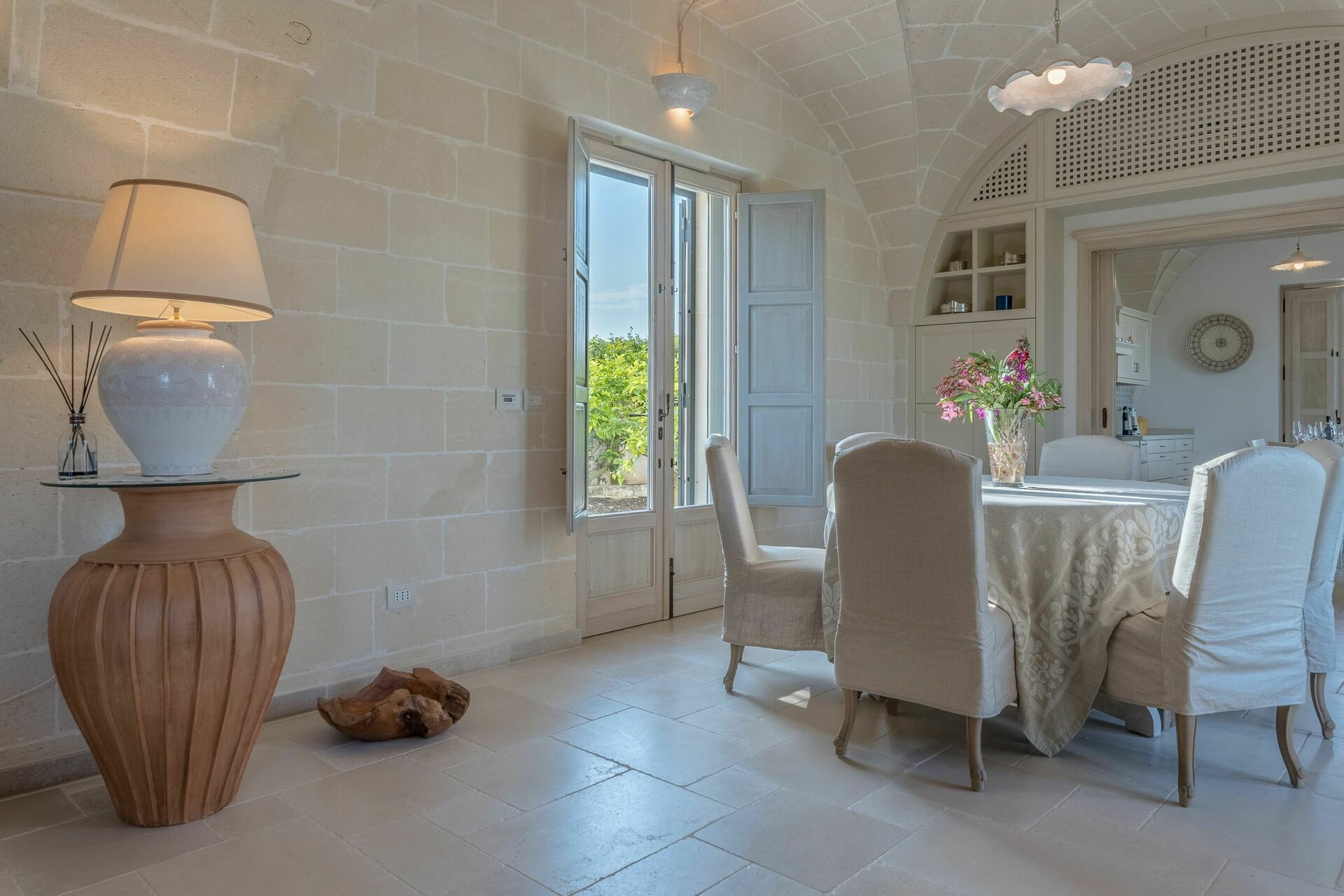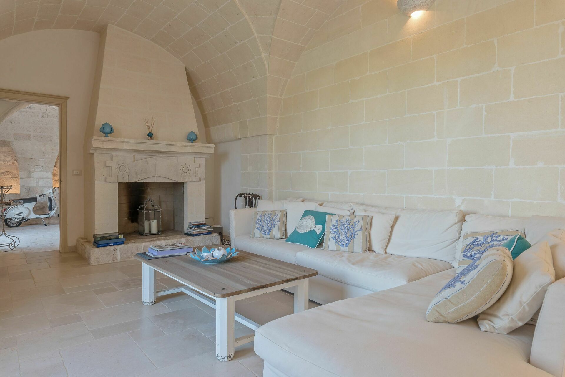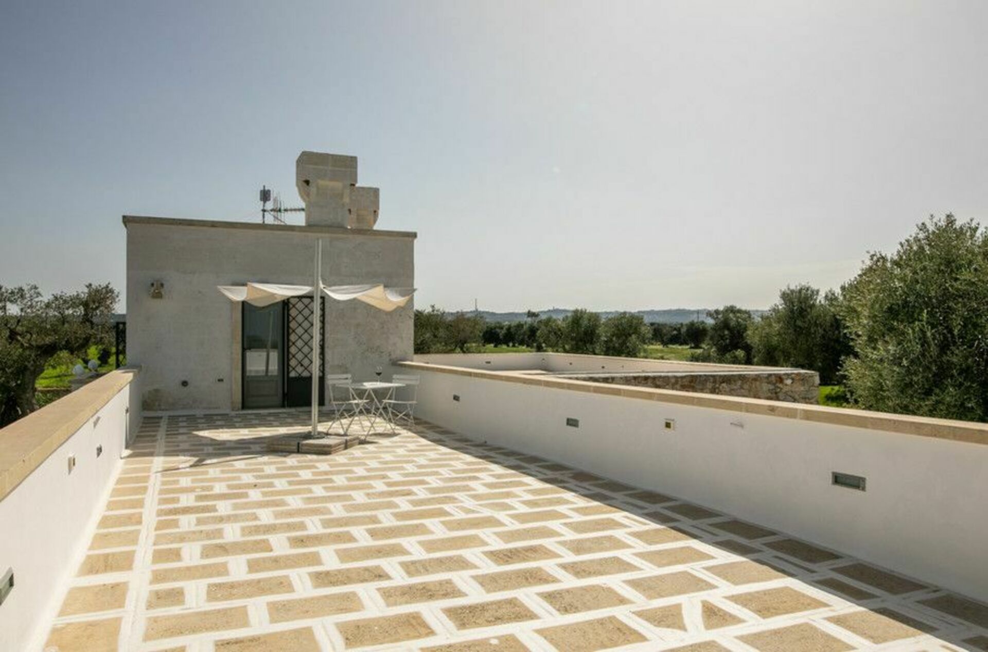 Den nyligen renoverade Masseria Villa Il Frantoio kombinerar elegant den apuliska traditionen med modern och funktionell stil. Det finns inslag av traditionell Salento-arkitektur genomgående, som välvda tak och stora tegelbågar som skiljer de olika rummen åt. Det finns tre dubbelrum med eget badrum på bottenvåningen och den yttre trappan leder till det fjärde sovrummet, med tillgång till den privata terrassen med fantastisk utsikt.