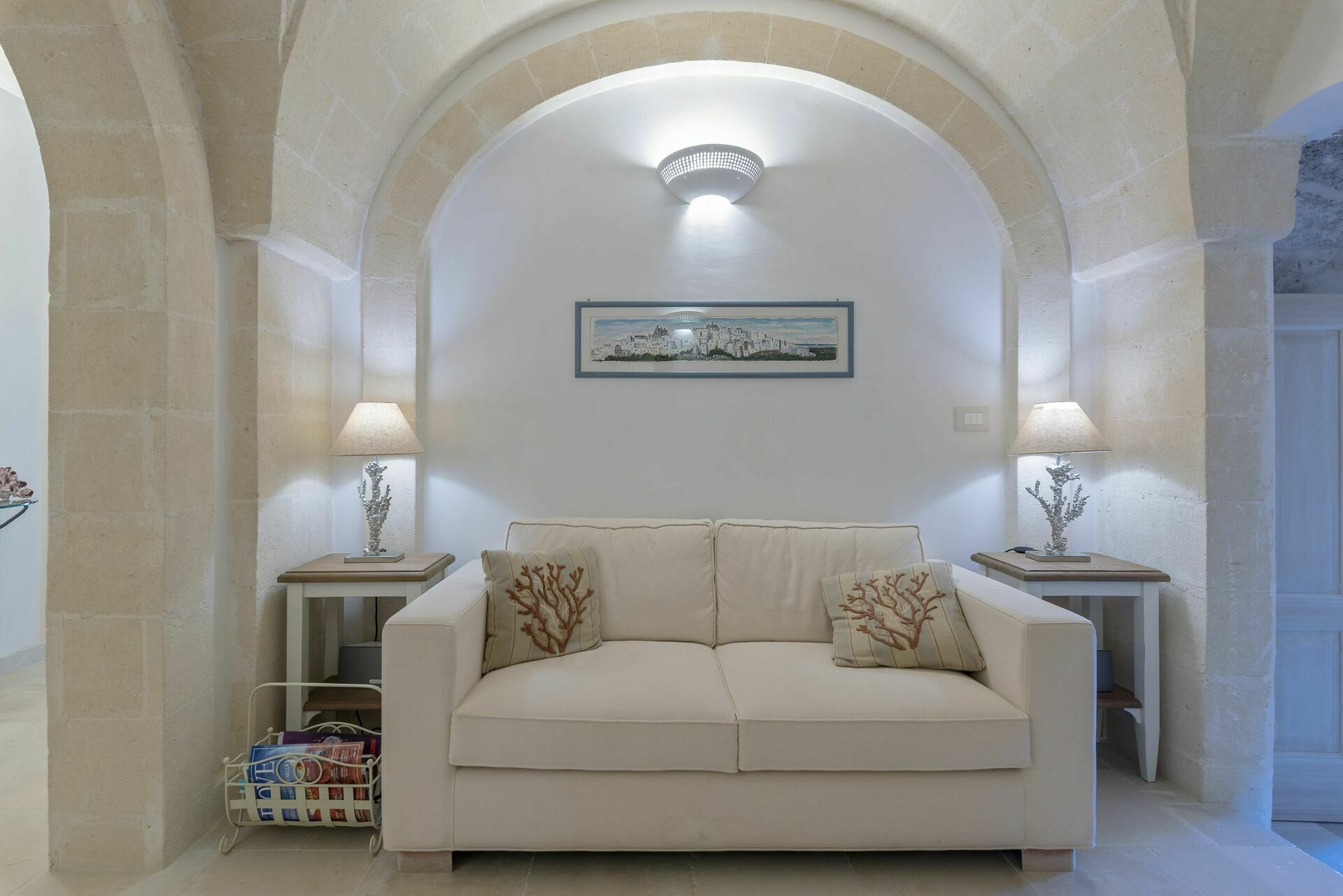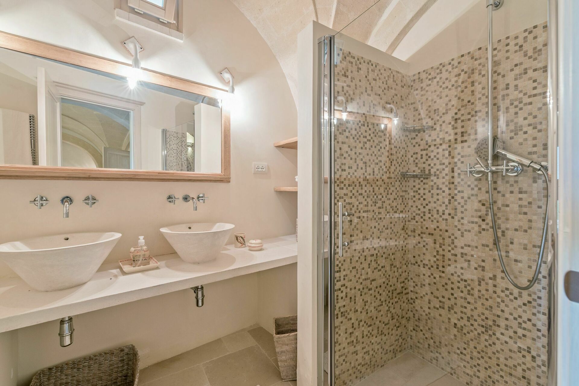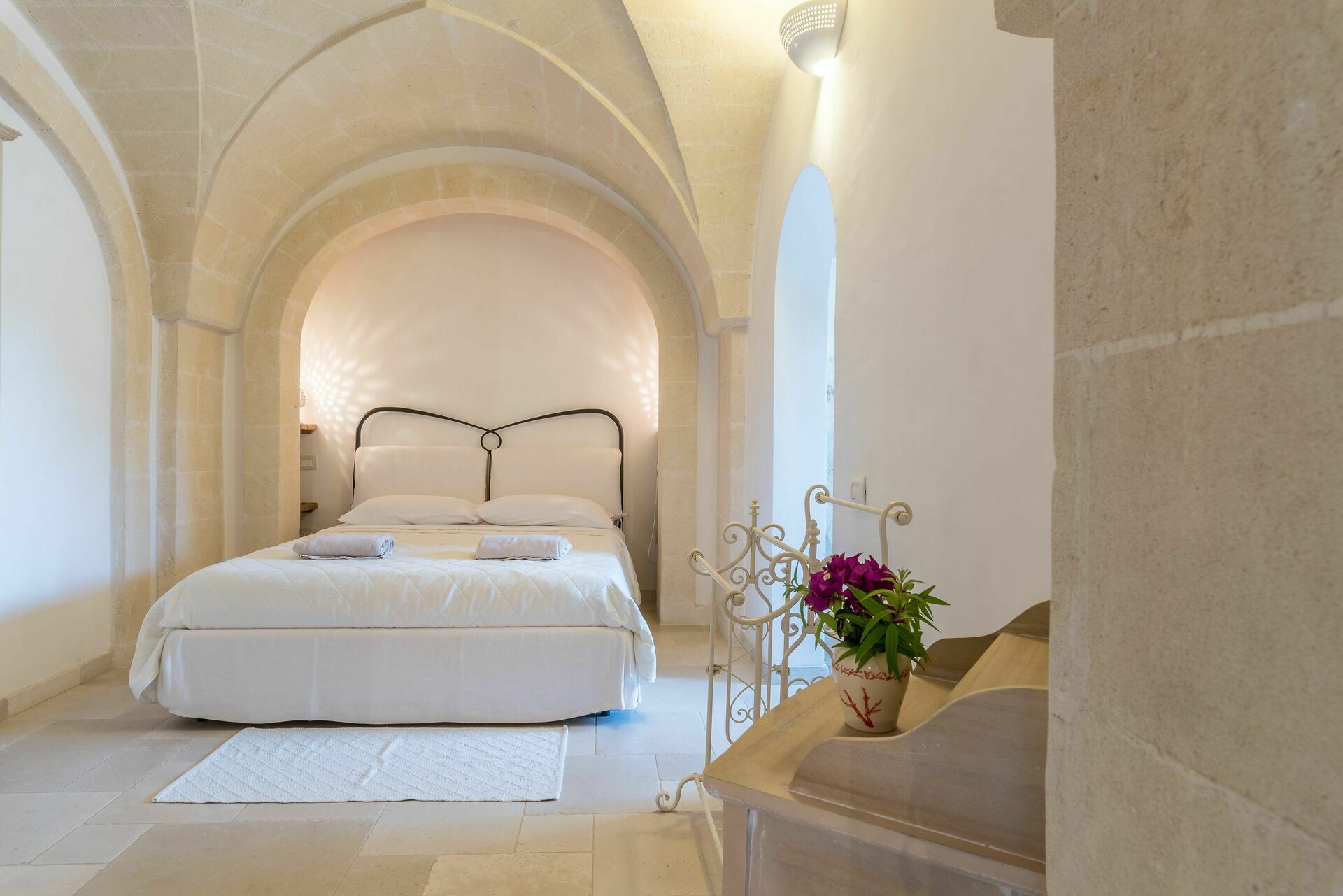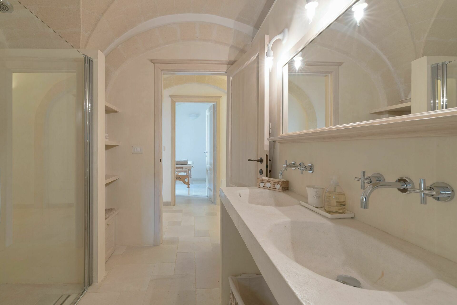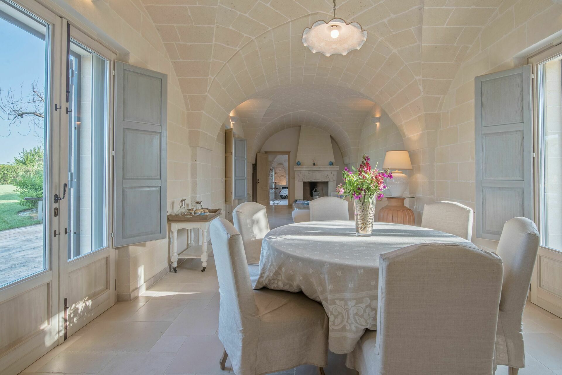 Den nyligen renoverade Masseria Villa Il Frantoio kombinerar elegant den apuliska traditionen med modern och funktionell stil. Det finns inslag av traditionell Salento-arkitektur genomgående, som välvda tak och stora tegelbågar som skiljer de olika rummen åt. Det finns tre dubbelrum med eget badrum på bottenvåningen och den yttre trappan leder till det fjärde sovrummet, med tillgång till den privata terrassen med fantastisk utsikt.