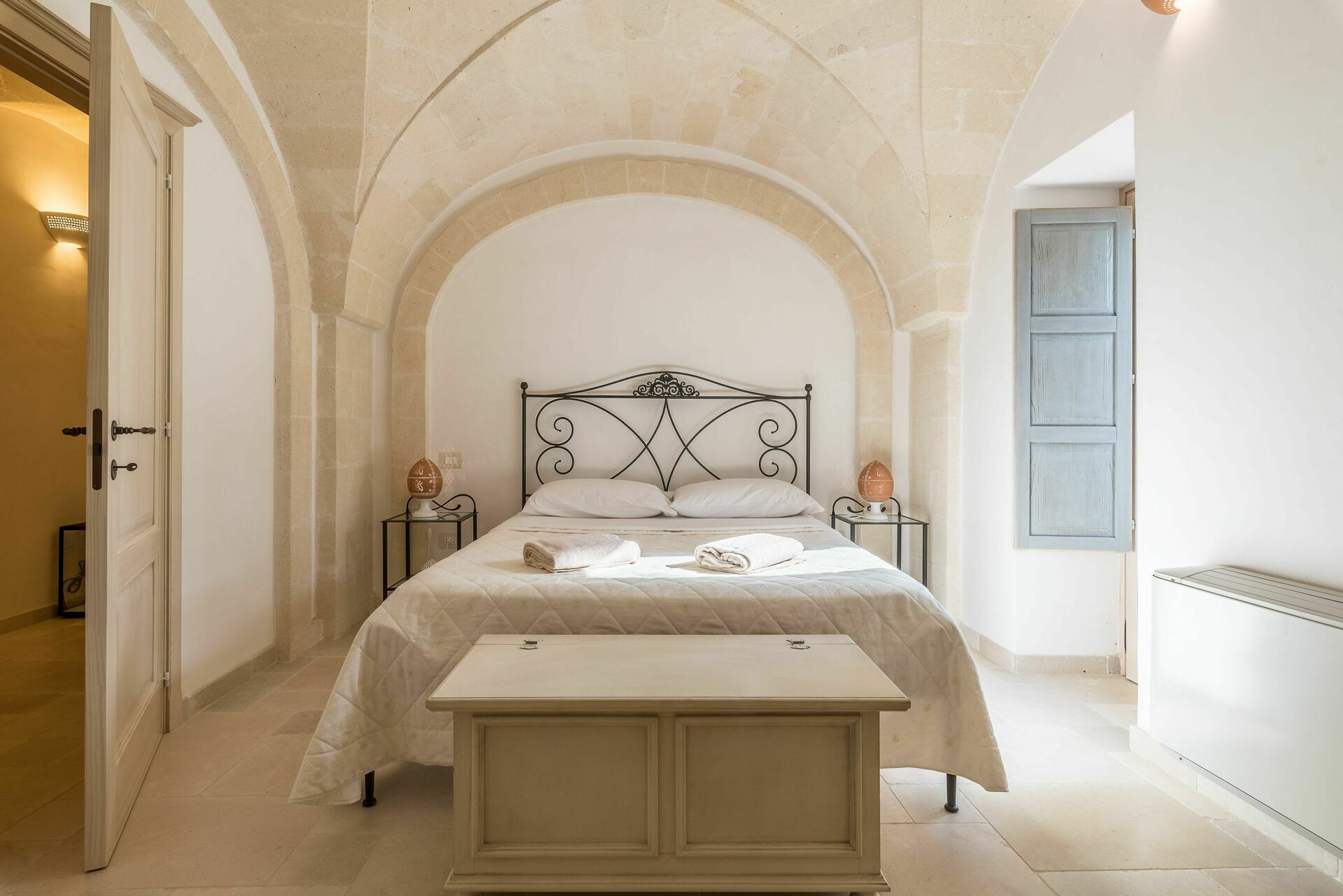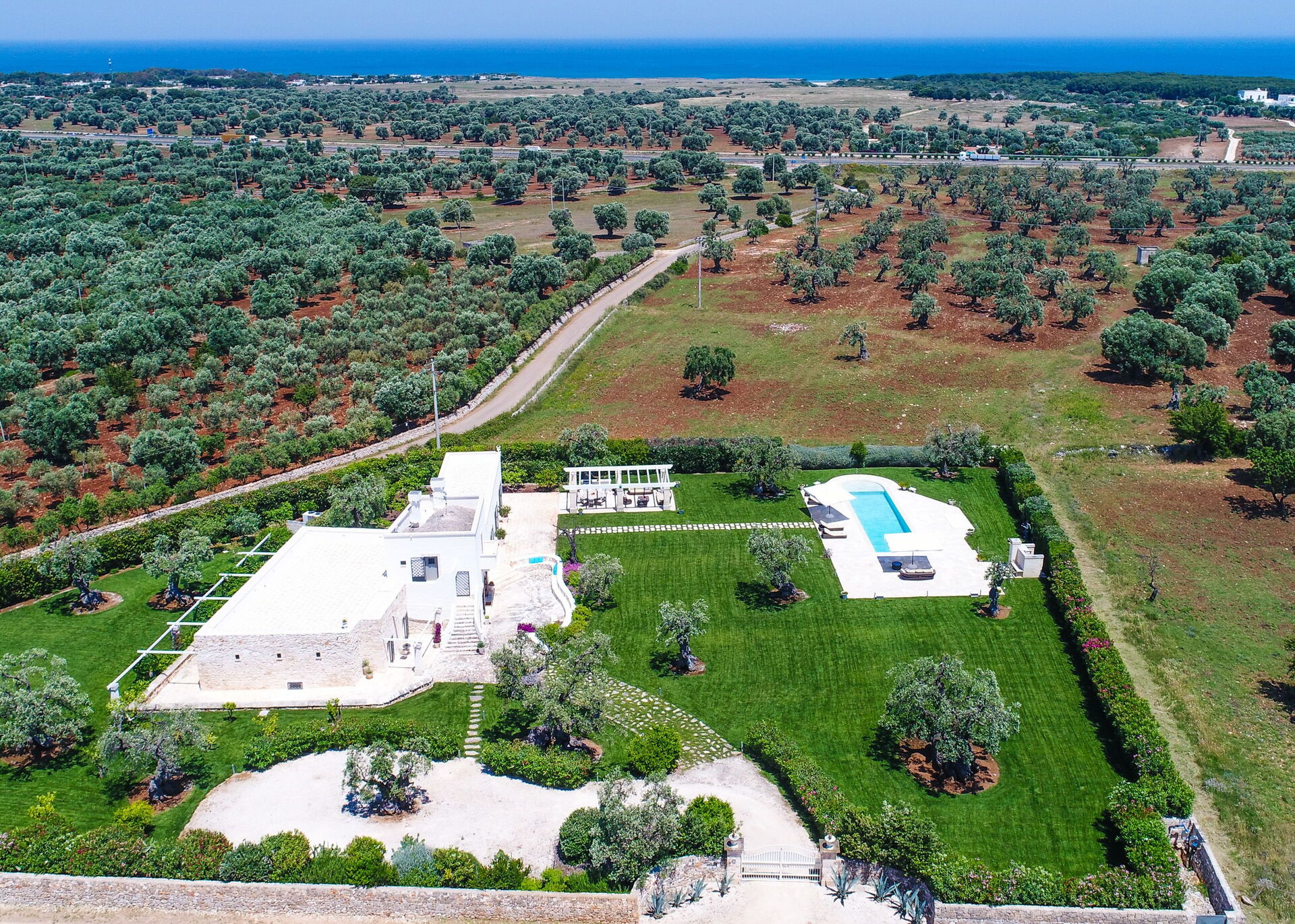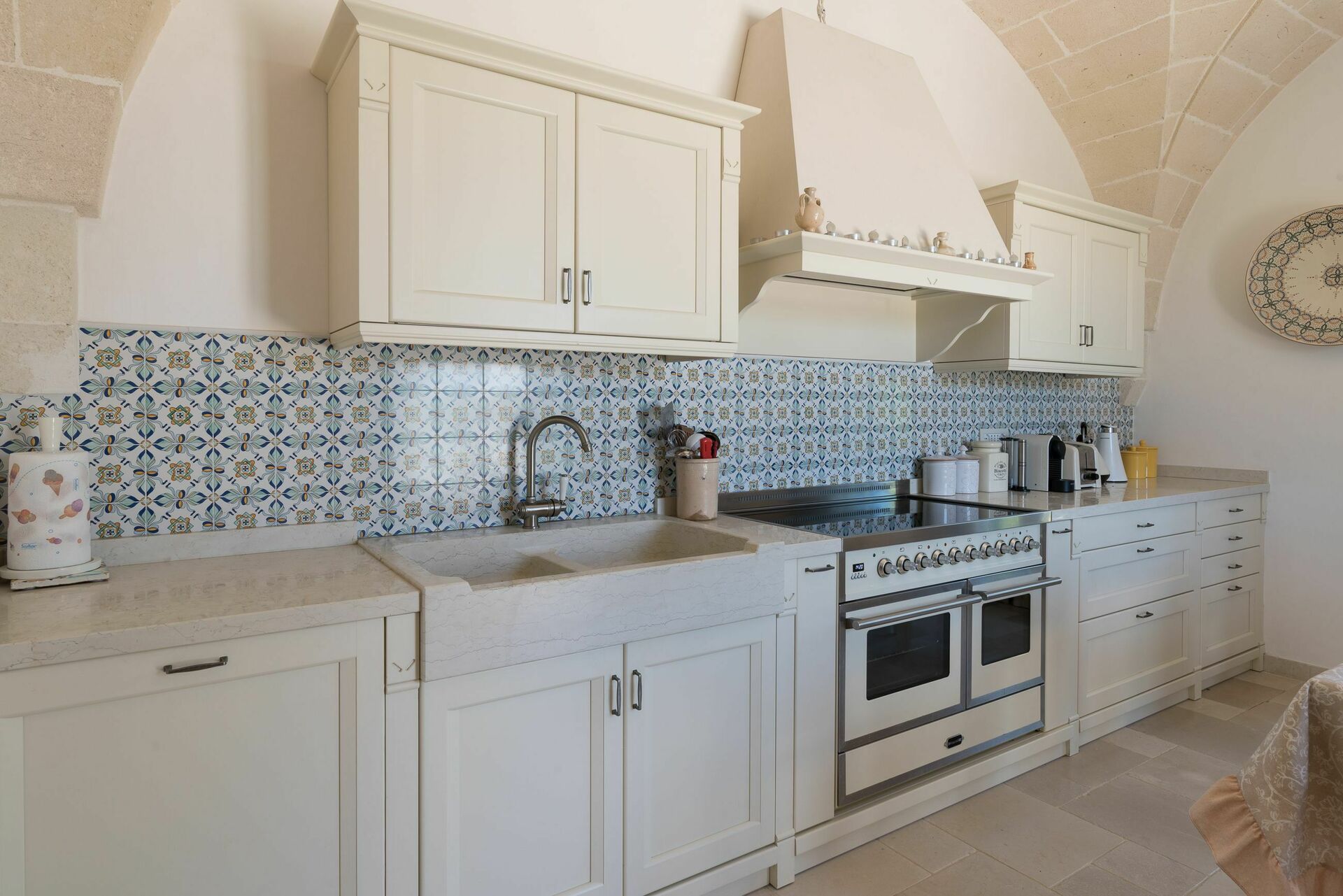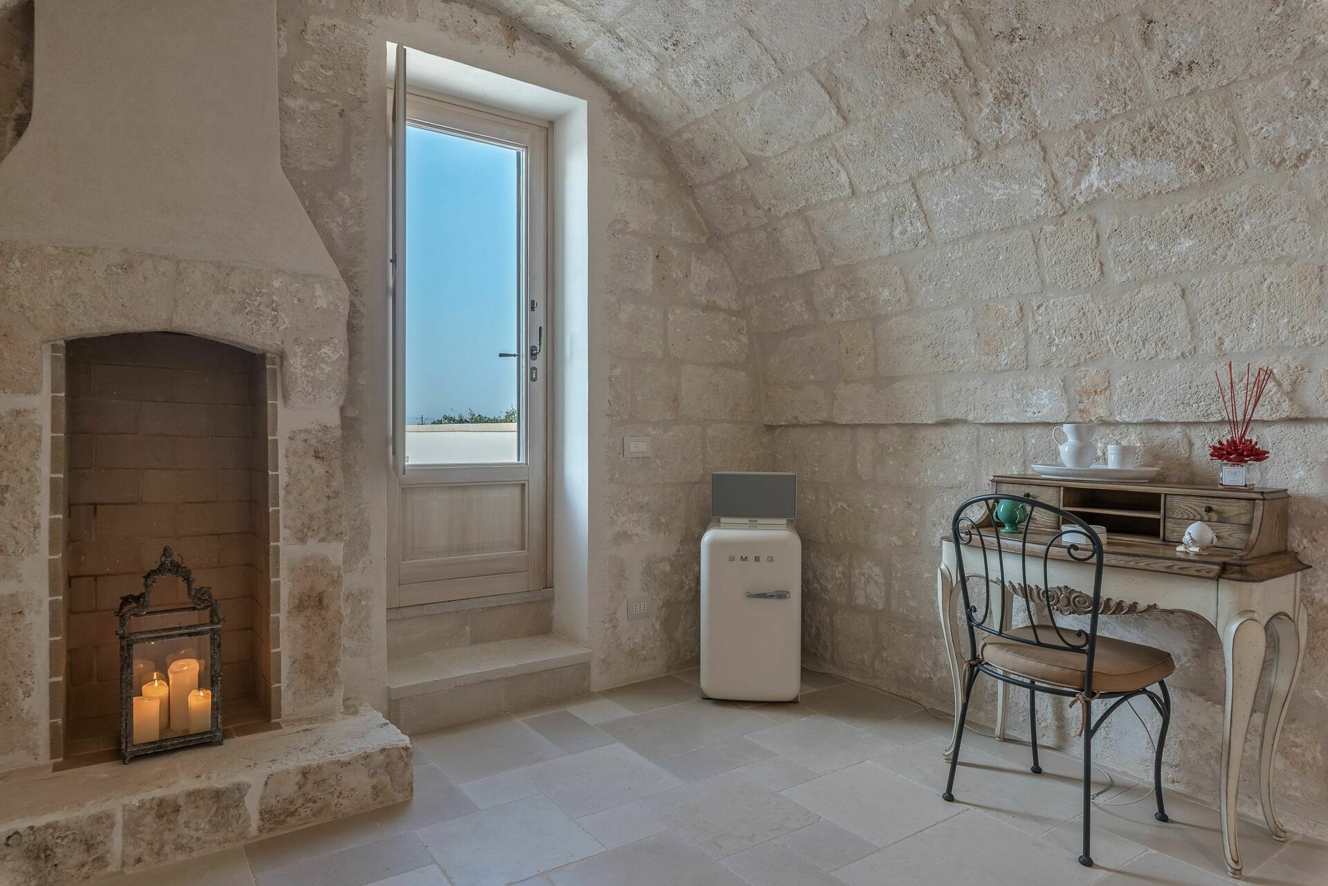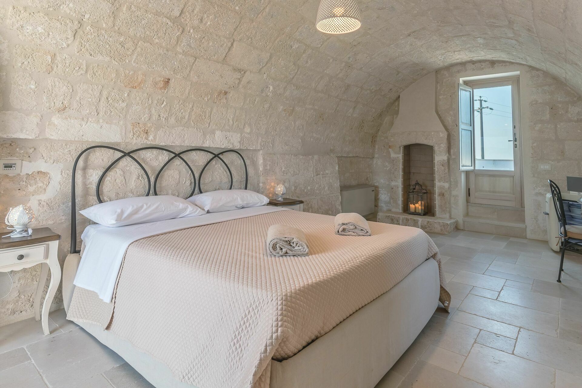 Den nyligen renoverade Masseria Villa Il Frantoio kombinerar elegant den apuliska traditionen med modern och funktionell stil. Det finns inslag av traditionell Salento-arkitektur genomgående, som välvda tak och stora tegelbågar som skiljer de olika rummen åt. Det finns tre dubbelrum med eget badrum på bottenvåningen och den yttre trappan leder till det fjärde sovrummet, med tillgång till den privata terrassen med fantastisk utsikt.