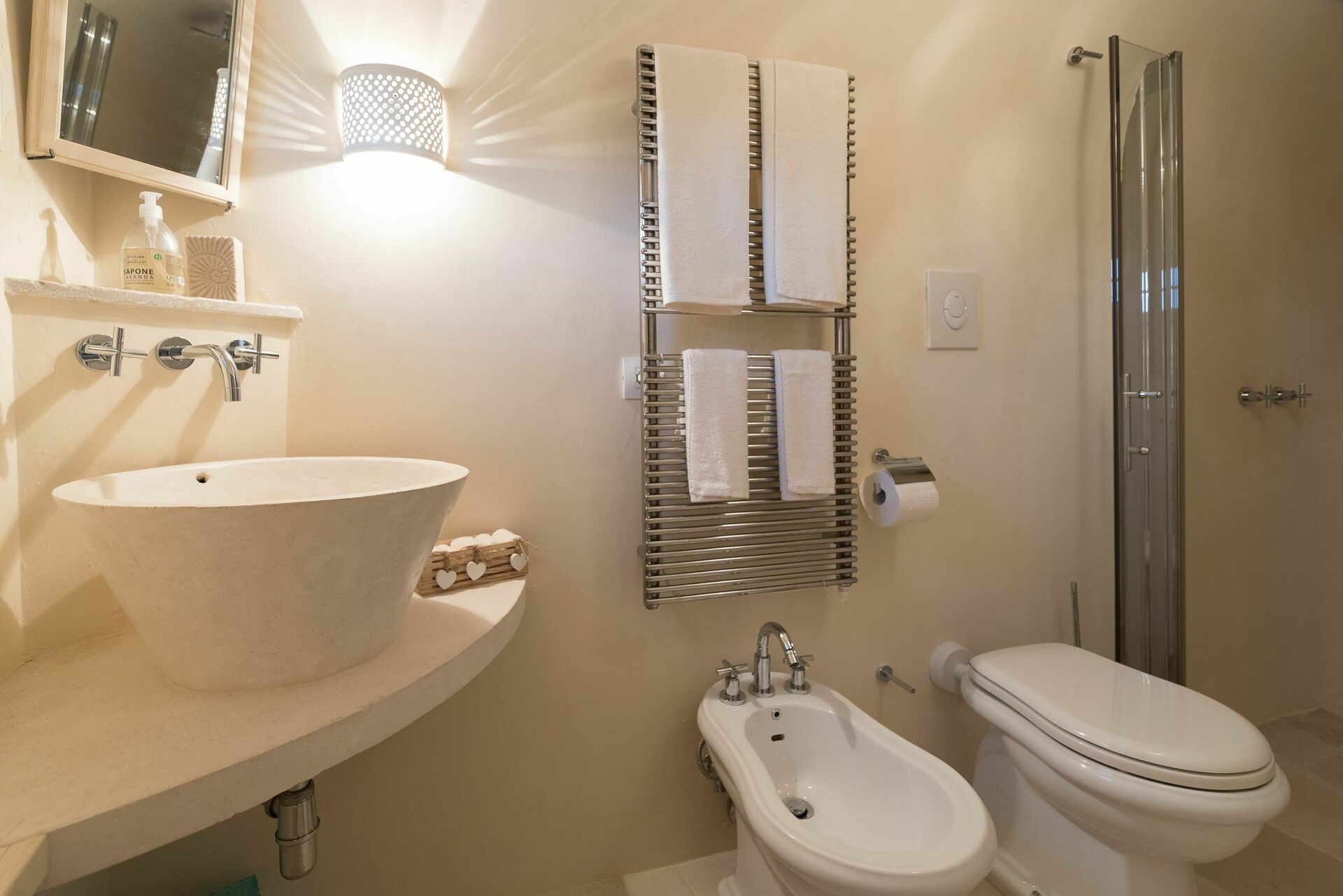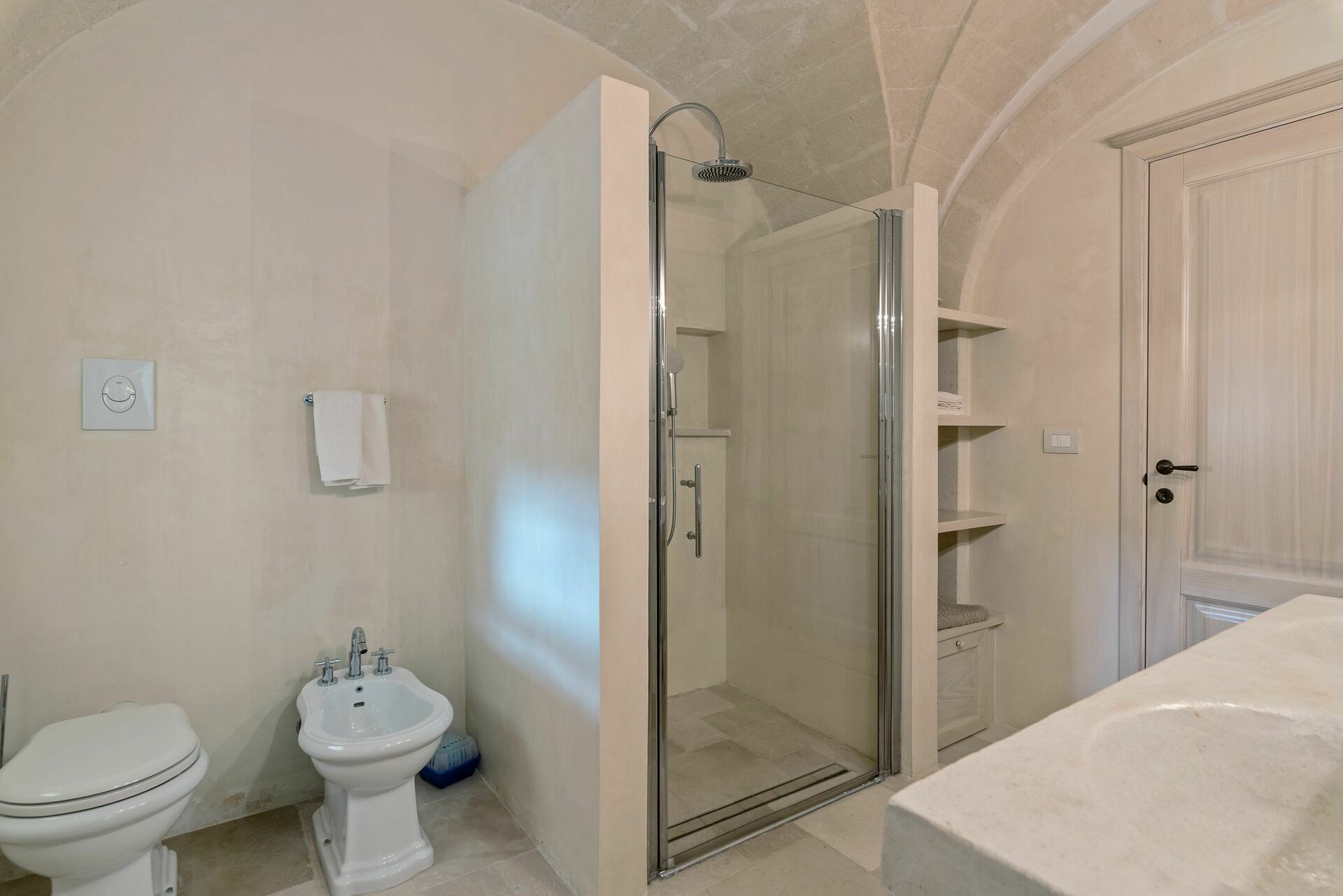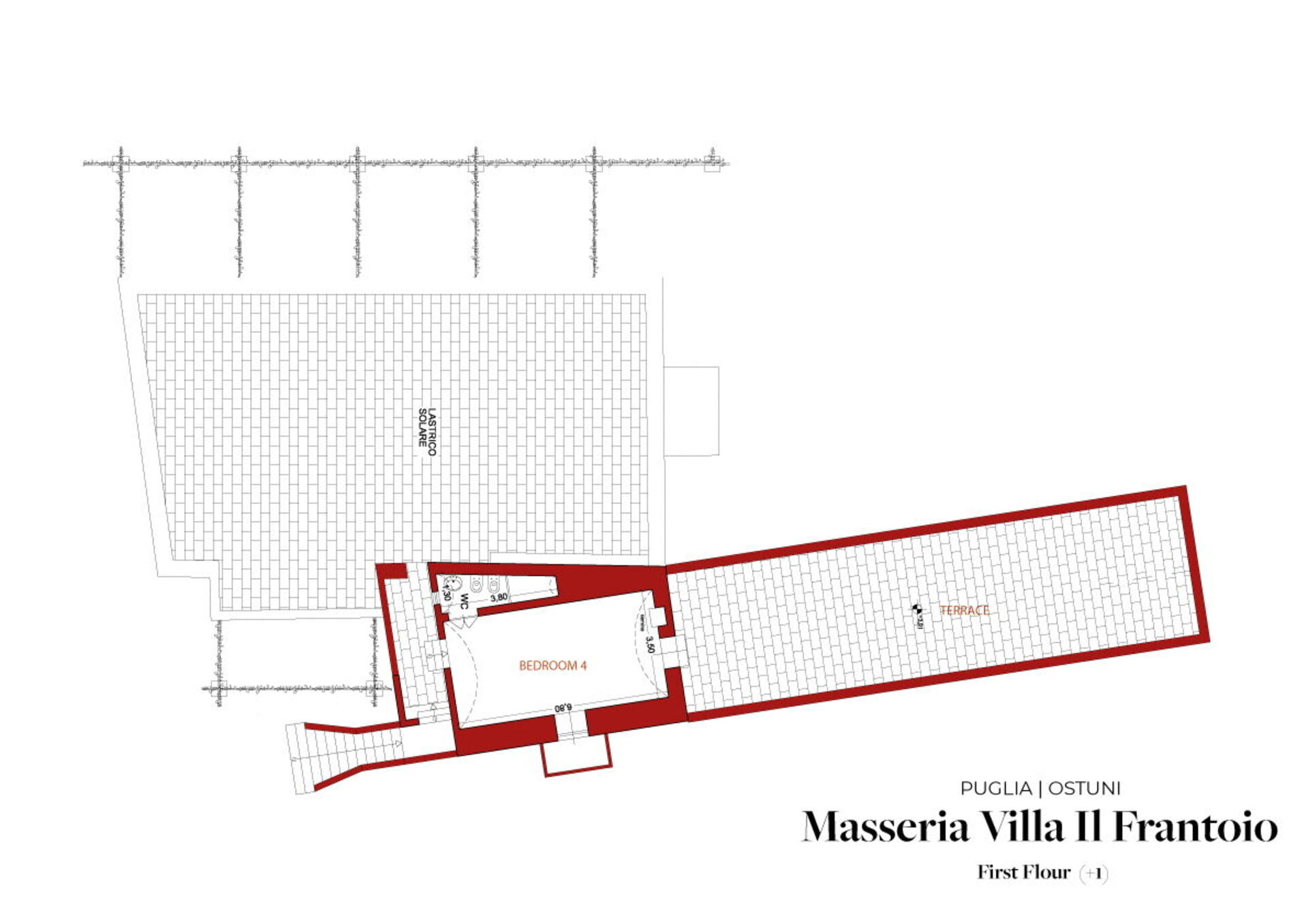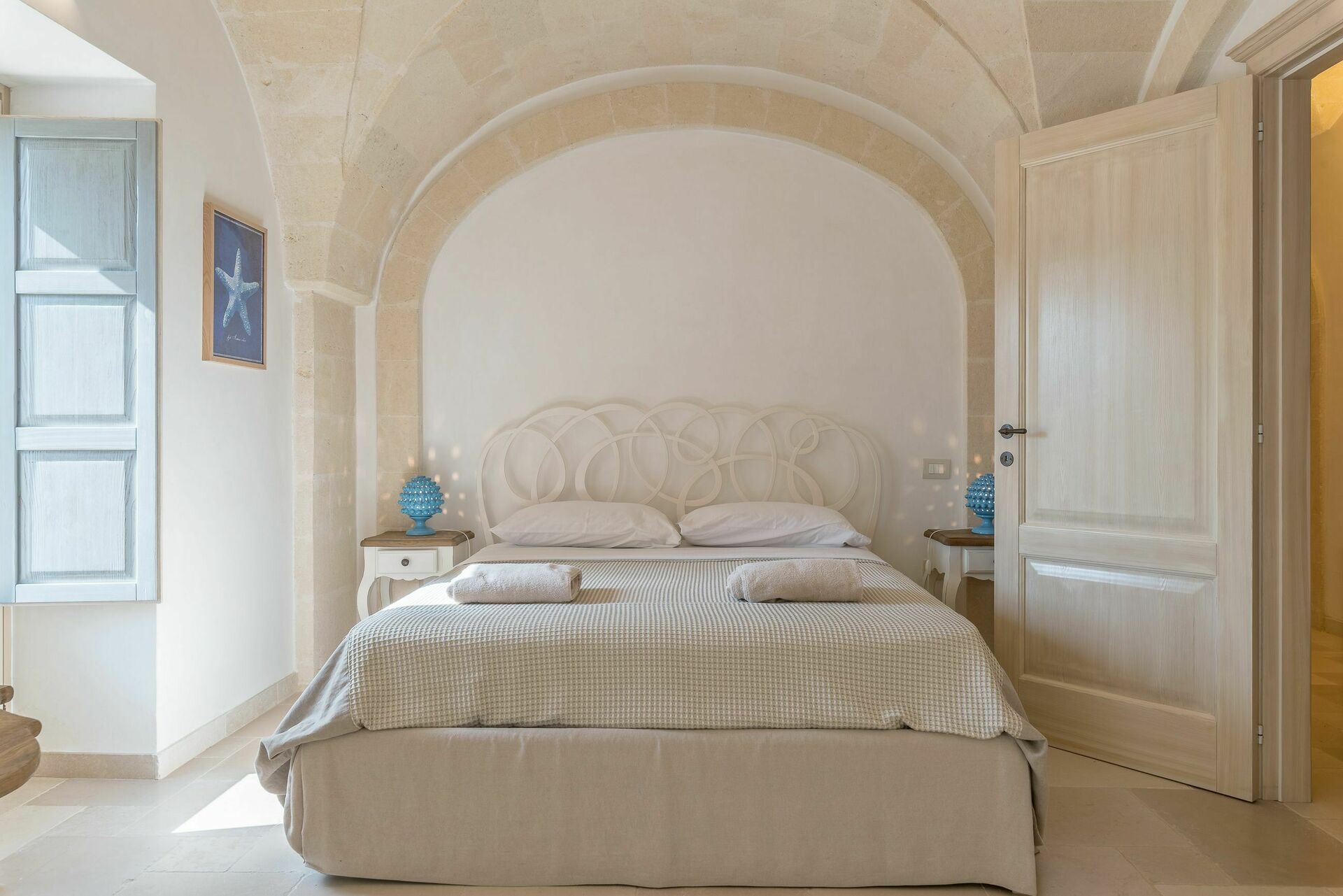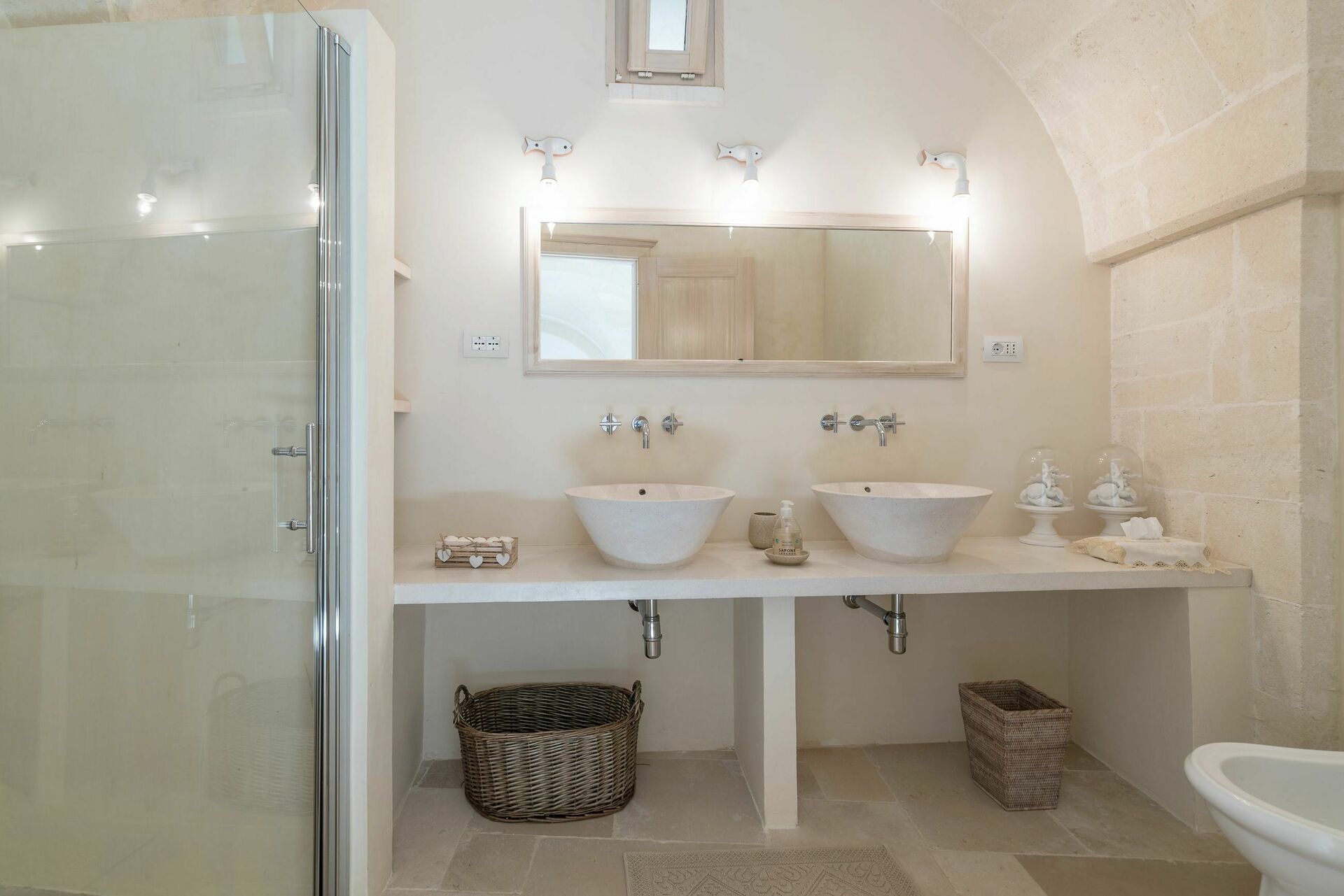 Den nyligen renoverade Masseria Villa Il Frantoio kombinerar elegant den apuliska traditionen med modern och funktionell stil. Det finns inslag av traditionell Salento-arkitektur genomgående, som välvda tak och stora tegelbågar som skiljer de olika rummen åt. Det finns tre dubbelrum med eget badrum på bottenvåningen och den yttre trappan leder till det fjärde sovrummet, med tillgång till den privata terrassen med fantastisk utsikt.