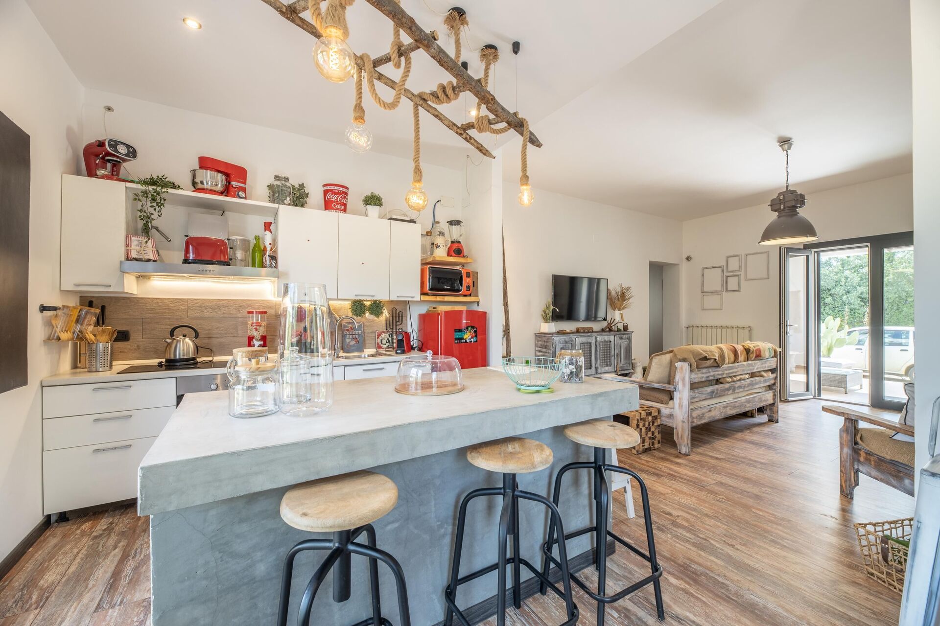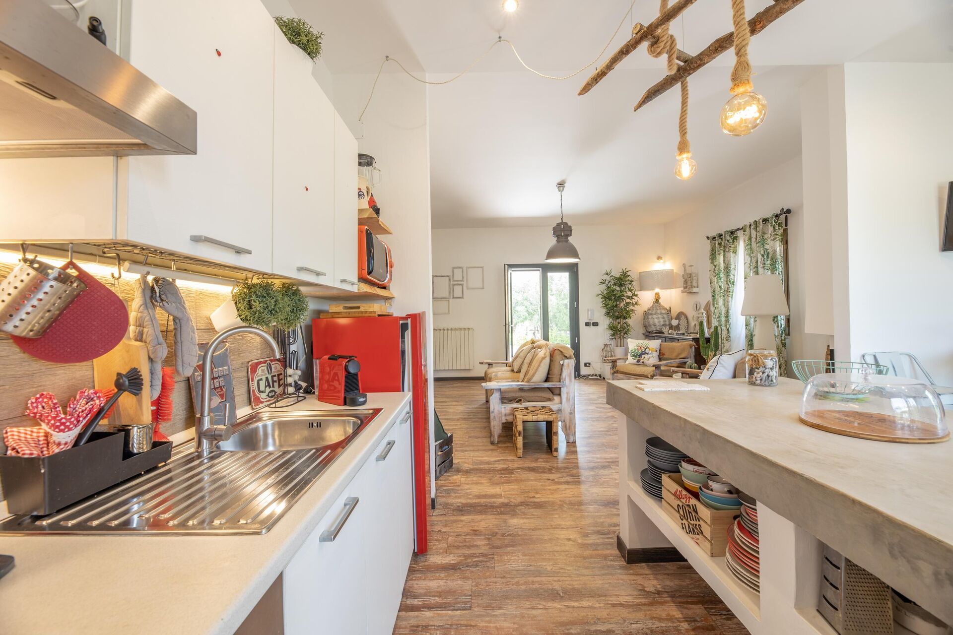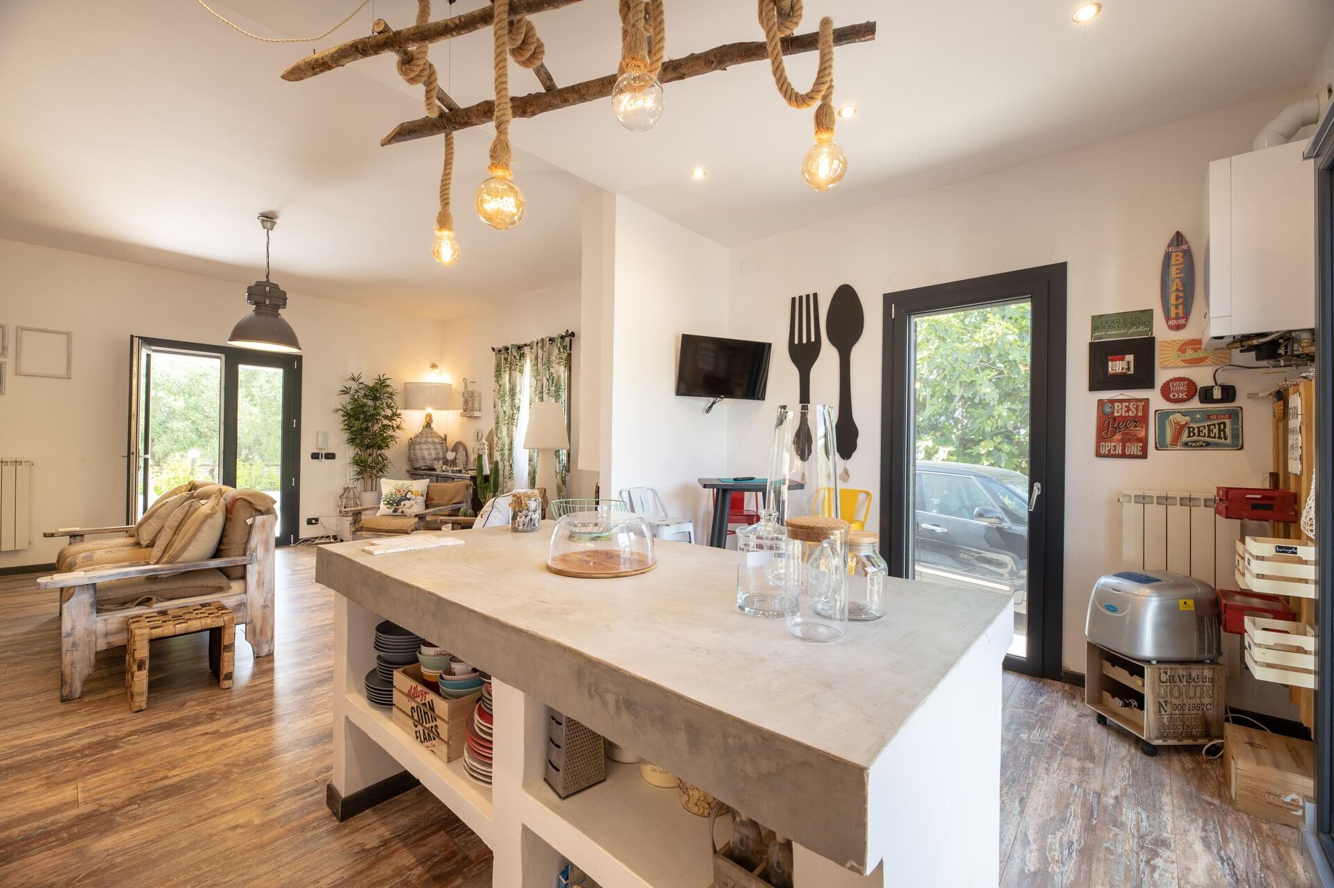 Ingång från verandaen, 3 seters soffa och 2 loungestolar i stor vardagsrum, öppen kökslösning med köksö (ovn, kylare, inredning, uppvaskmaskin); badrum med dusch; 1 dubbelrum; 1 sovrum med 2 enkelsängar; 1 sovrum med enkelsäng och möjlighet att lägga till en enkelsäng till.