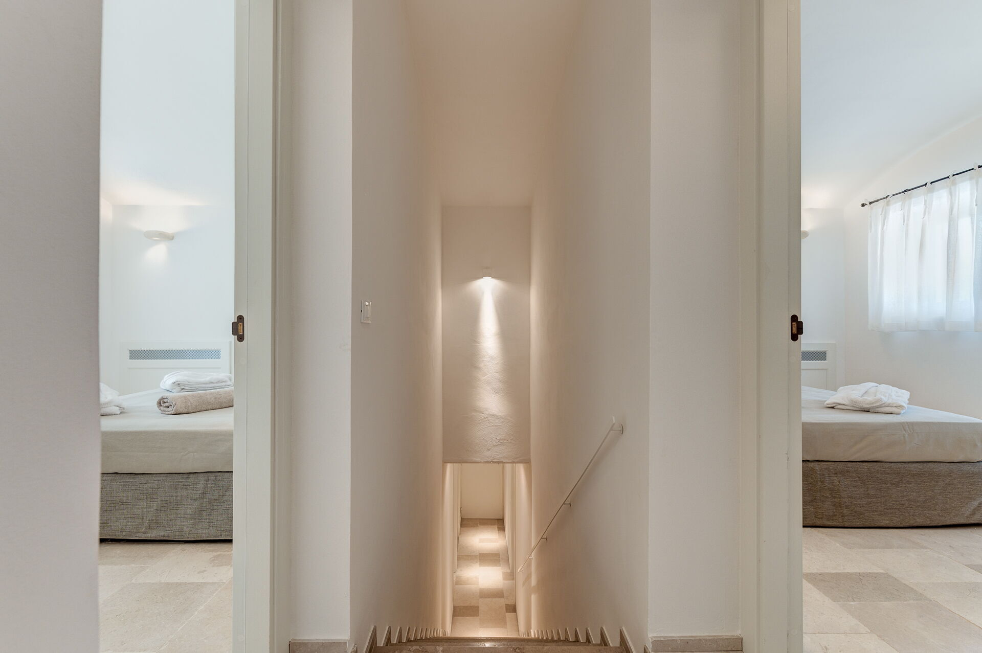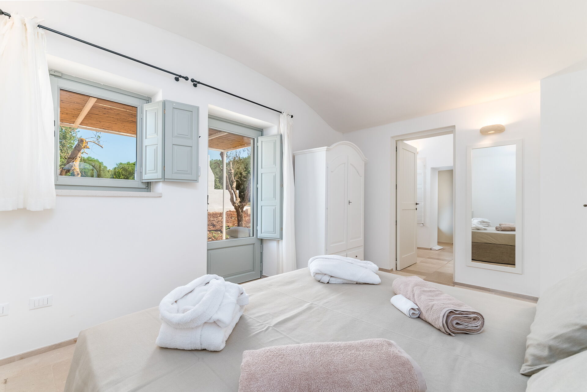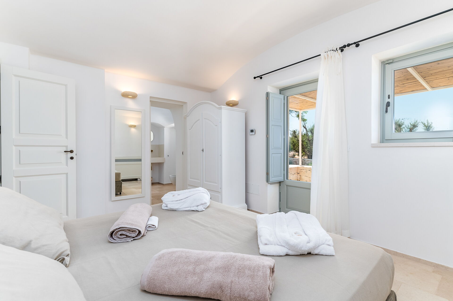 Alla sovrum har direkt tillgång till en terrass med bord och fåtölj.