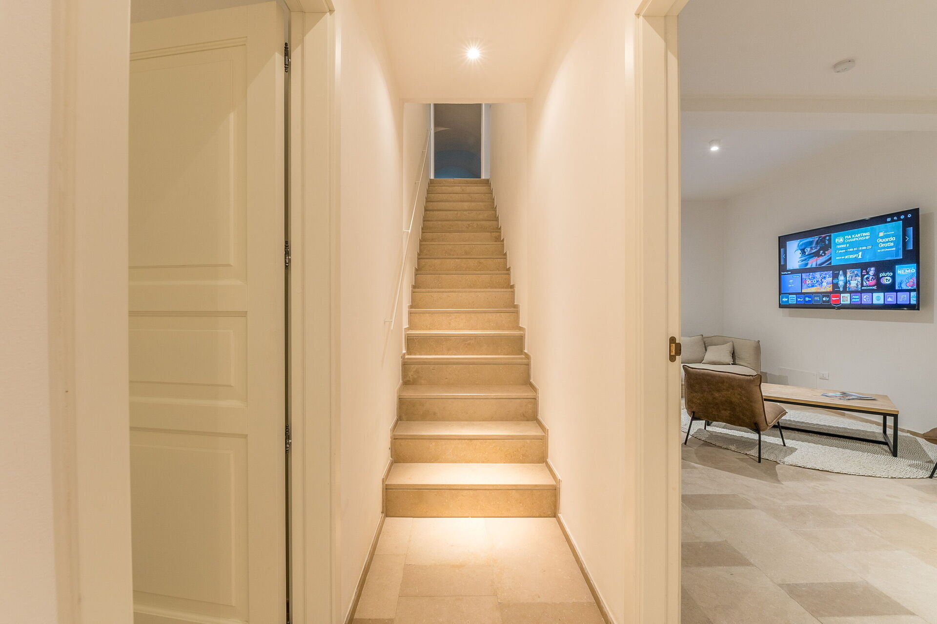 Nedre våning: dubbelrum med eget badrum med dusch, stort vardagsrum med smart-TV, tvättstuga (tvättmaskin, torktumlare, strykjärn), WC.
