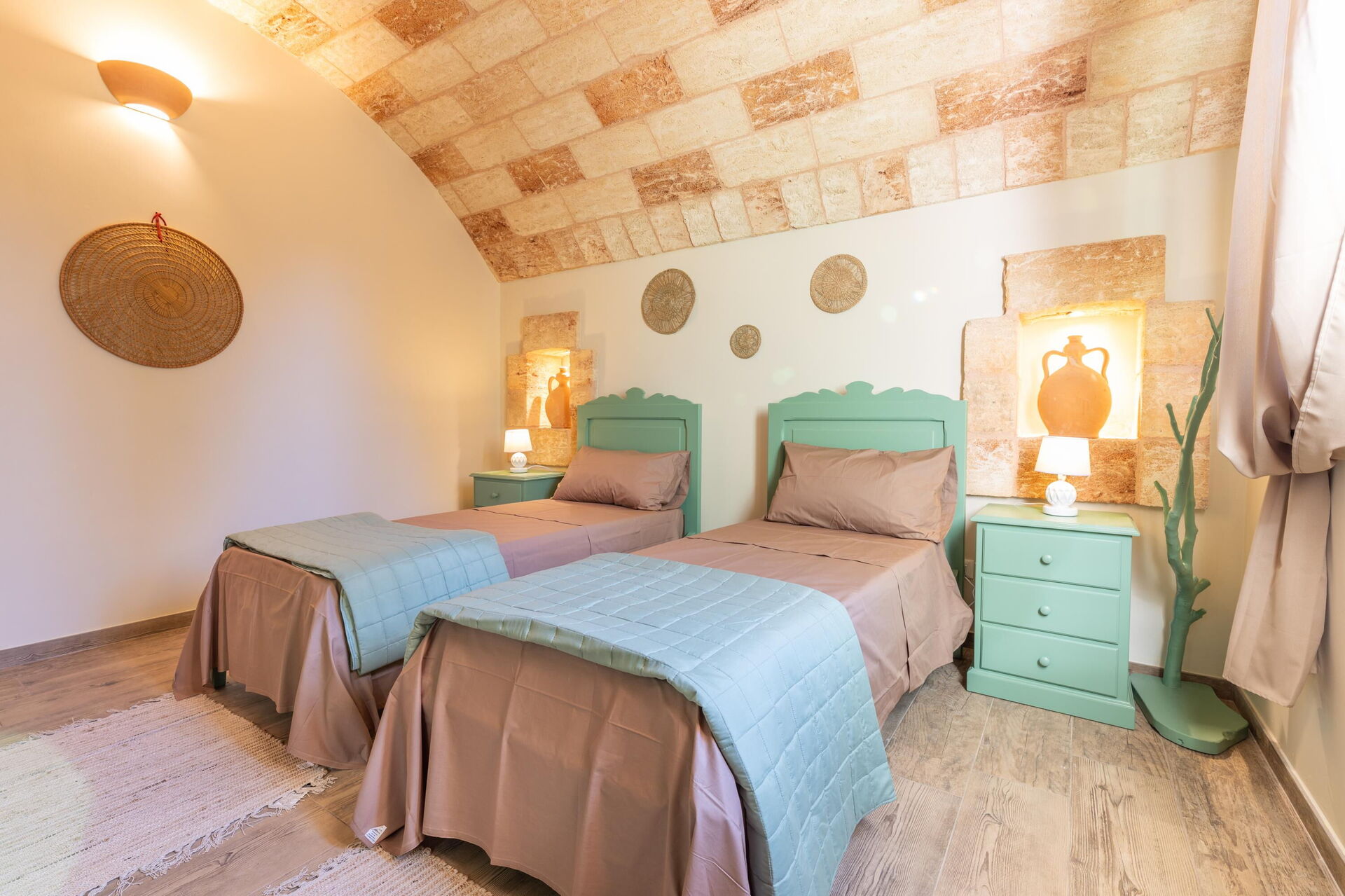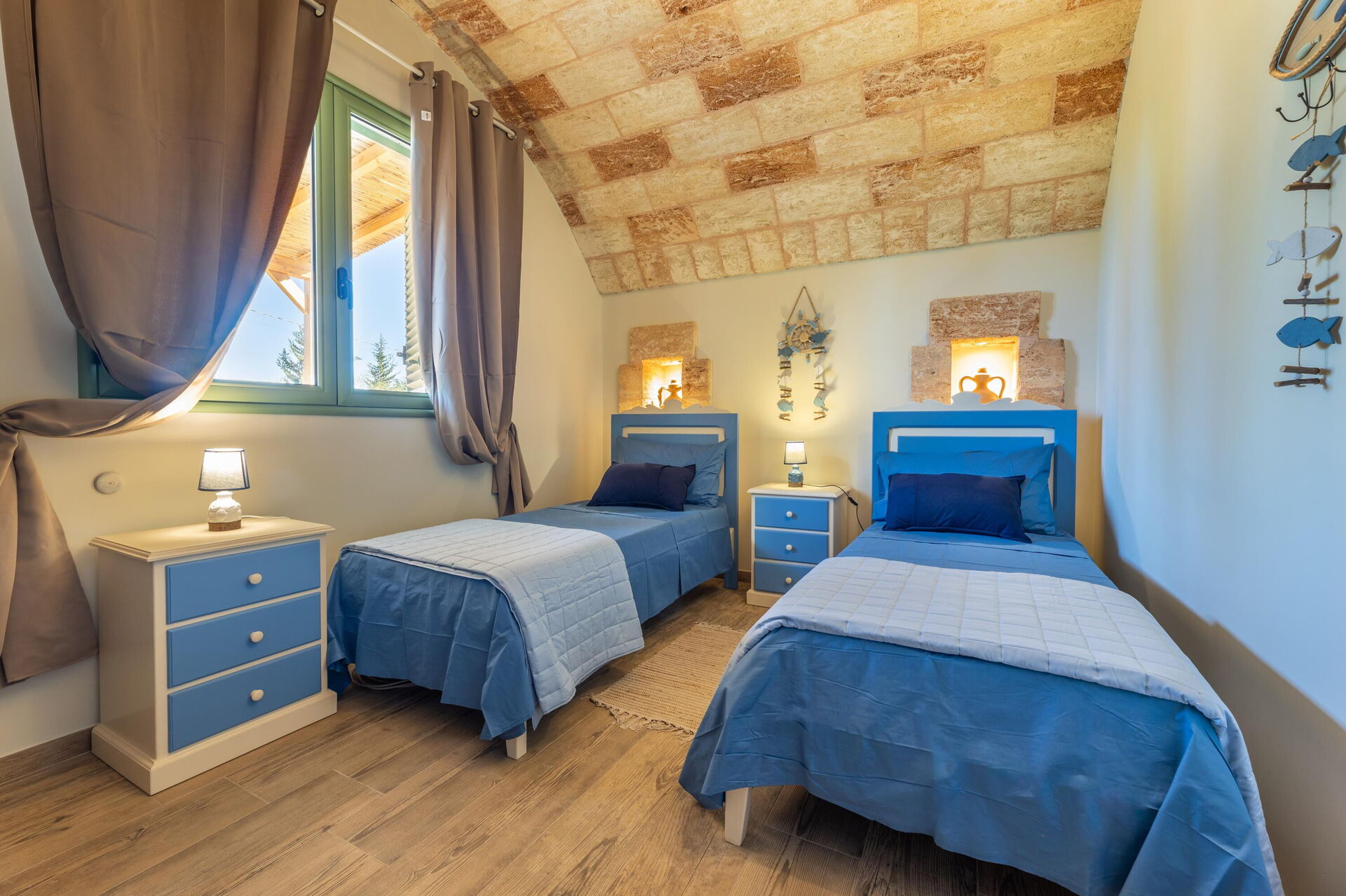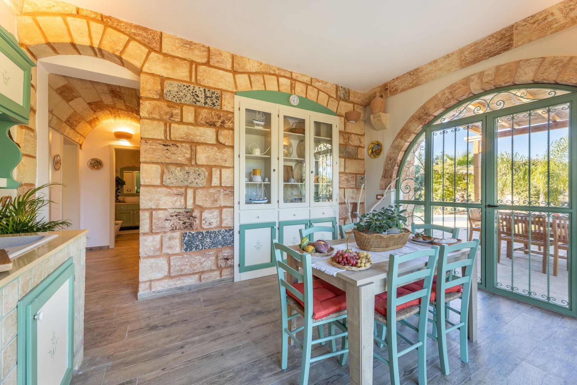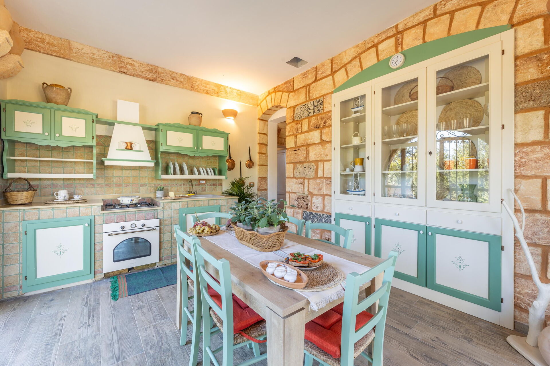 Semesterhuset är smakfullt inrett och har välvda tak samt synliga, traditionella tufastenar i flera av rummen.