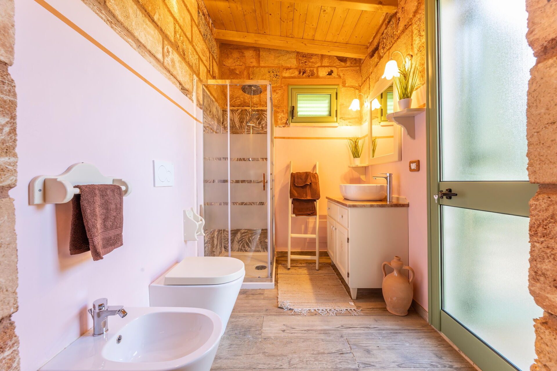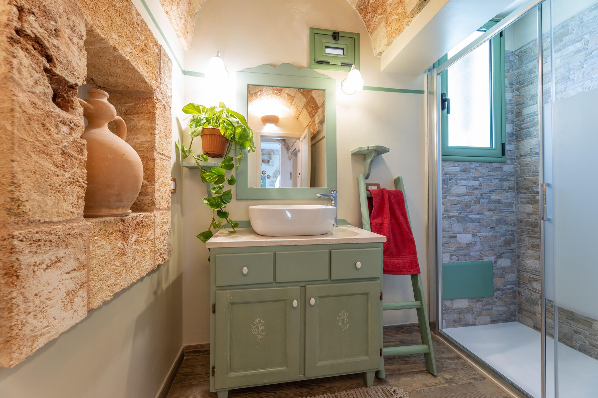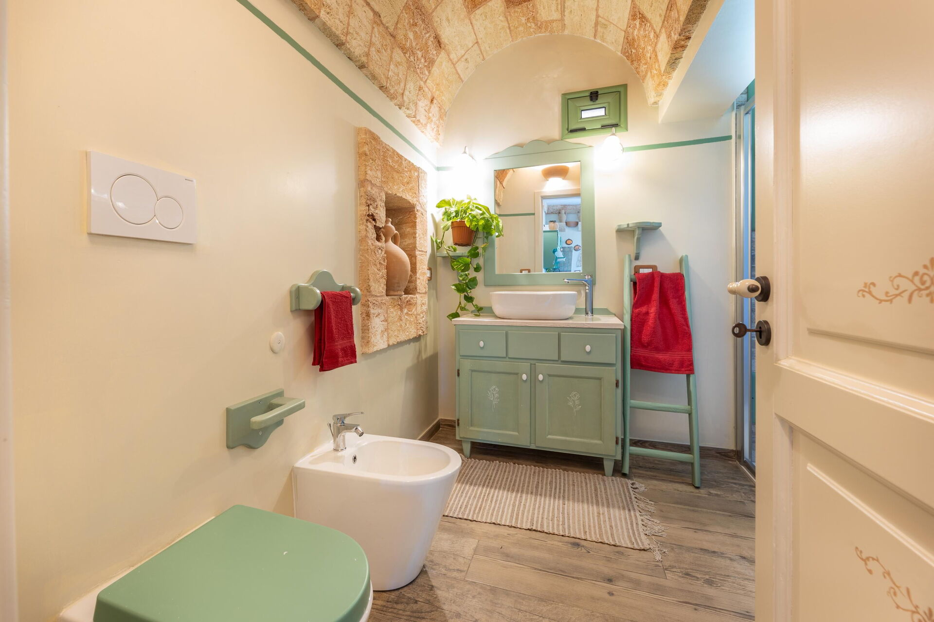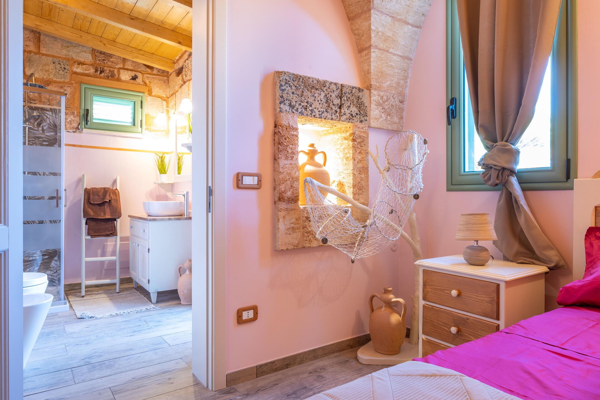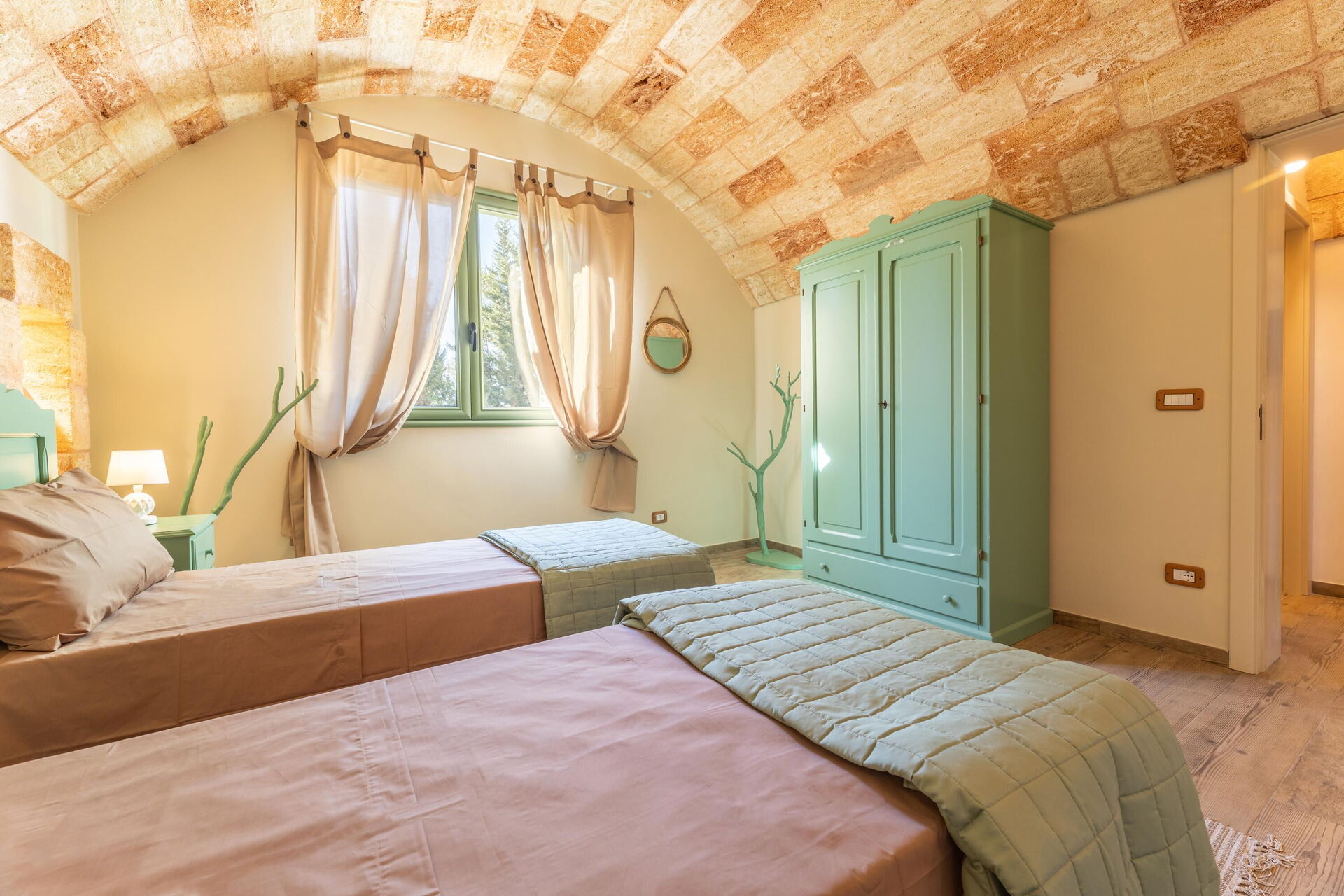 Semesterhuset är smakfullt inrett och har välvda tak samt synliga, traditionella tufastenar i flera av rummen.