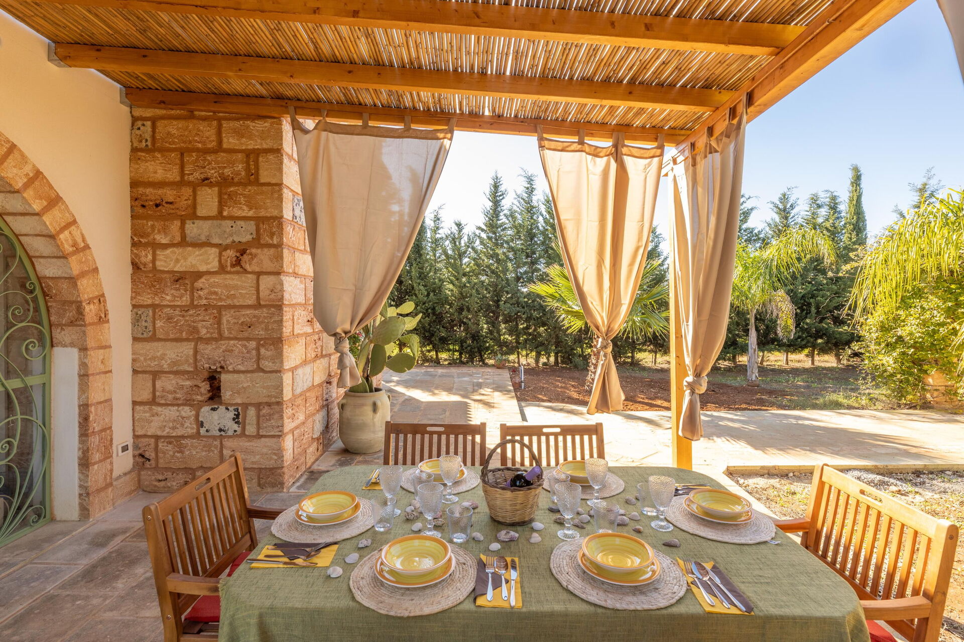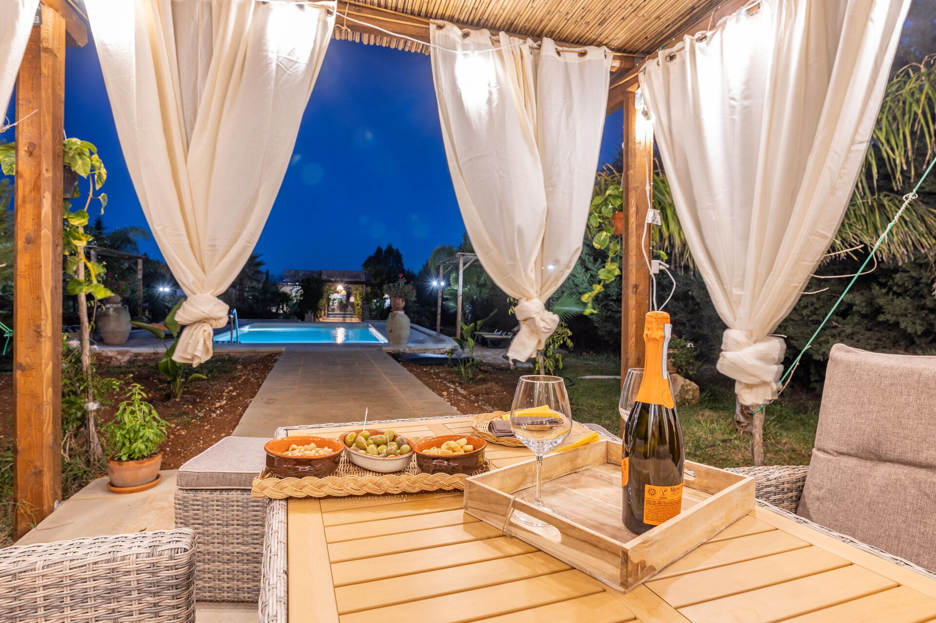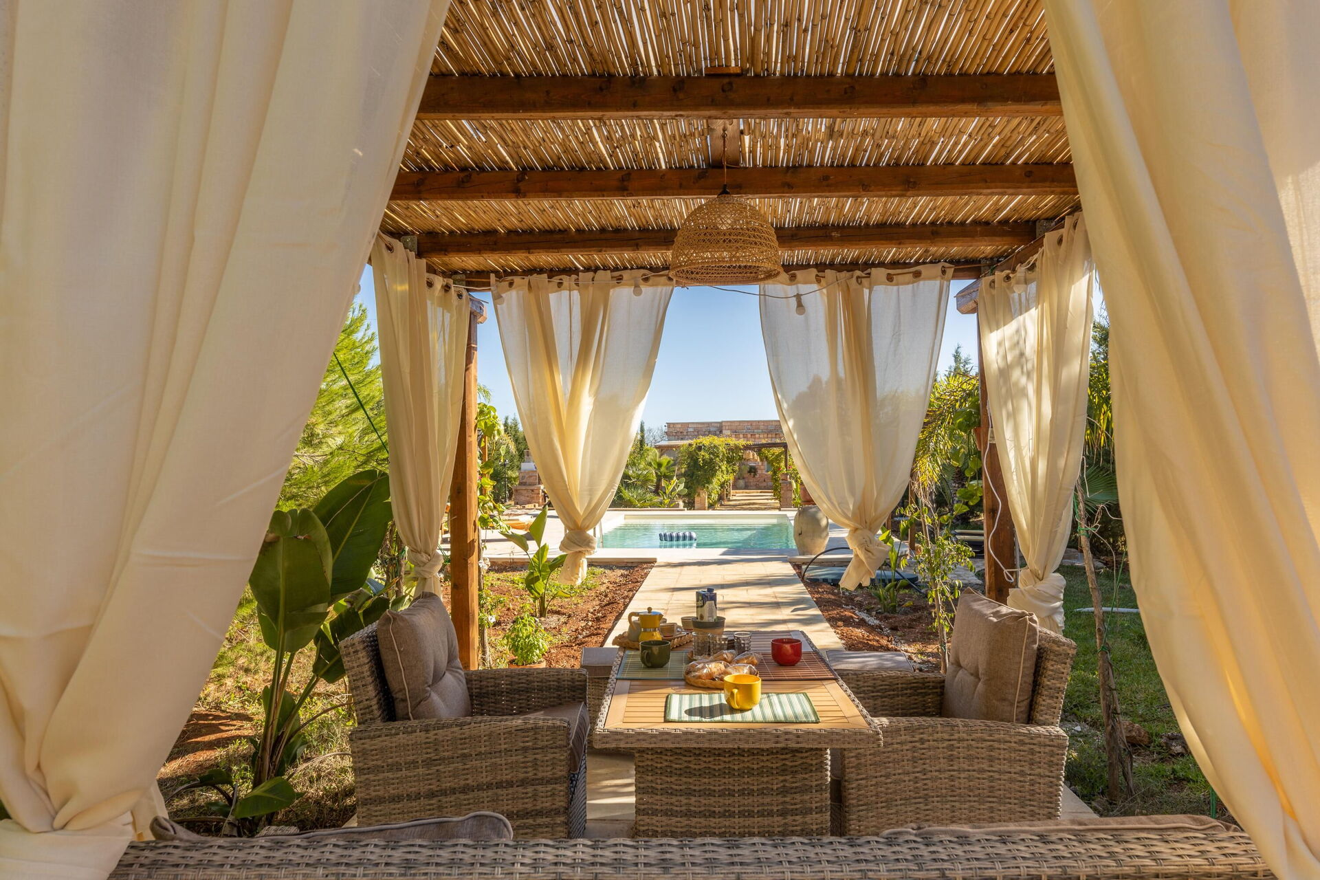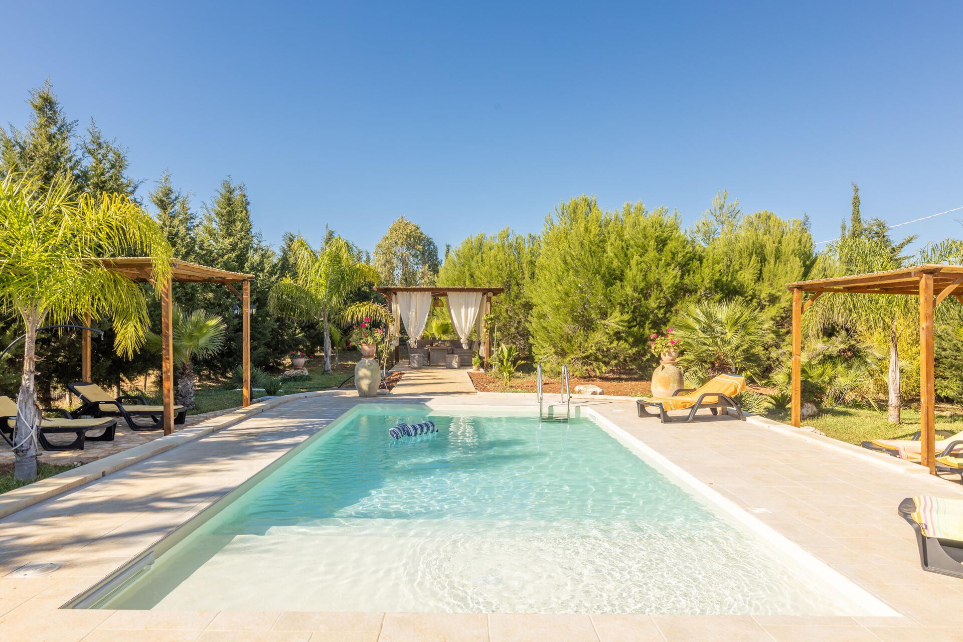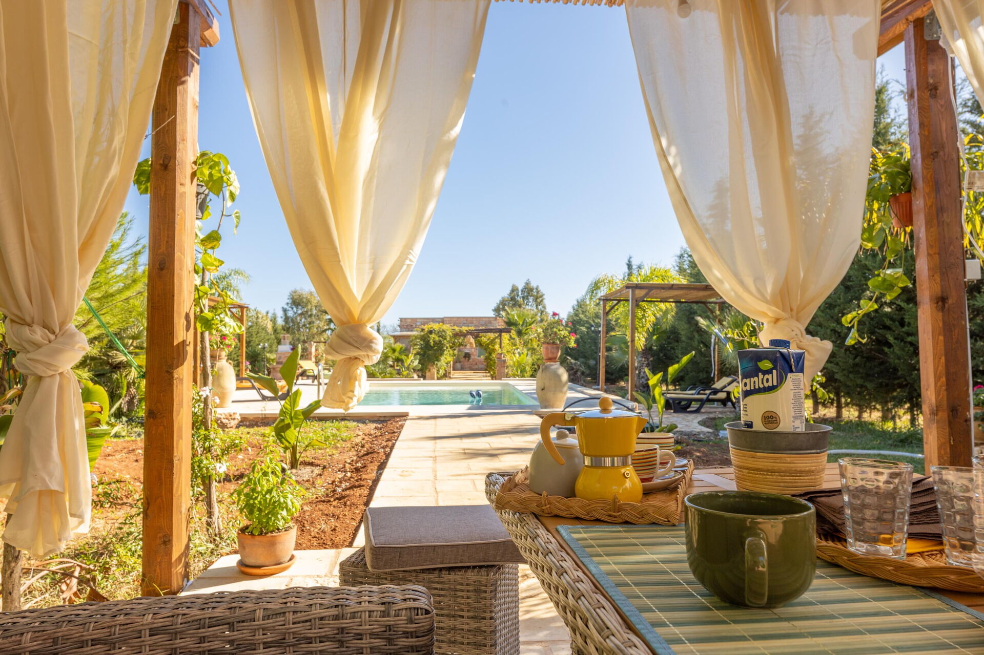 Huset omges av en stor trädgård med frodig vegetation bestående av träd och medelhavsväxter. Här finns en privat pool för gästerna, en veranda med utomhus matplats samt flera områden för avkoppling.