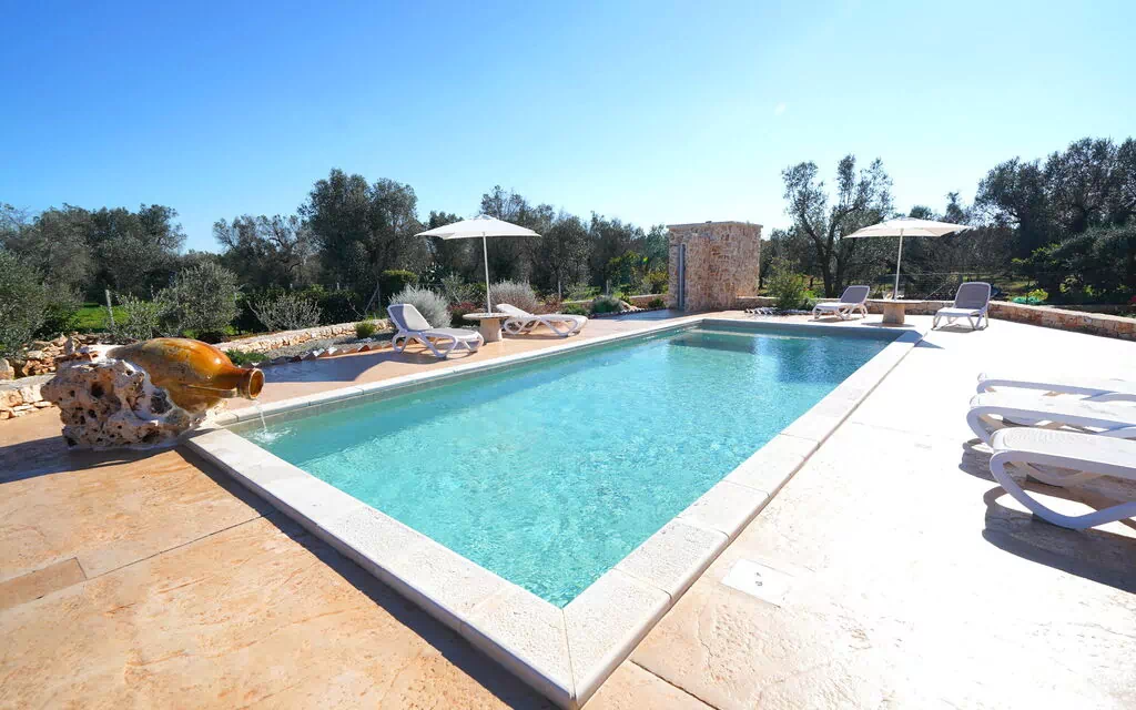Den stora privata poolen ligger bredvid en solterrass med solstolar – den perfekta platsen att koppla av och svalka sig tillsammans med familj eller vänner under Salentos varma sol.