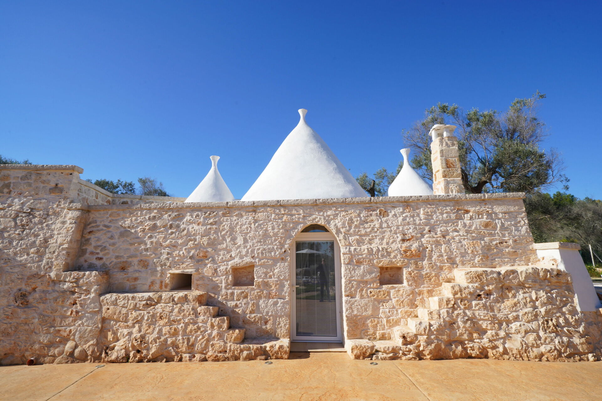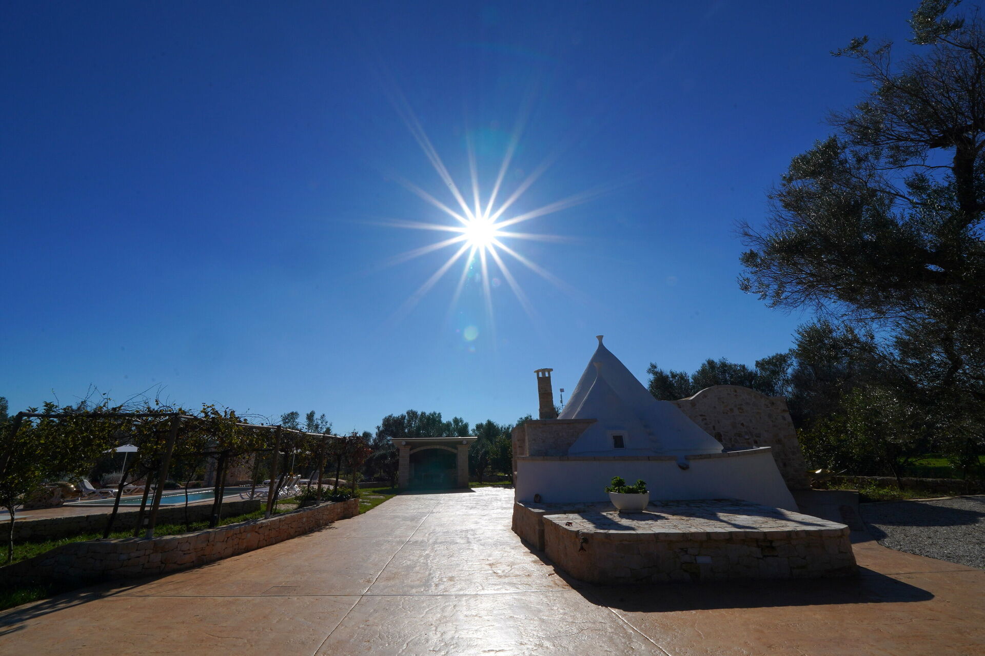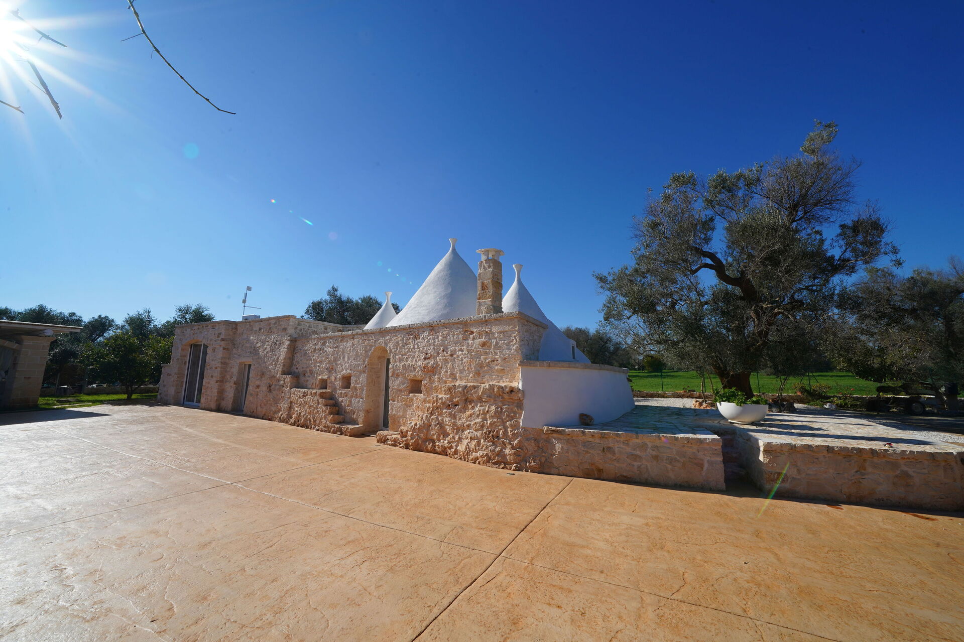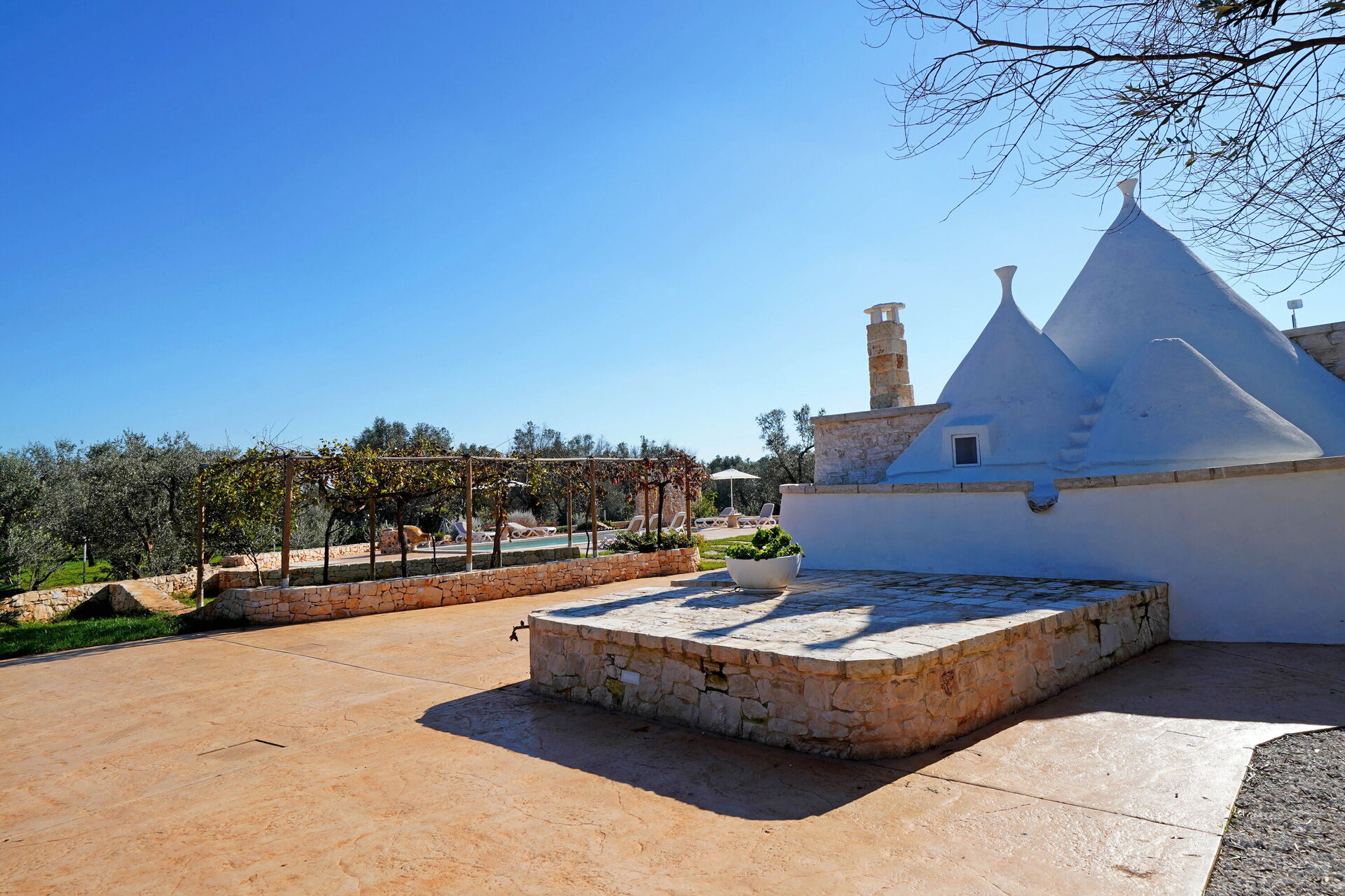 Utomhus omges Trullo Samanta av stora, välskötta ytor med frukt- och olivträd.