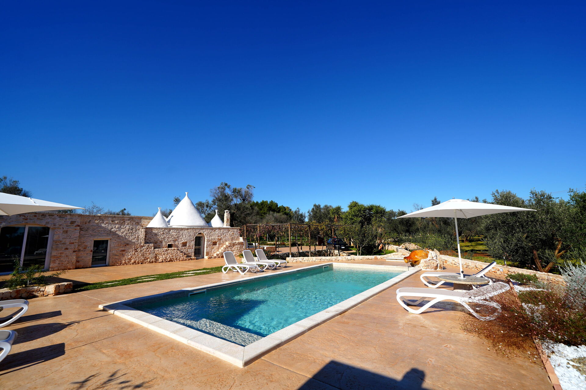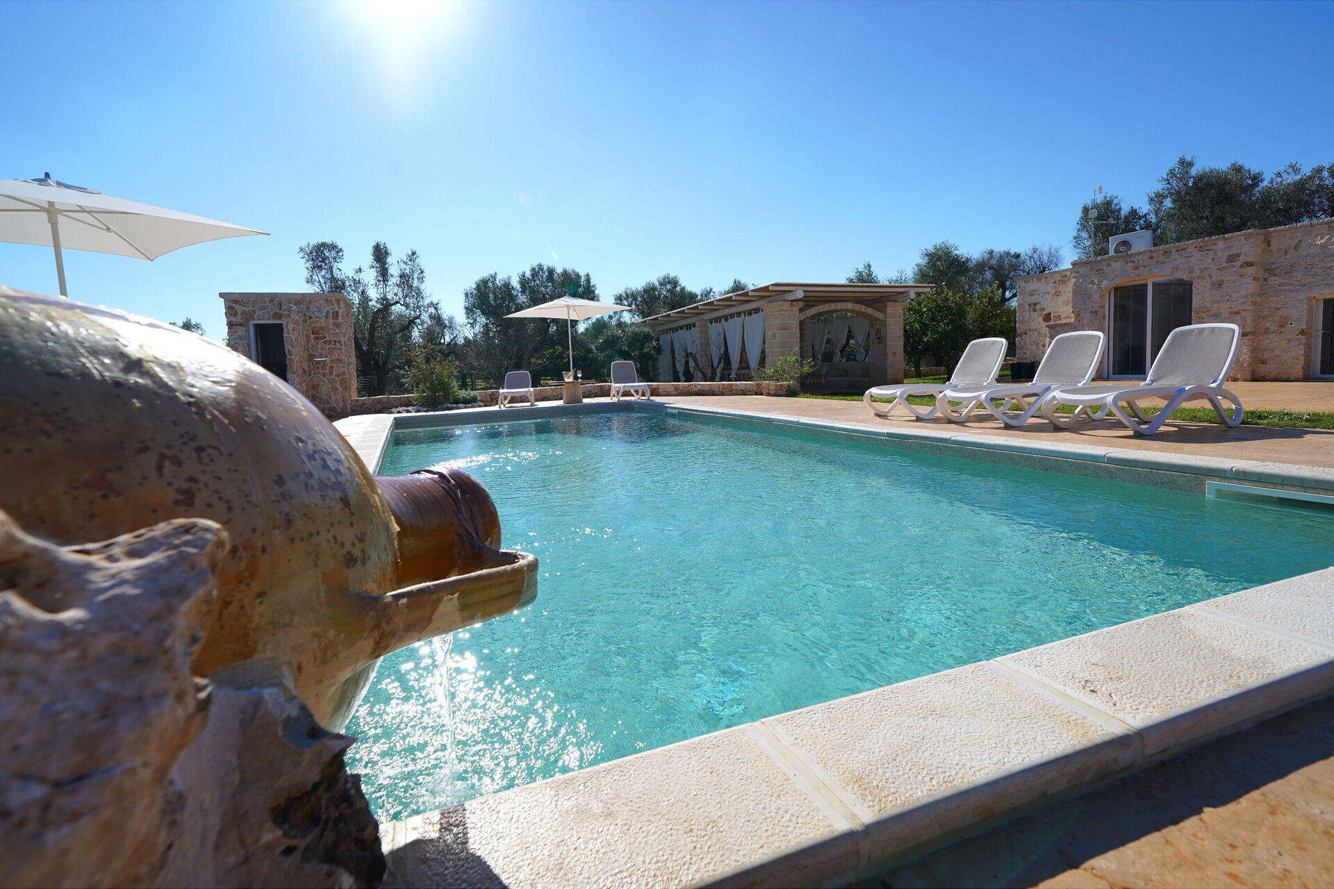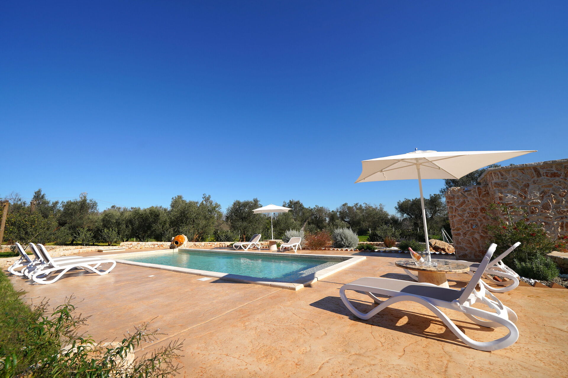 Den stora privata poolen ligger bredvid en solterrass med solstolar – den perfekta platsen att koppla av och svalka sig tillsammans med familj eller vänner under Salentos varma sol.