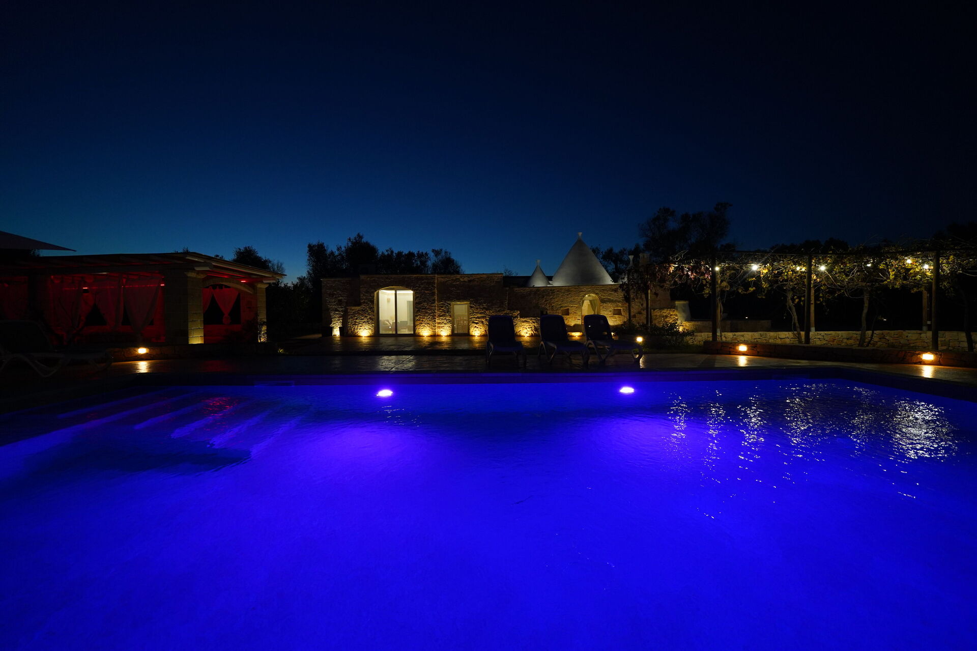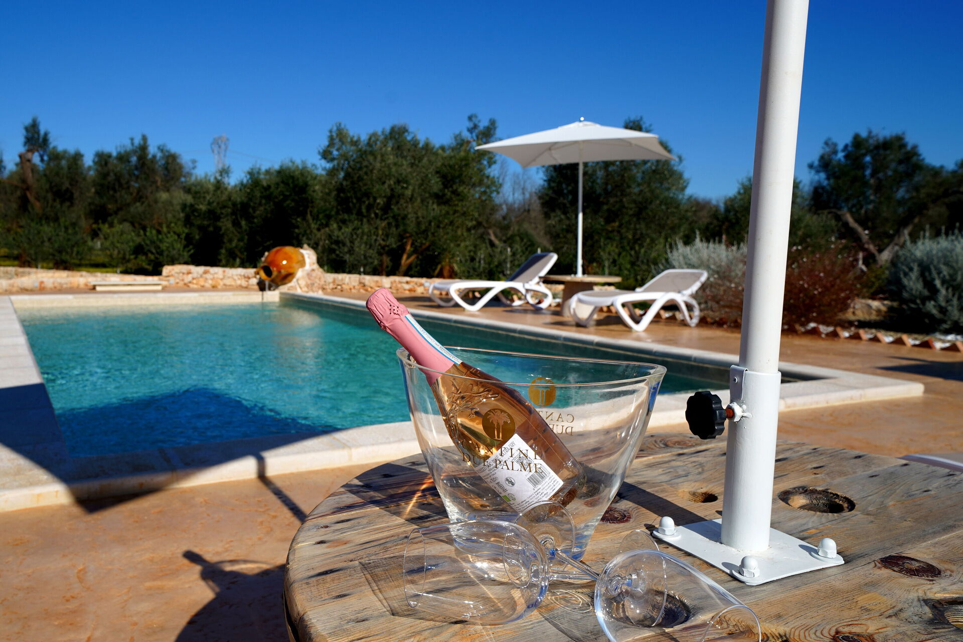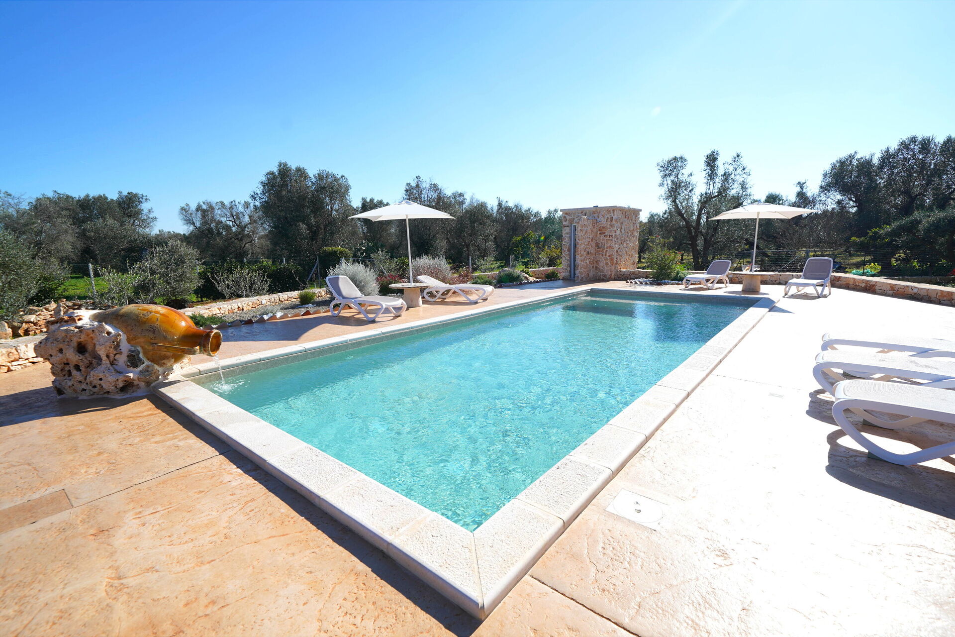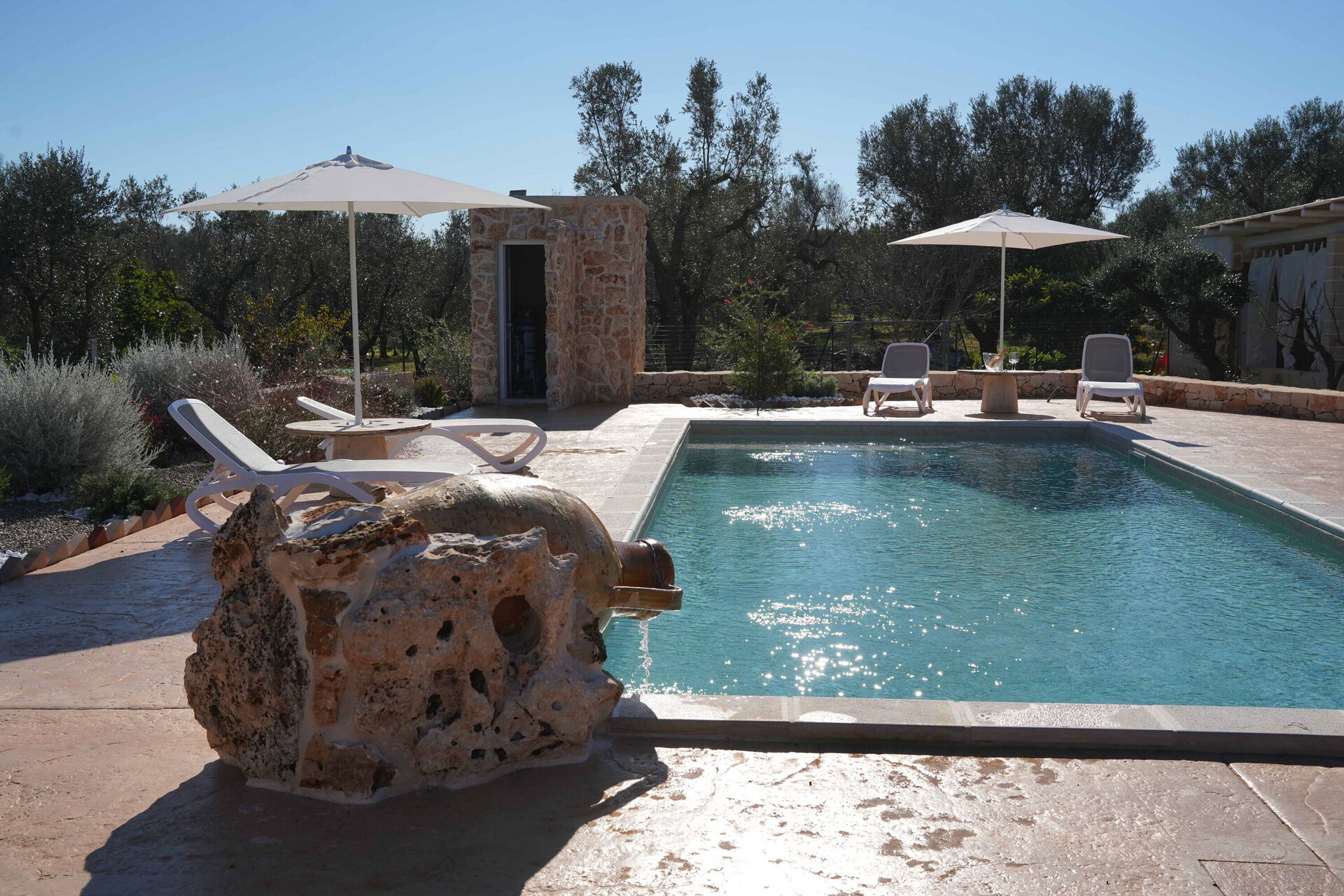 Den stora privata poolen ligger bredvid en solterrass med solstolar – den perfekta platsen att koppla av och svalka sig tillsammans med familj eller vänner under Salentos varma sol.