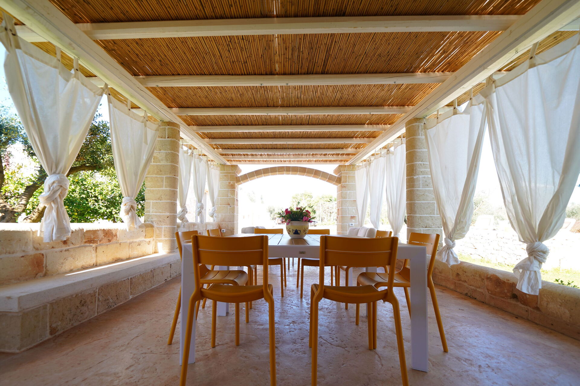 En vacker veranda med bord, stolar och grill står också till gästernas förfogande: här kan du grilla och njuta av måltider utomhus medan du beundrar den praktfulla panoramautsikten över det vackra landskapet i Apuliens landsbygd.