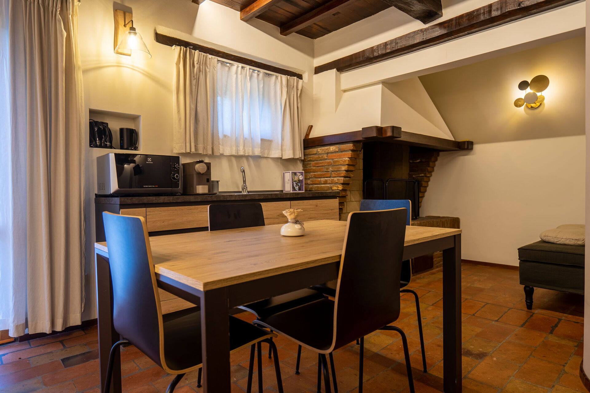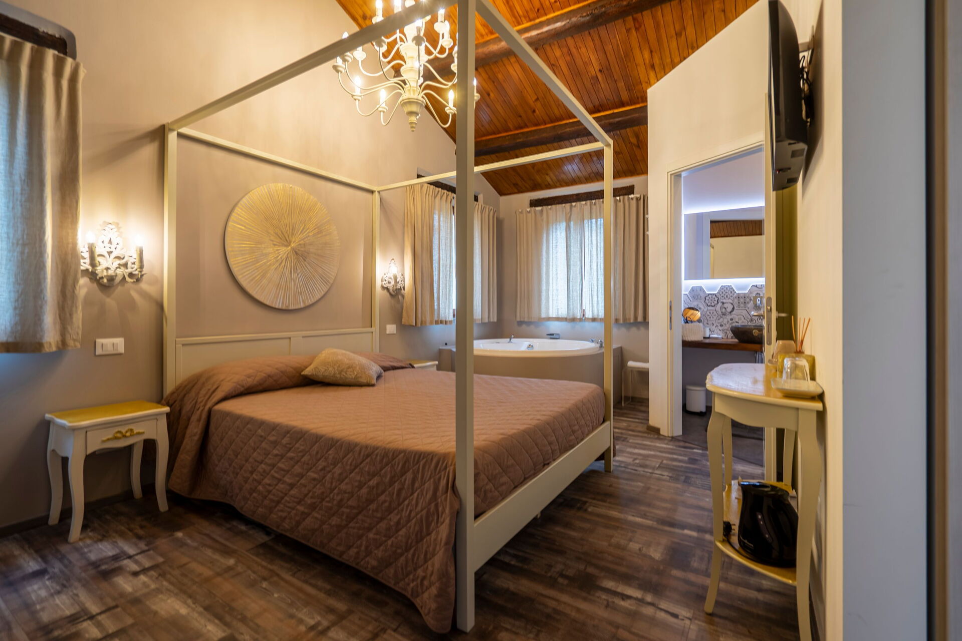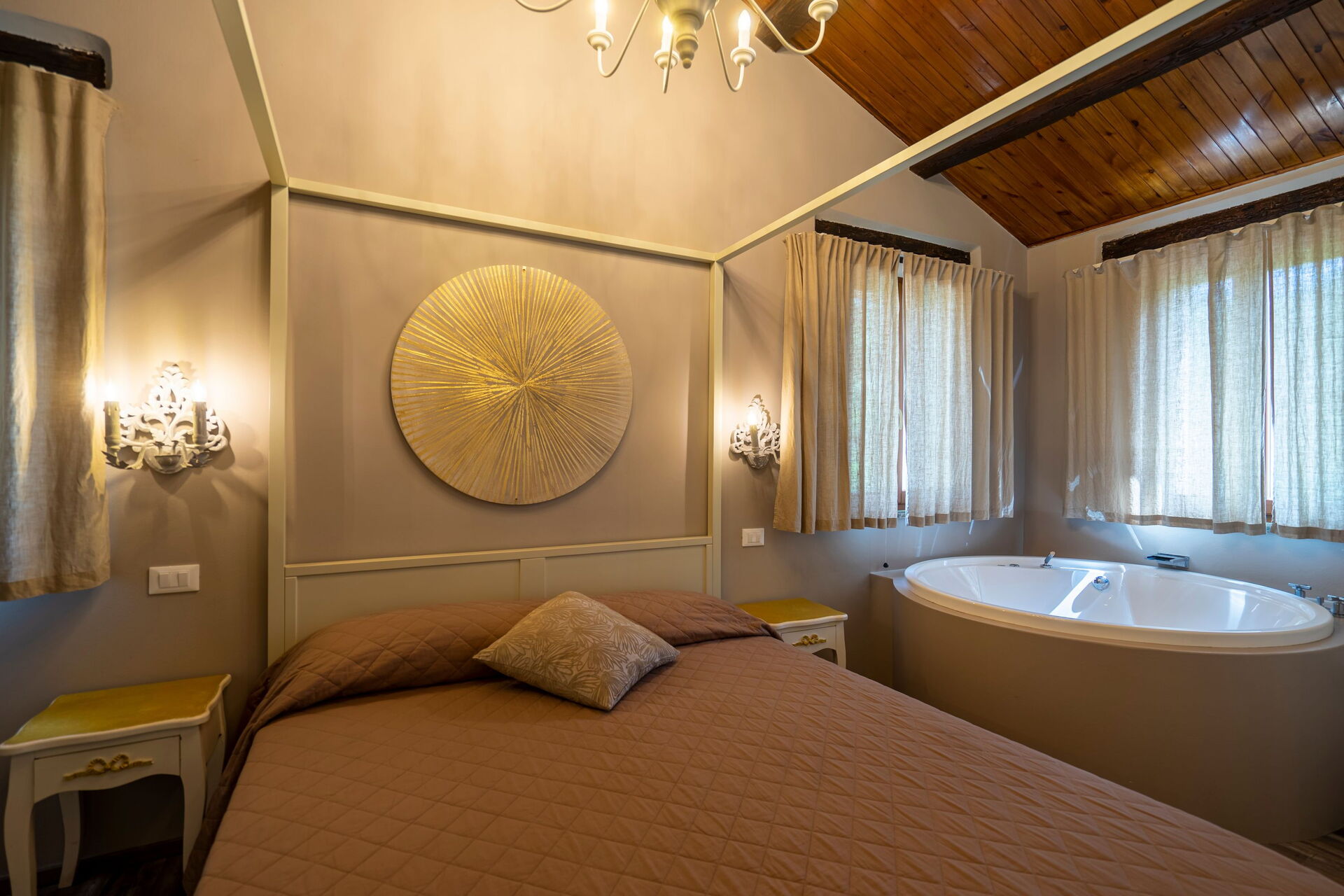Vardagsrum (luftkonditionering, TV) med matplats och kök (spishäll, ugn, frys, kyl, diskmaskin, kaffebryggare); svit med vardagsrum med öppen spis, dubbel bäddsoffa, TV, 1 dubbelrum (luftkonditionering, TV, minibar) med eget badrum med duschkabin (perfekt för personer med nedsatt rörlighet), tillgång till privat uteplats med utsikt över parken; svit med vardagsrum med öppen spis, pentry (spishäll, kylskåp), enkel bäddsoffa, TV, 1 dubbelrum (luftkonditionering, TV, minibar) med hörnbadkar med färgterapi och privat badrum med multifunktionell dusch med färgterapi och turkiskt bad