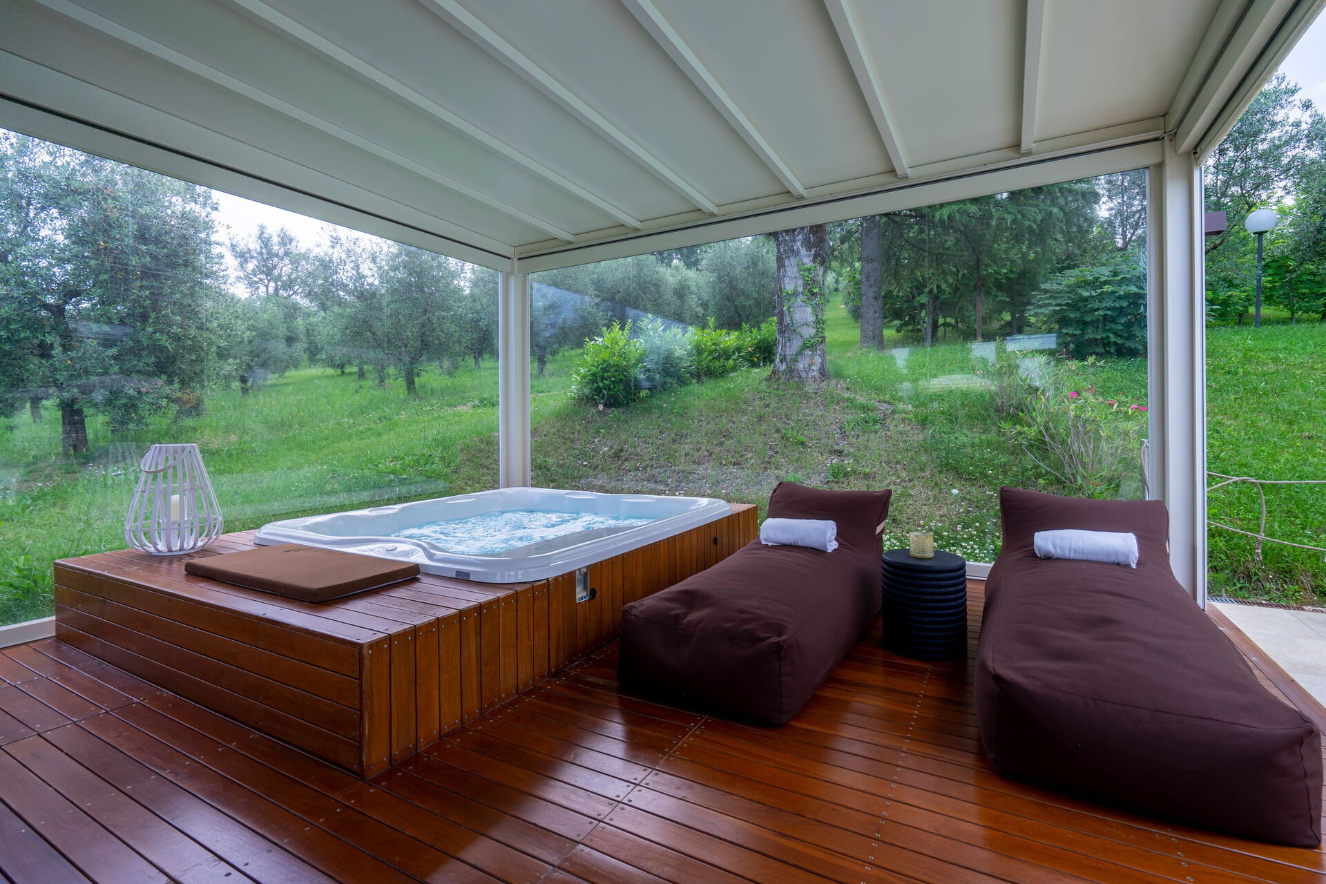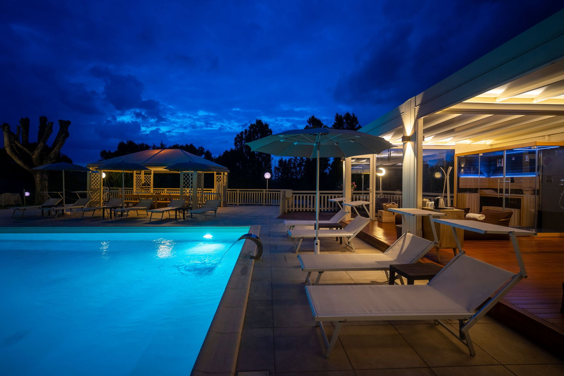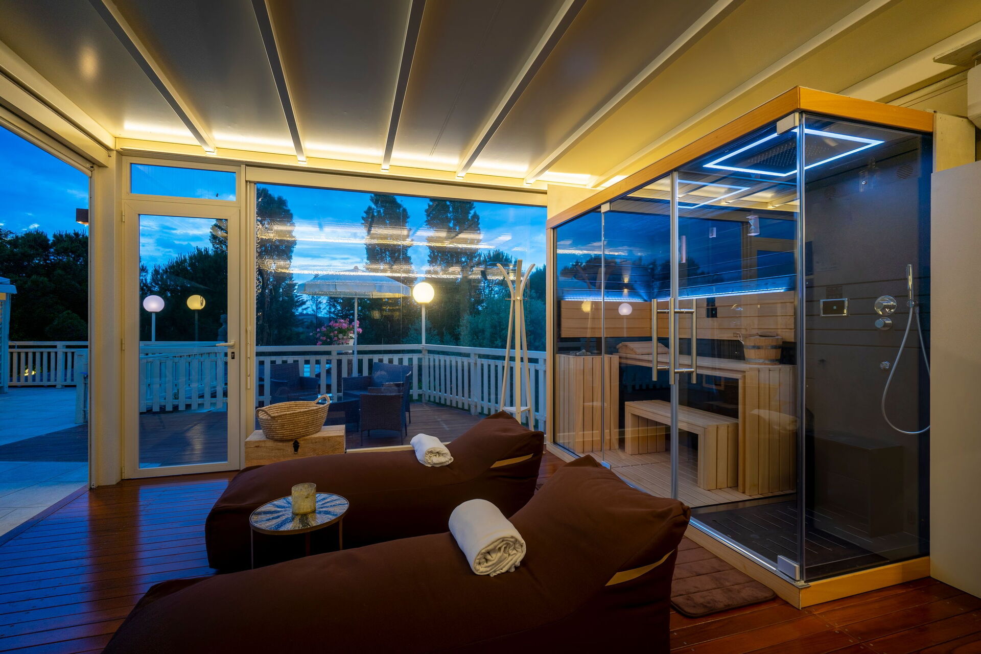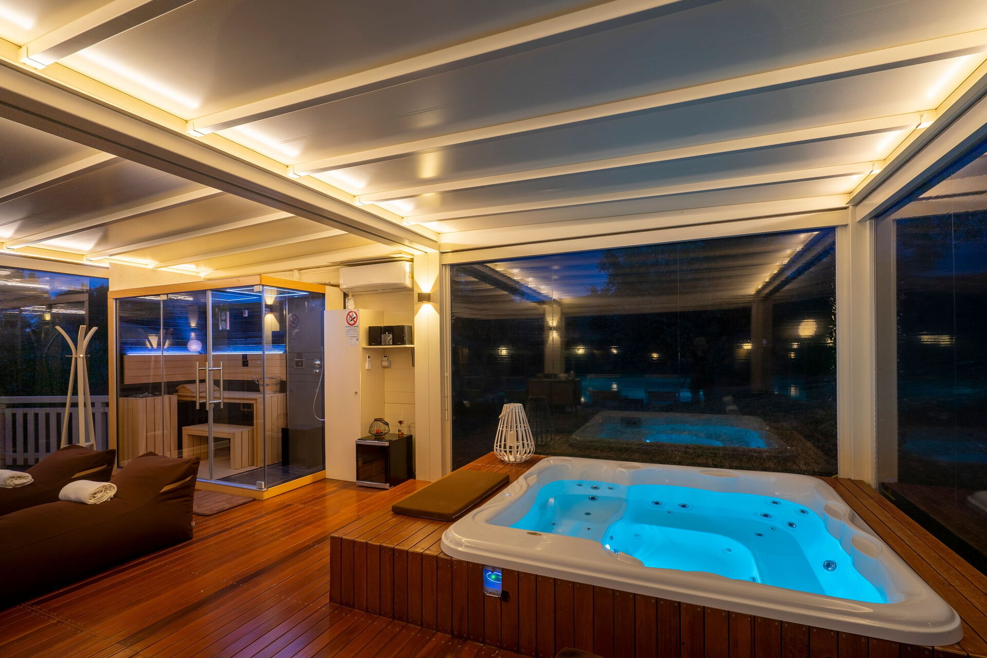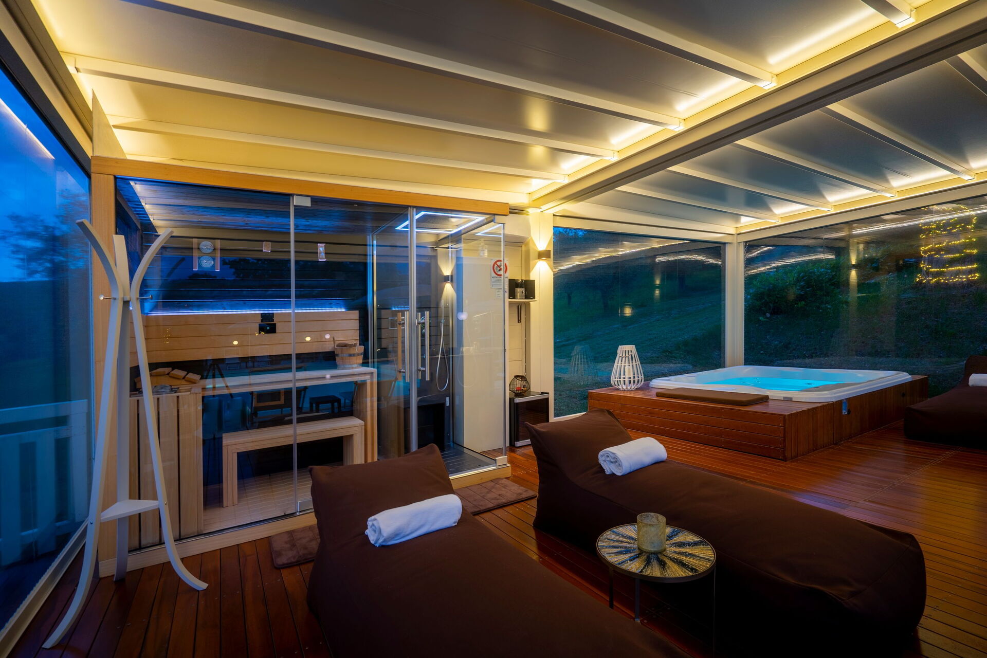 - Utomhusspa med bastu, turkiskt bad (14.00 till 12.00) och uppvärmd bubbelbad