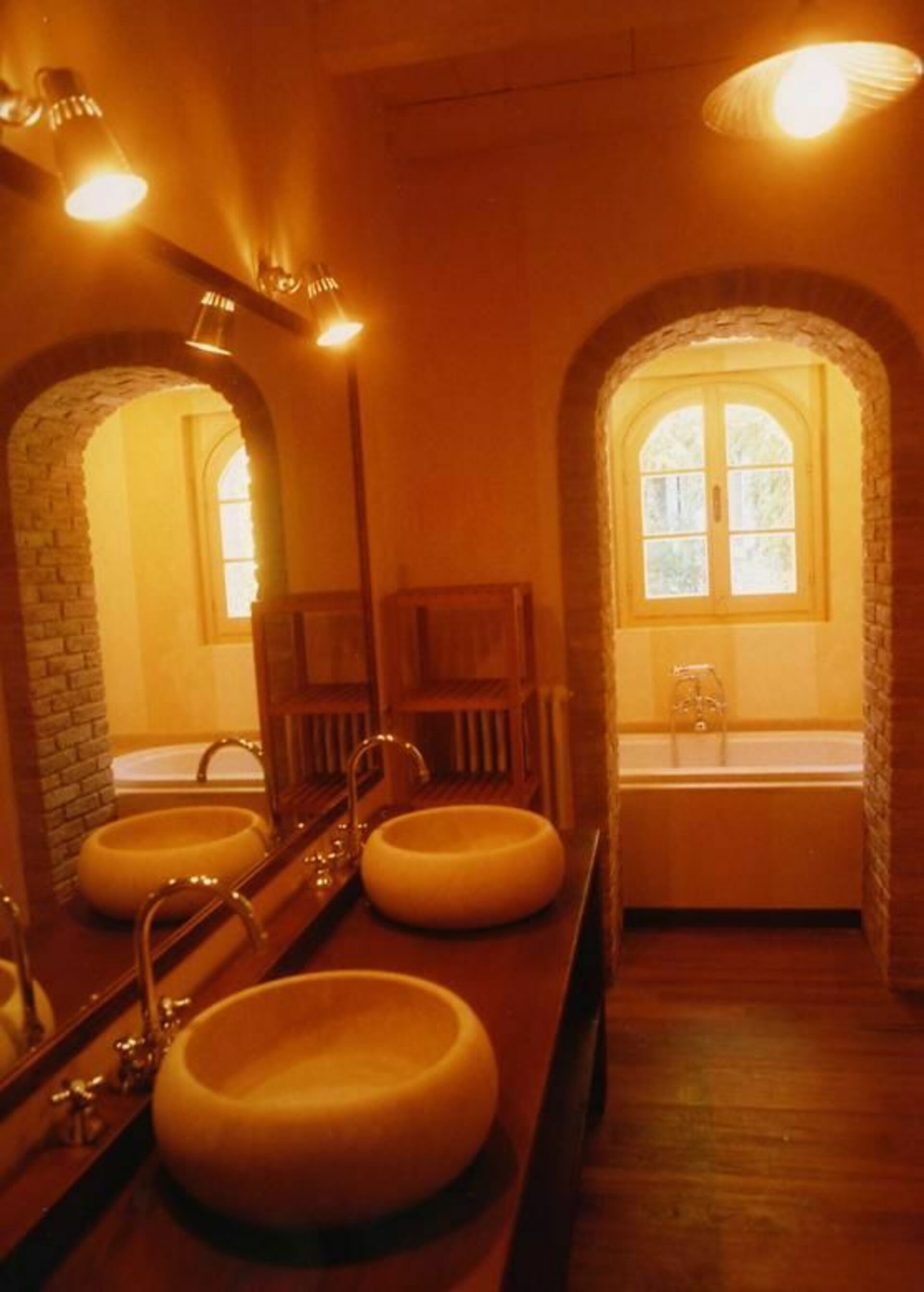 Det orange rum med badrum med dusch och badkar