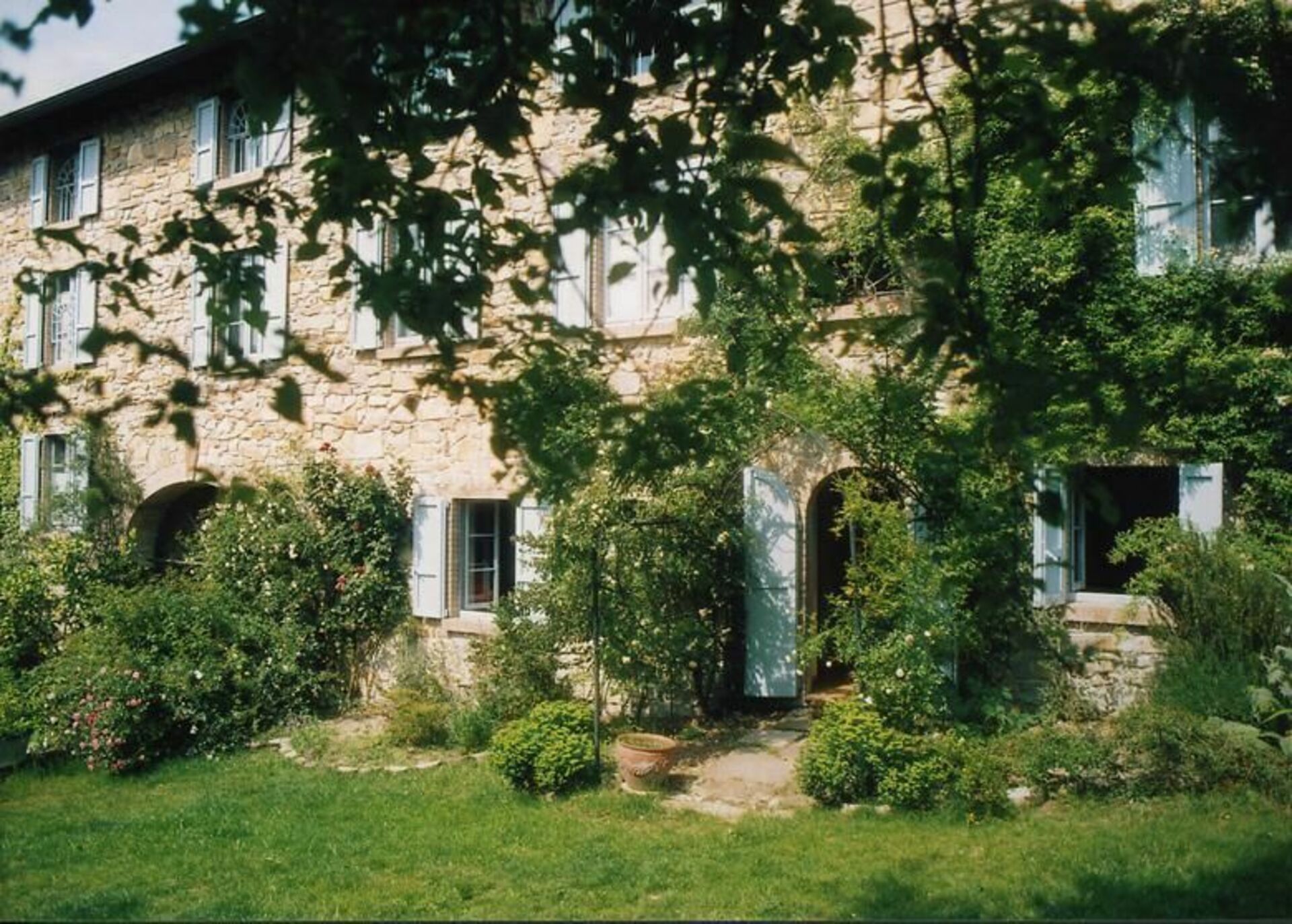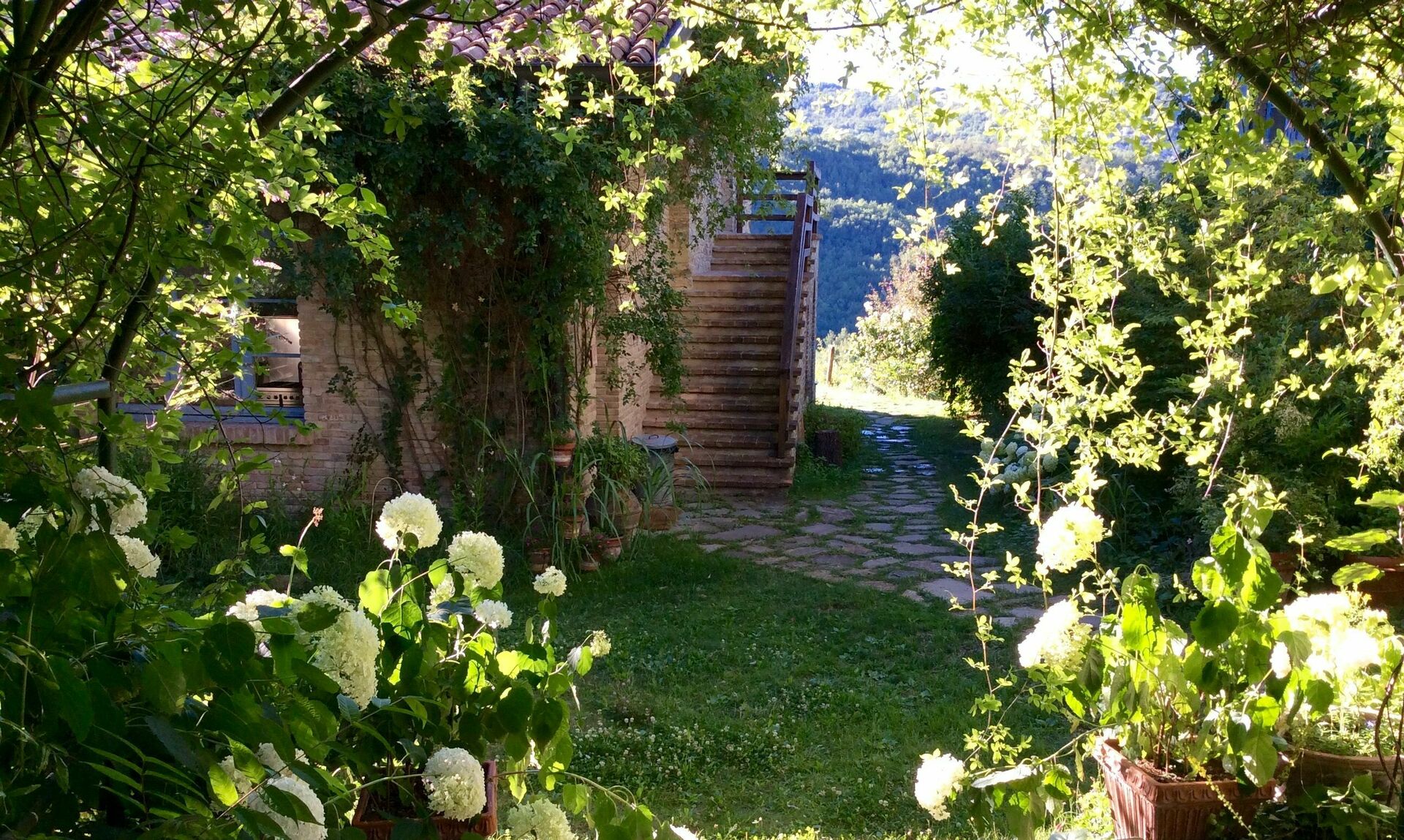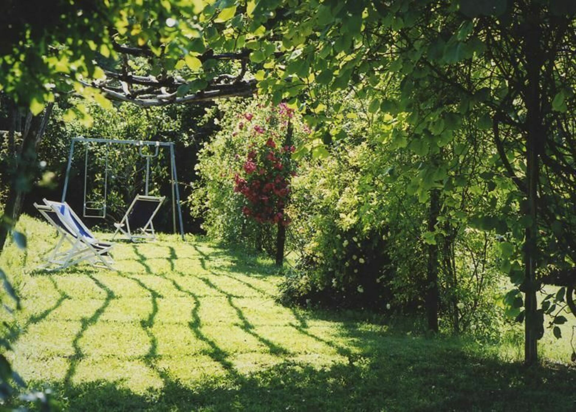 Tvåvåningshuset är omgivet av en mycket välskött trädgård där den privata poolen ligger.