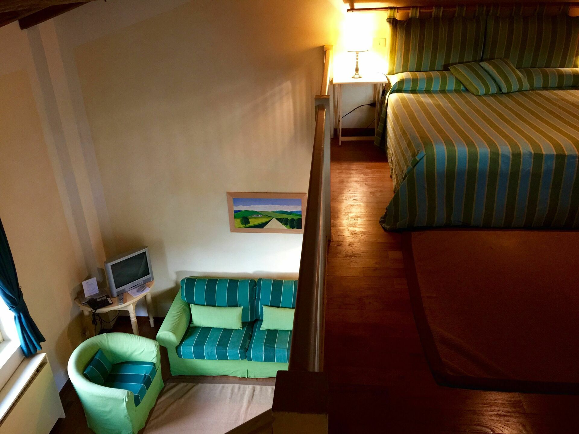 Den gröna sviten med vardagsrum, kök och galleri med 1 dubbelsäng och 2 enkelsängar (luftkonditionering); badrum med dusch och badkar