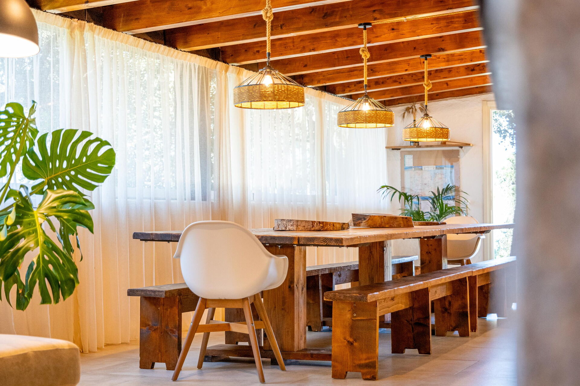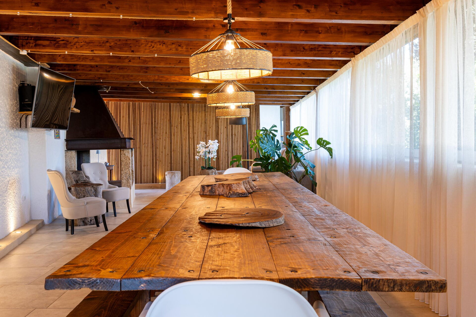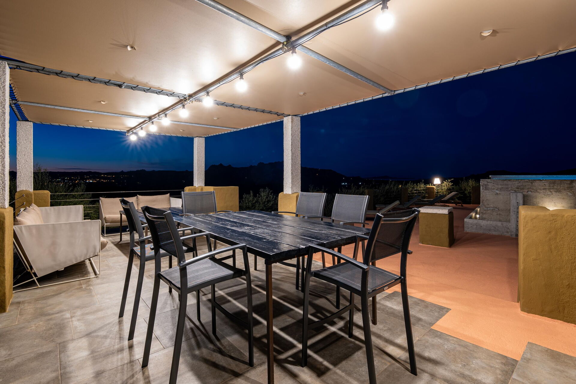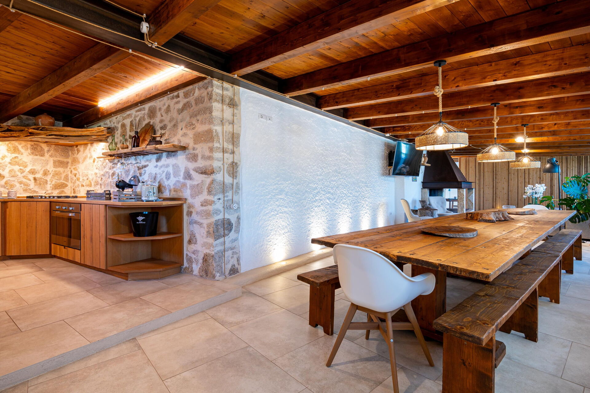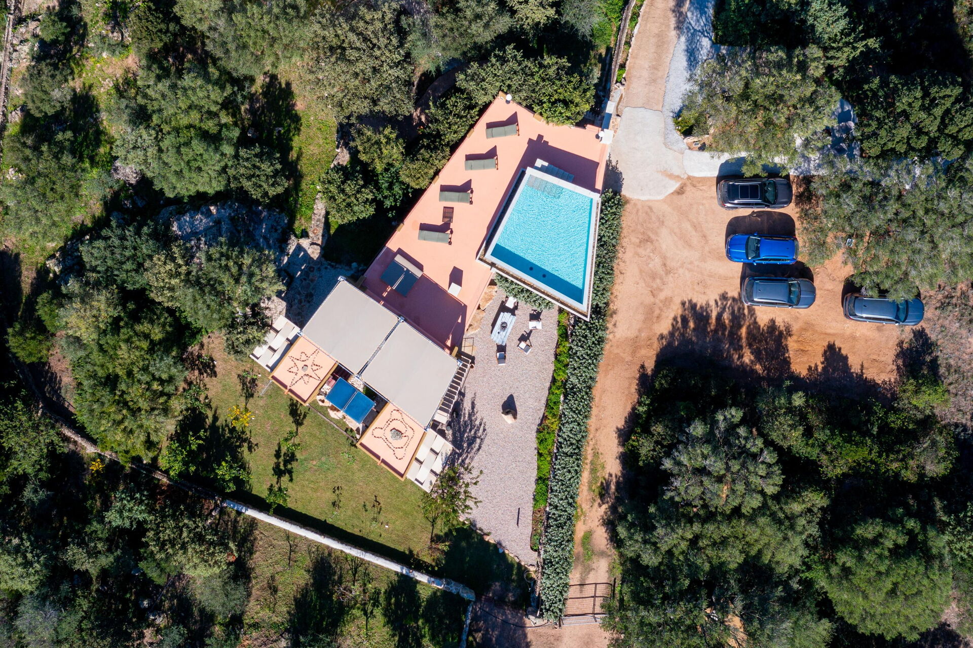 Utomhus erbjuder fastigheten flera gemensamma ytor med panoramautsikt: poolen är byggd på terrassen på första våningen för att gästerna ska kunna njuta av den magnifika utsikten över det omgivande landskapet och havet. På terrassen kan du också koppla av i en av solstolarna eller njuta av en måltid utomhus under den stora paviljongen.