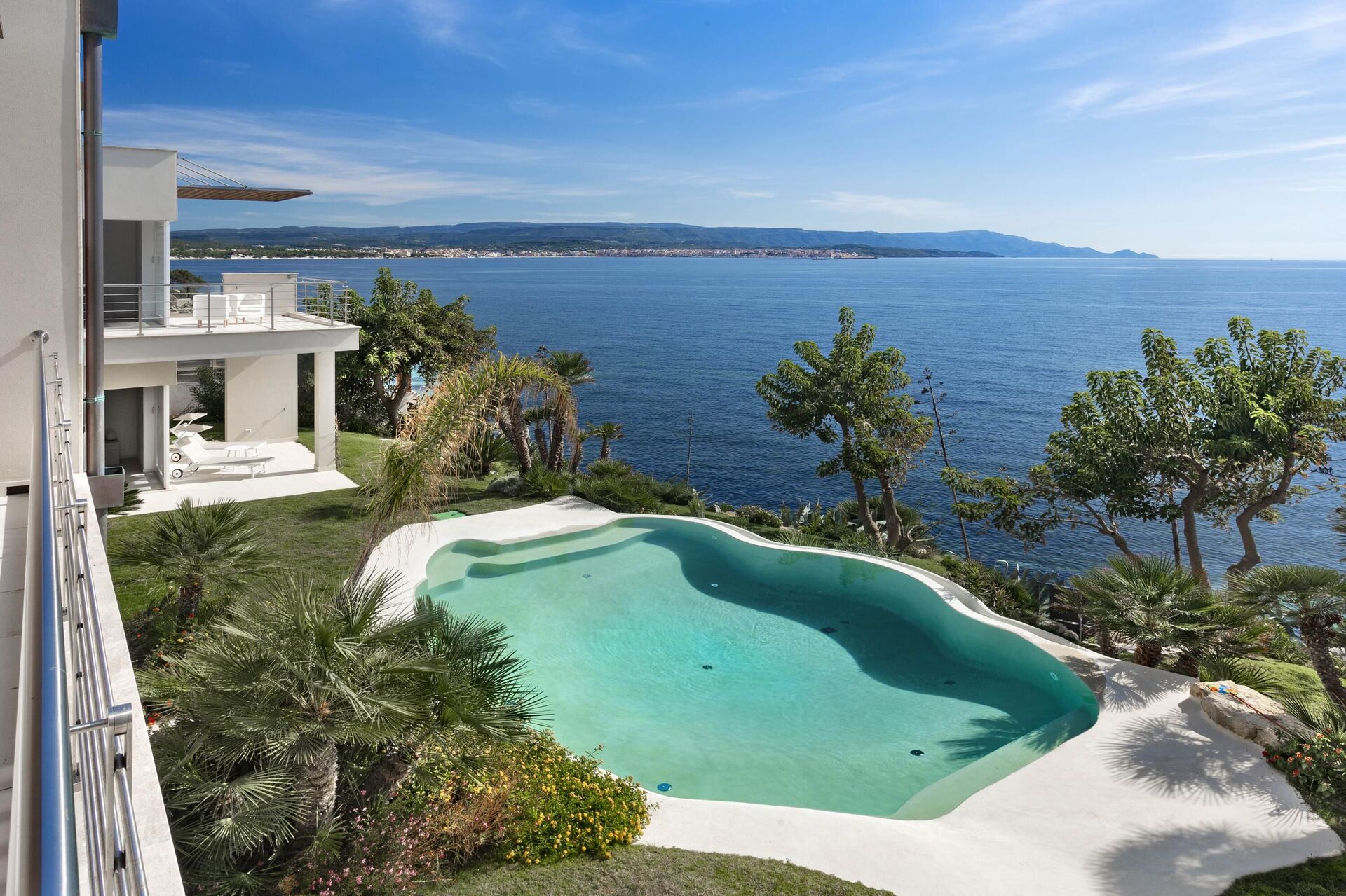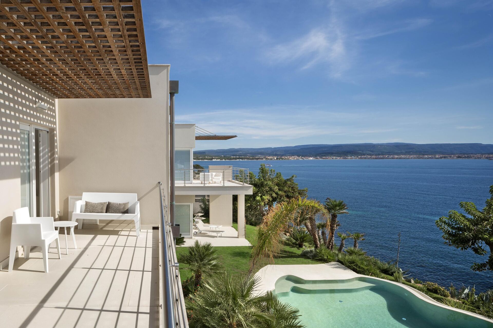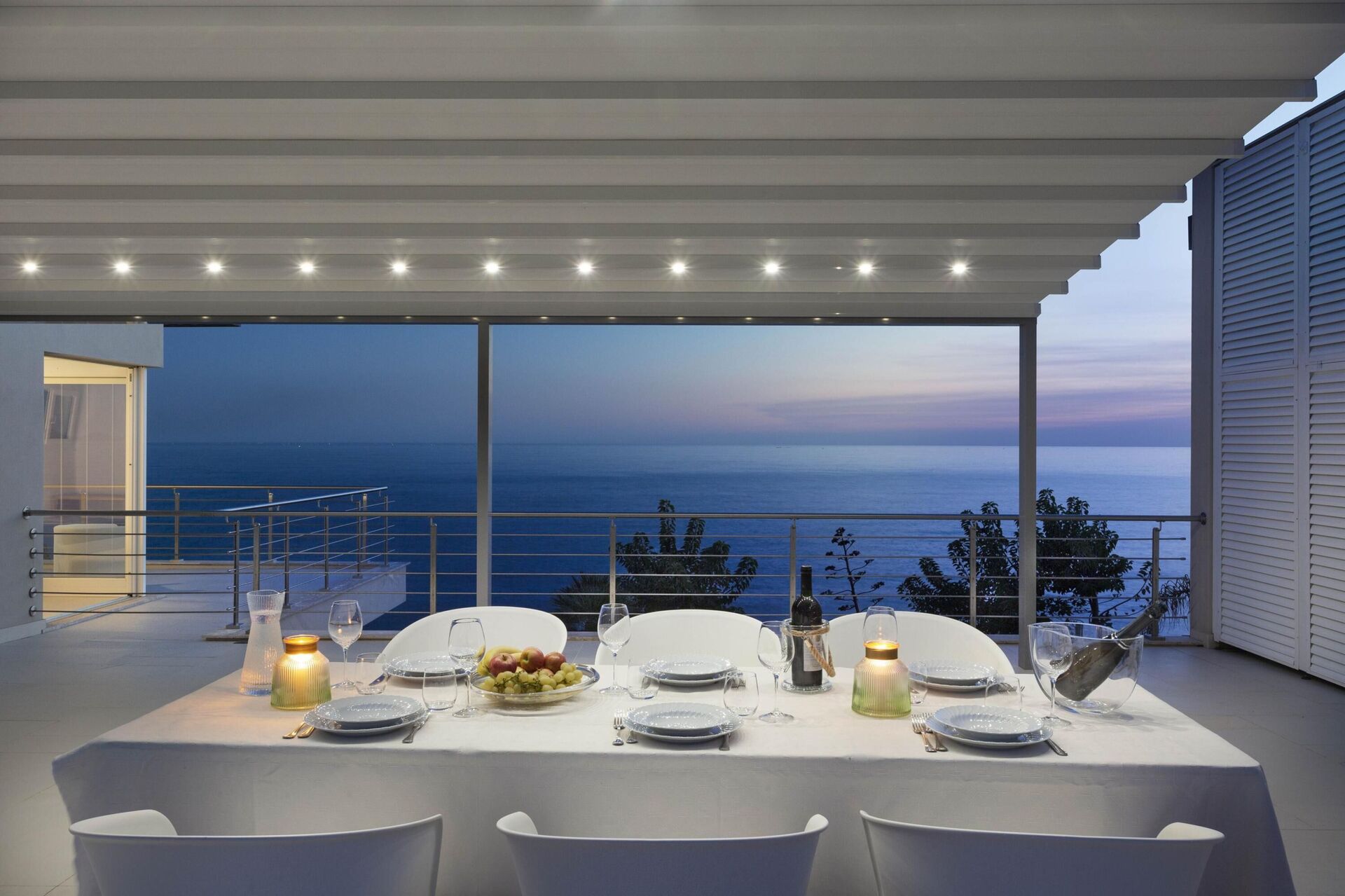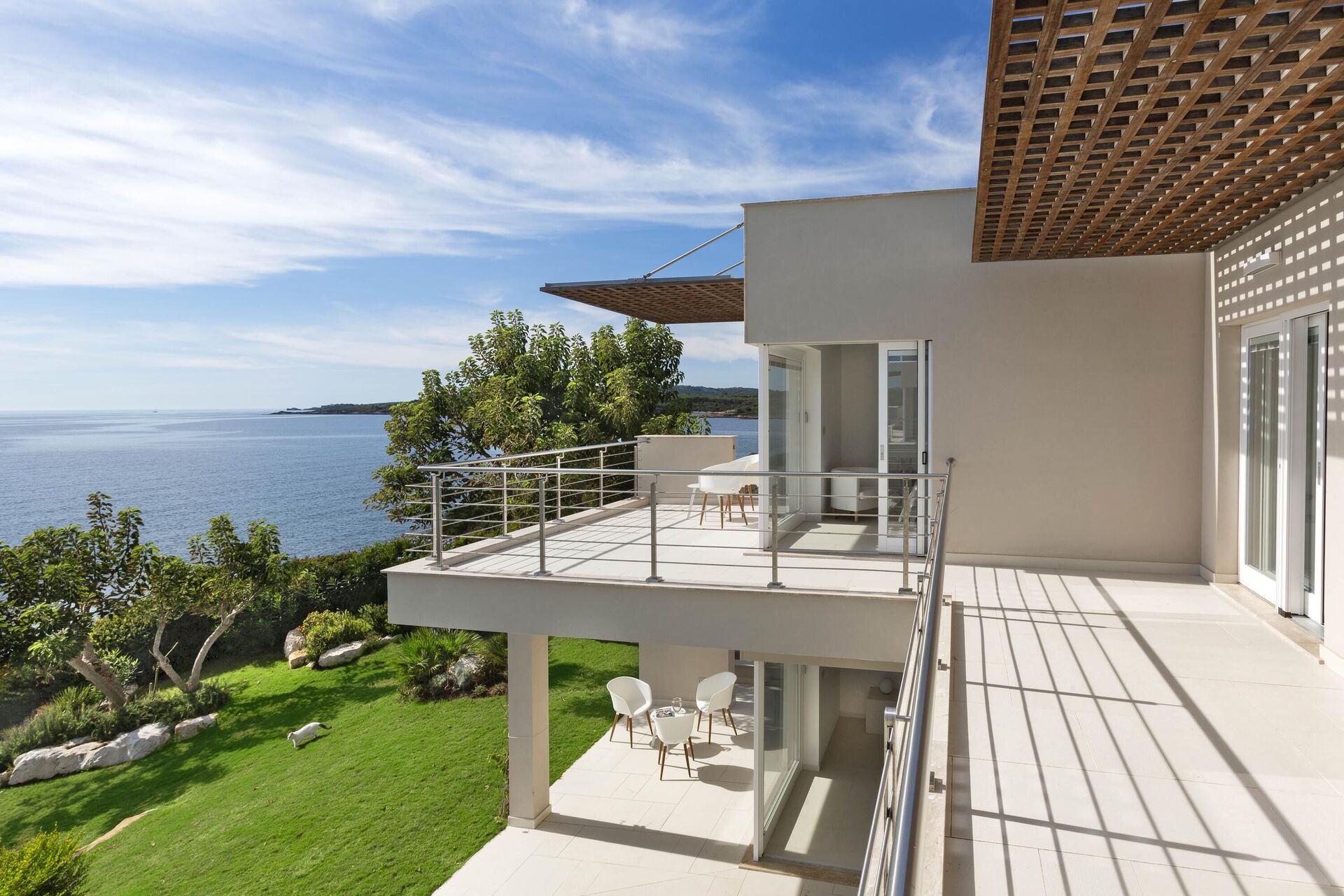 Hela sidan av husets första våning, bara separerad på mitten, har en vacker balkong med pergola, matplats och vacker havsutsikt.