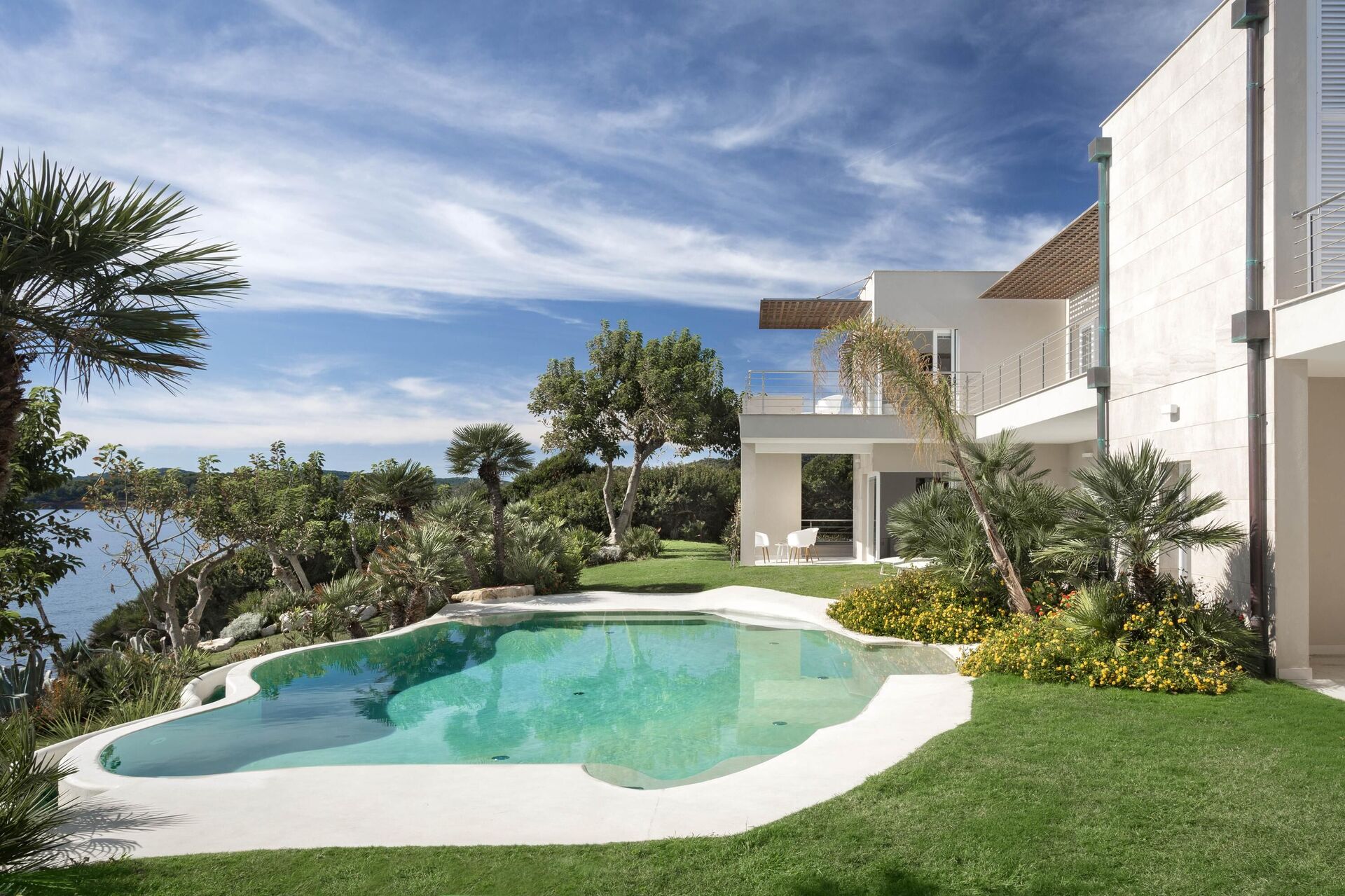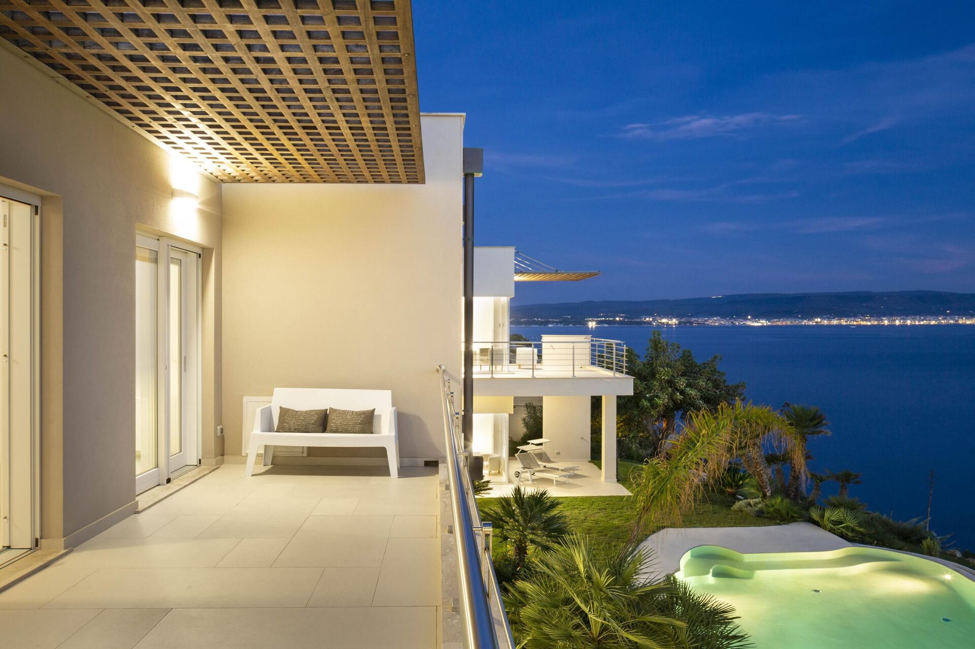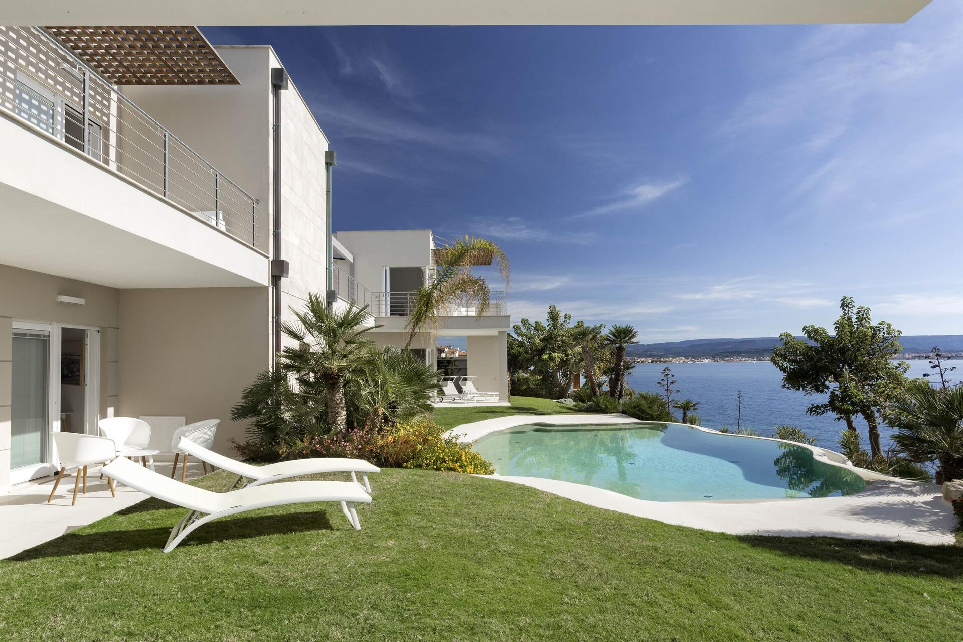 Hela sidan av husets första våning, bara separerad på mitten, har en vacker balkong med pergola, matplats och vacker havsutsikt.