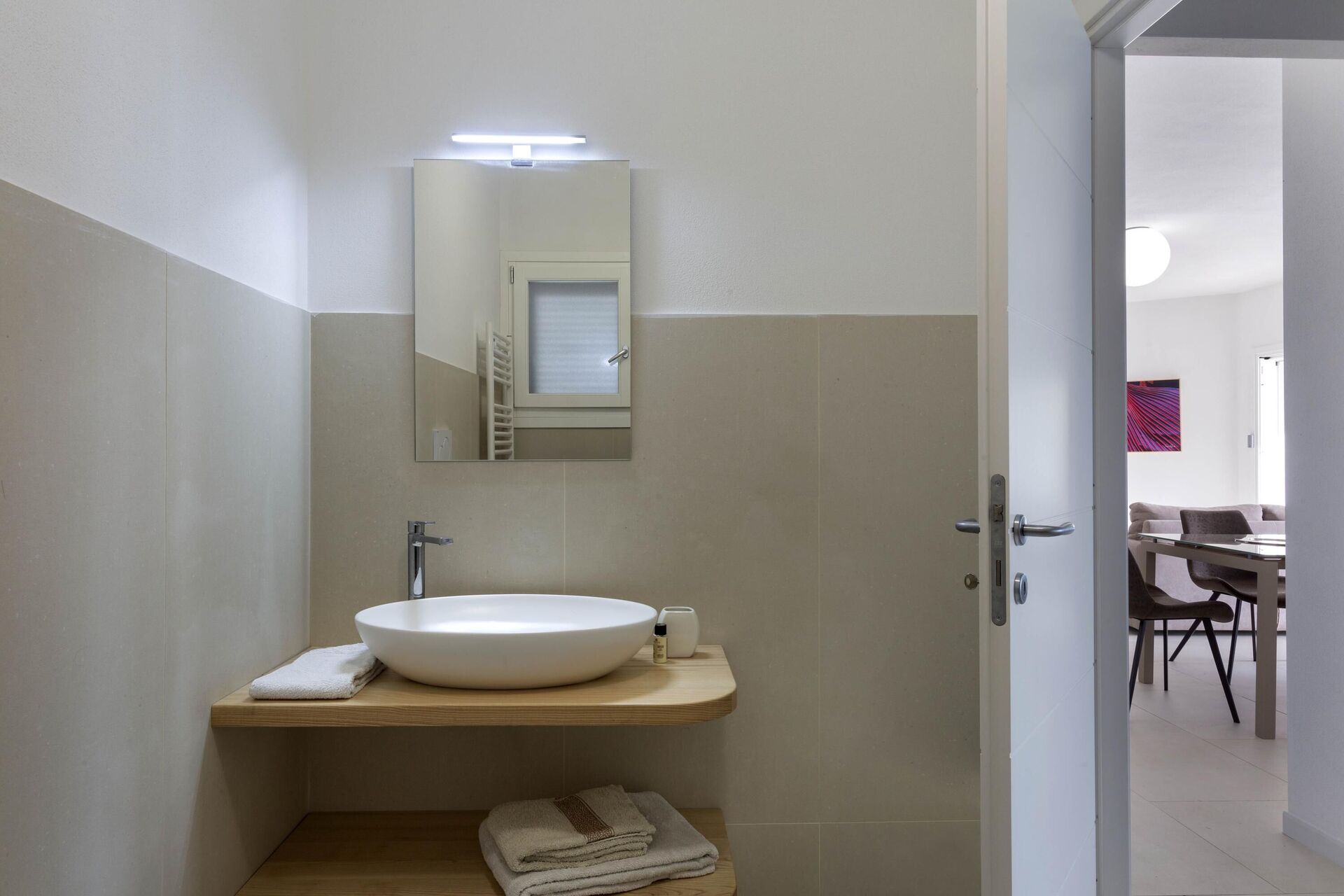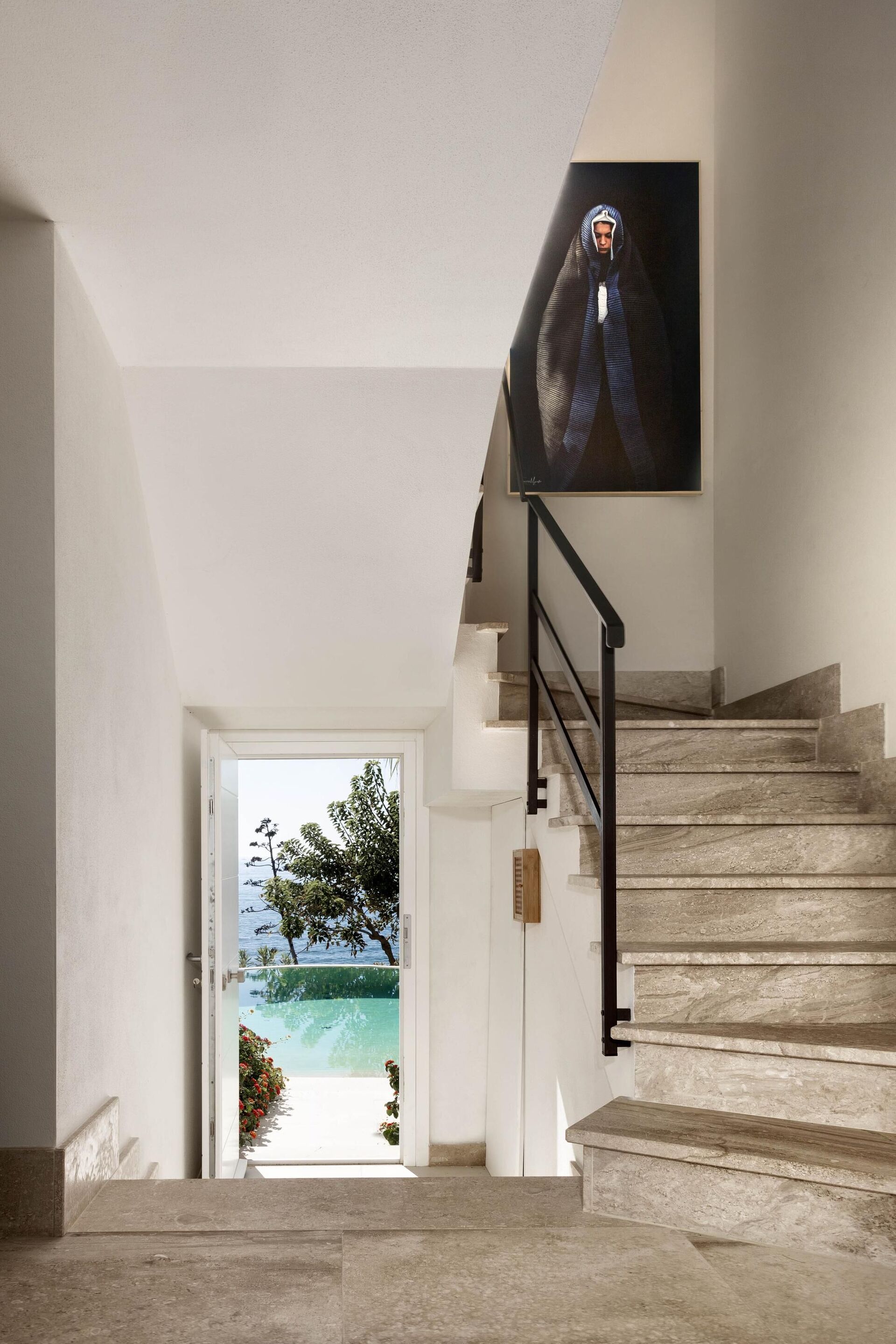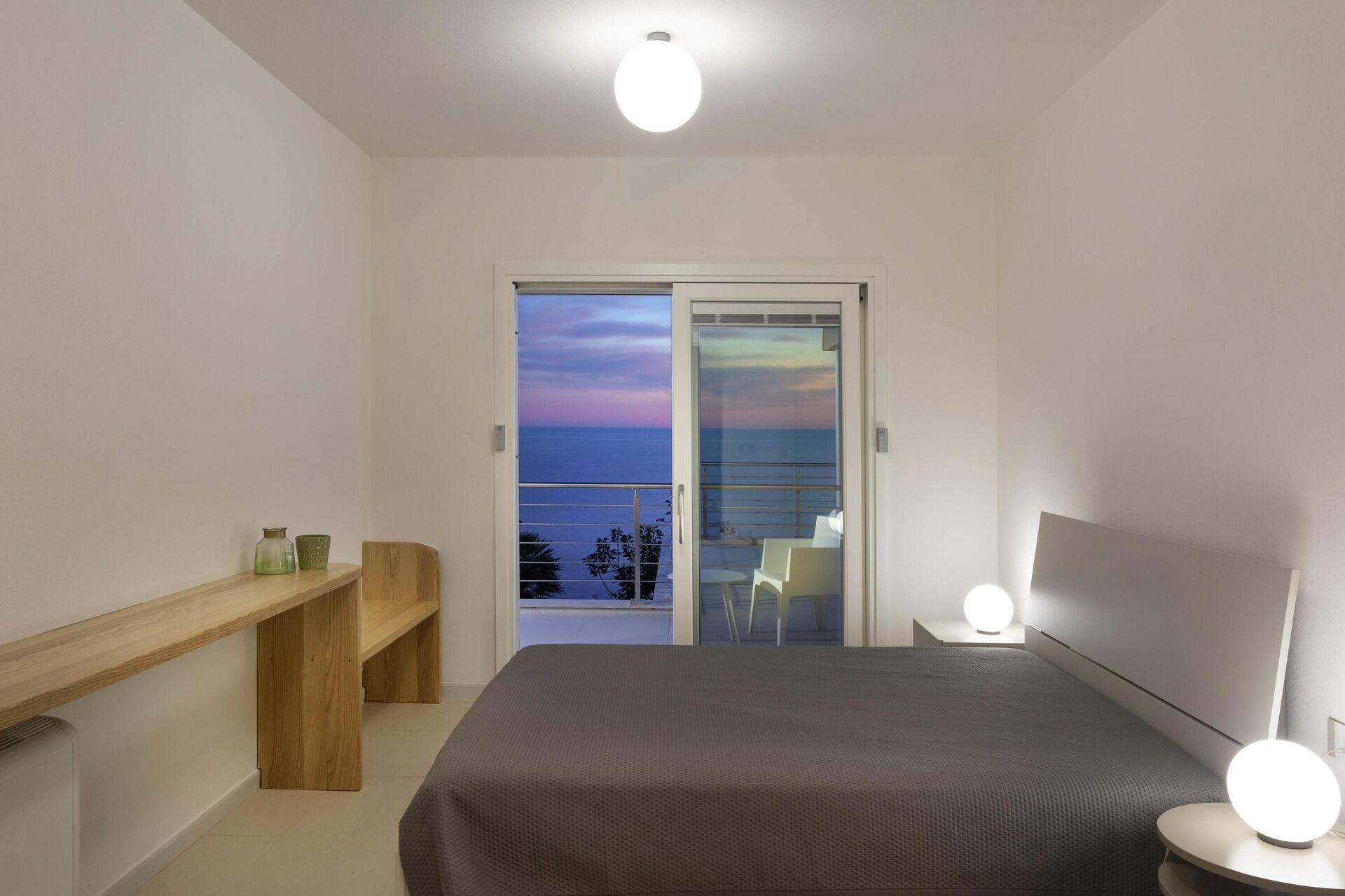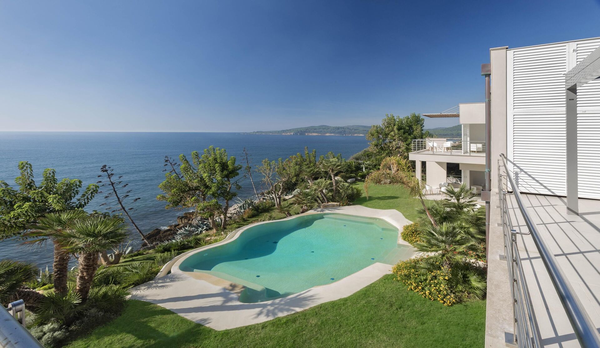 Hela sidan av husets första våning, bara separerad på mitten, har en vacker balkong med pergola, matplats och vacker havsutsikt.