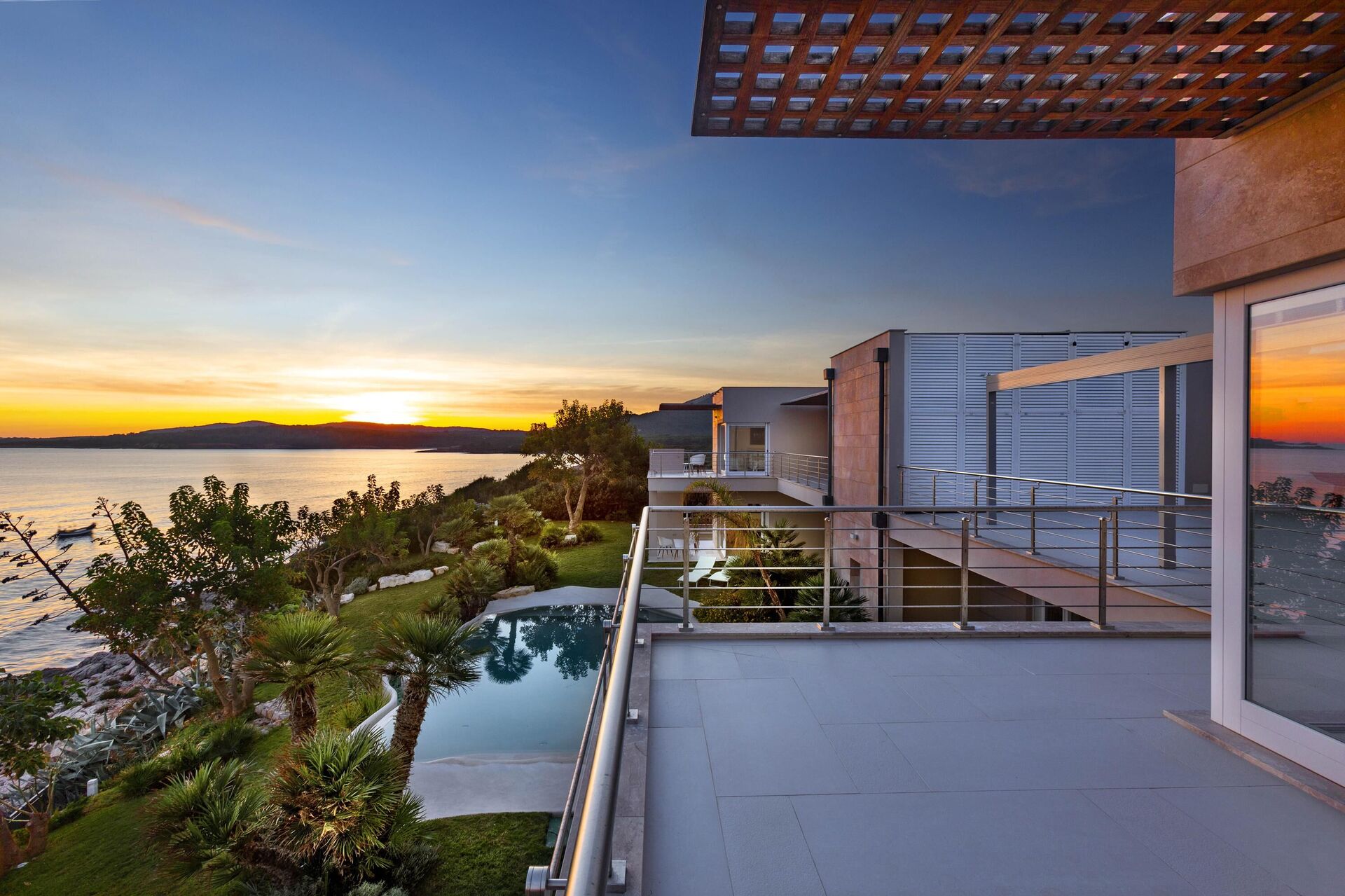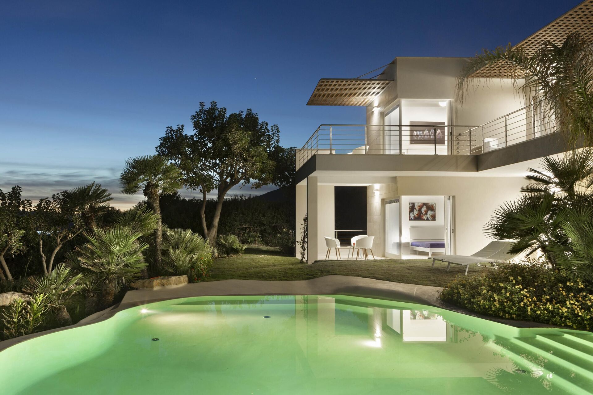 I den stora trädgården som går runt hela huset finns en vacker pool där du kan njuta av solnedgångens vackra färger.