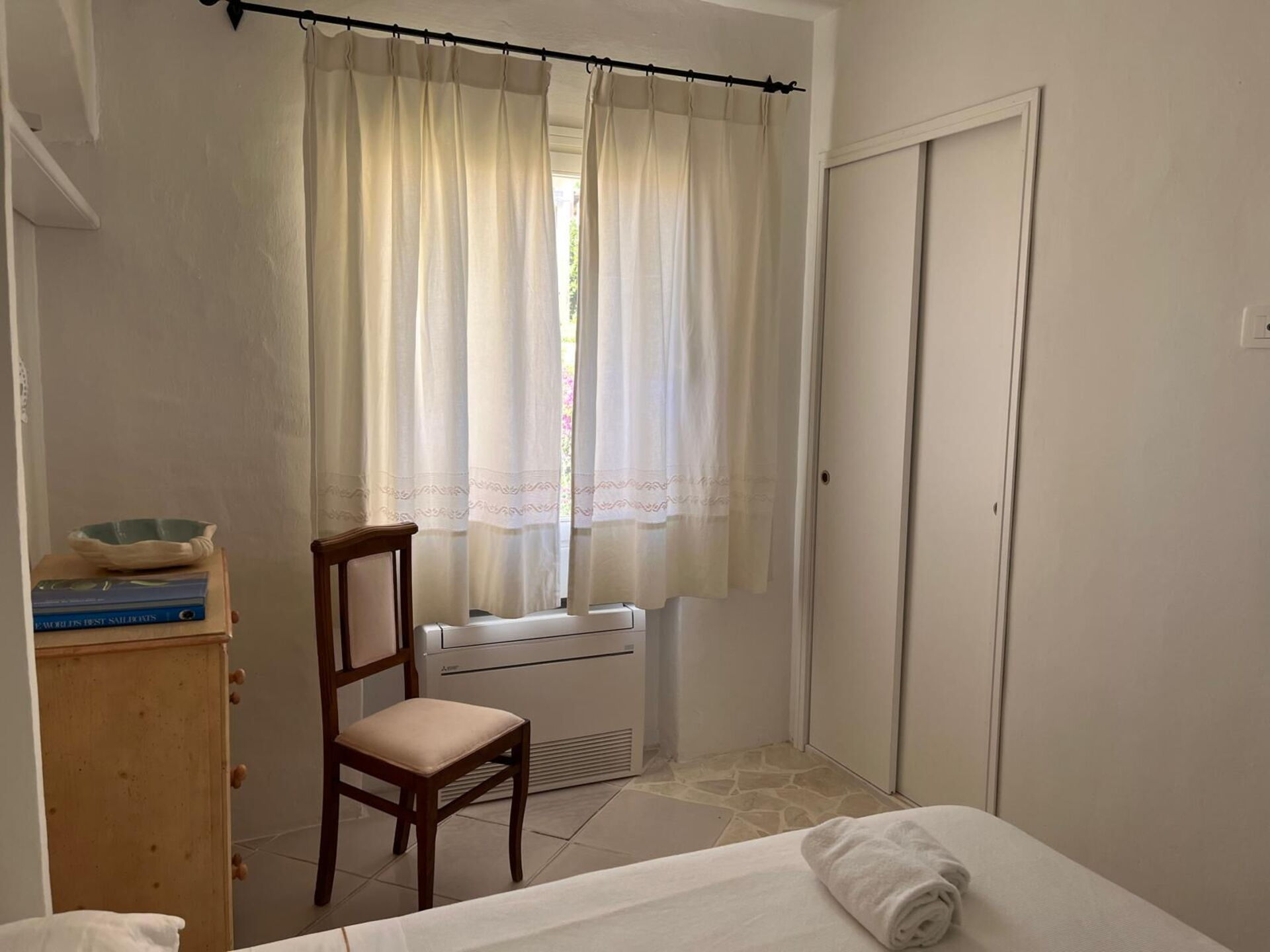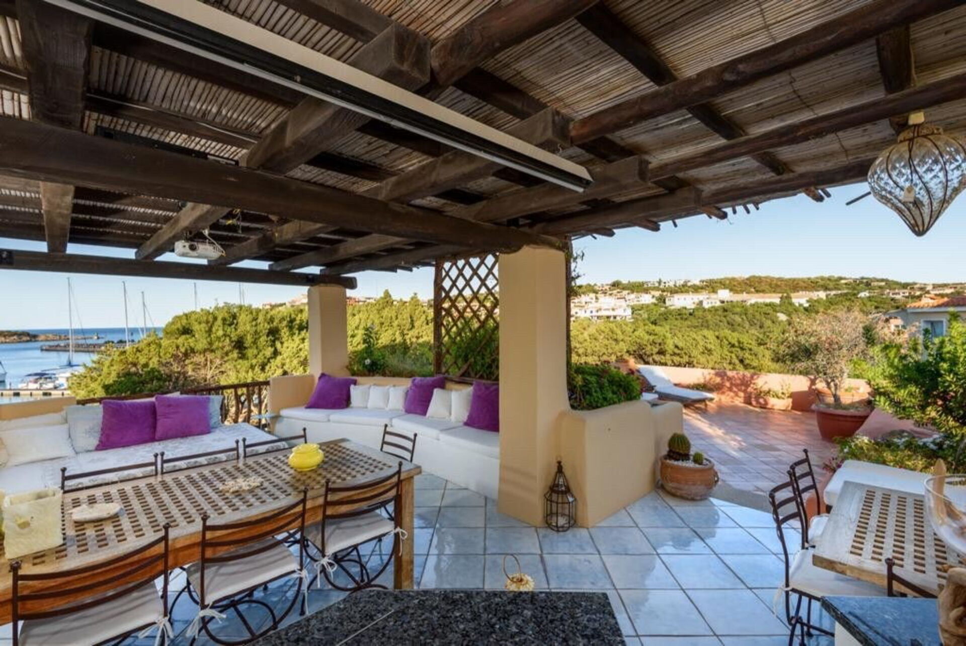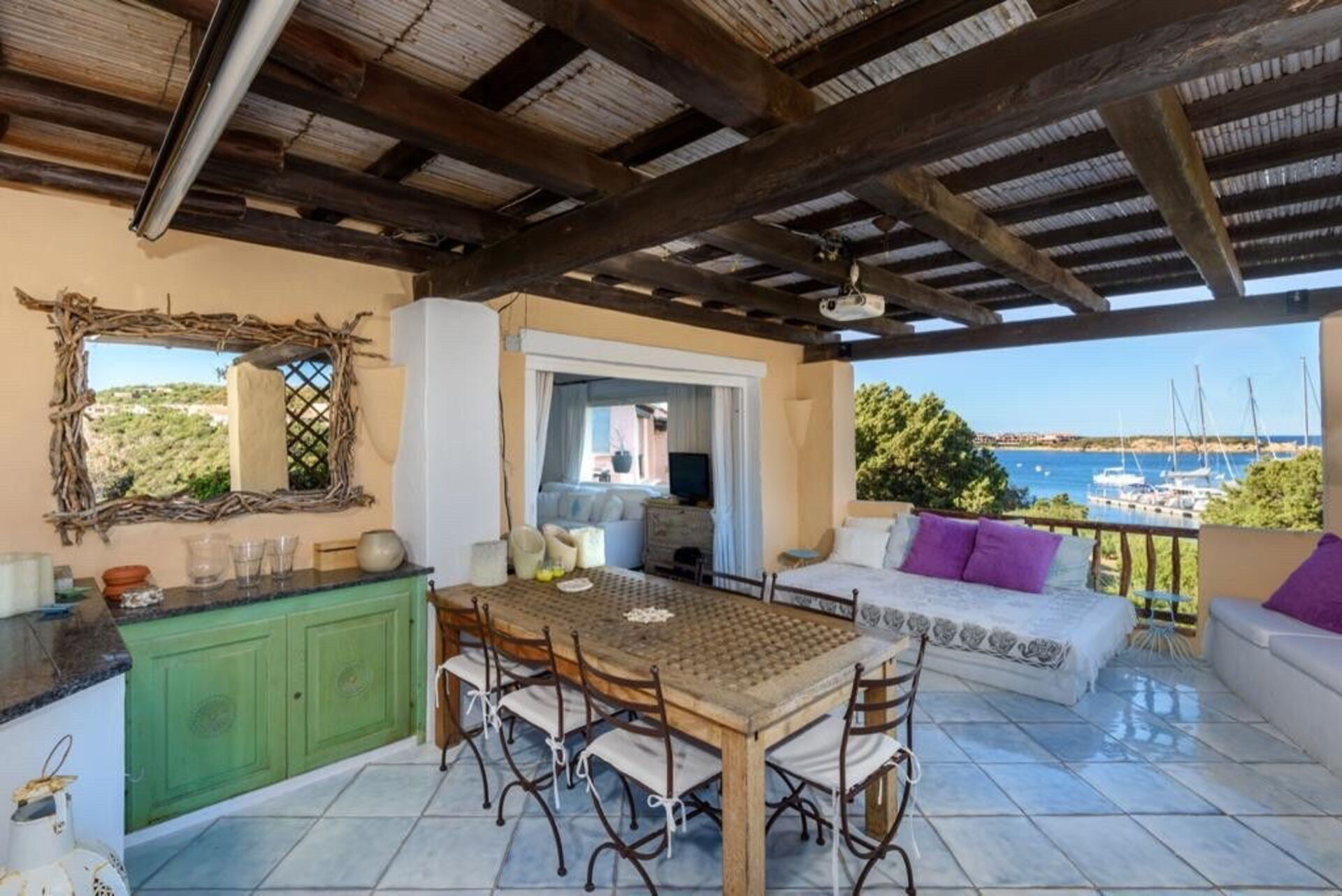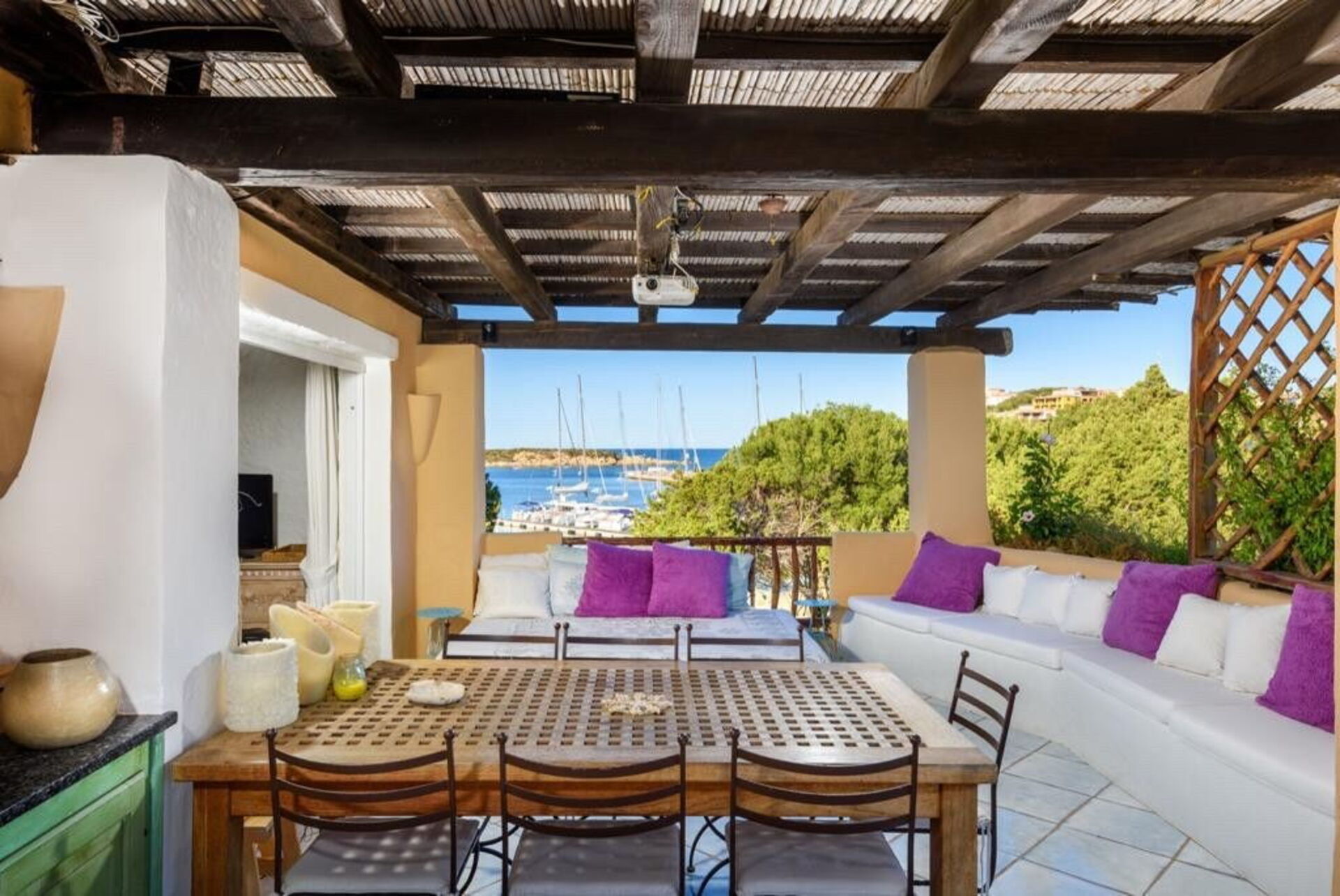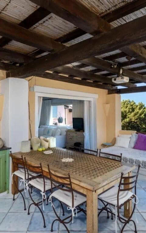 Det finns en täckt veranda med bord och stolar för måltider utomhus, med utsikt över den vackra gamla piren i Porto Corvo-bukten.