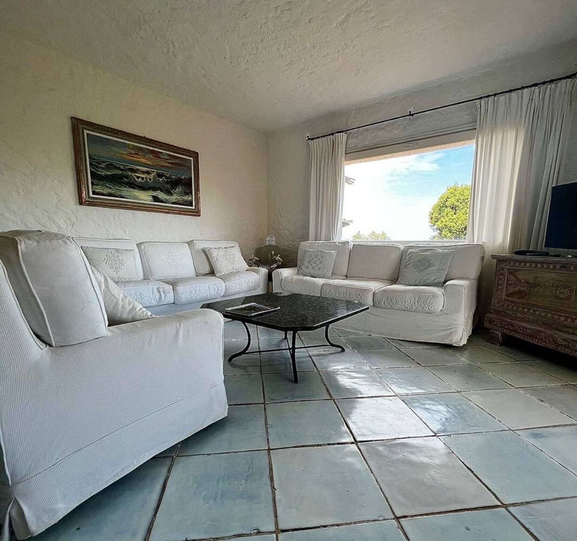 - Täckt veranda med bord, soffor, fåtöljer och fantastisk havsutsikt