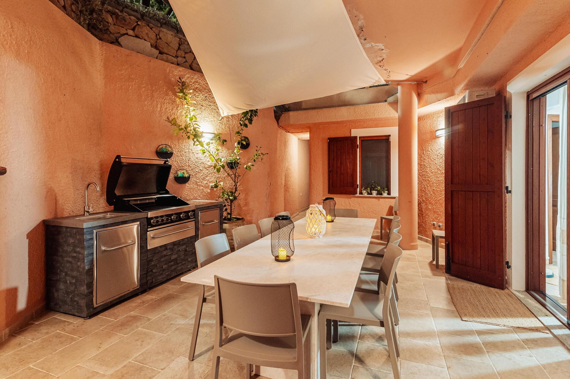 Både matsalen och köket har tillgång till uteplatsen med utomhus matplats (grill, vedeldad ugn).