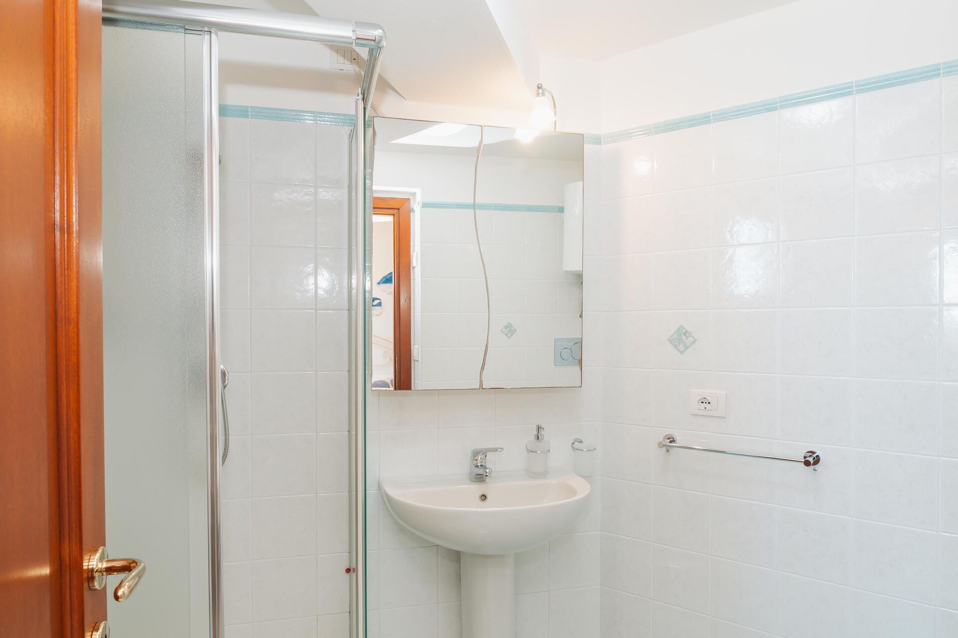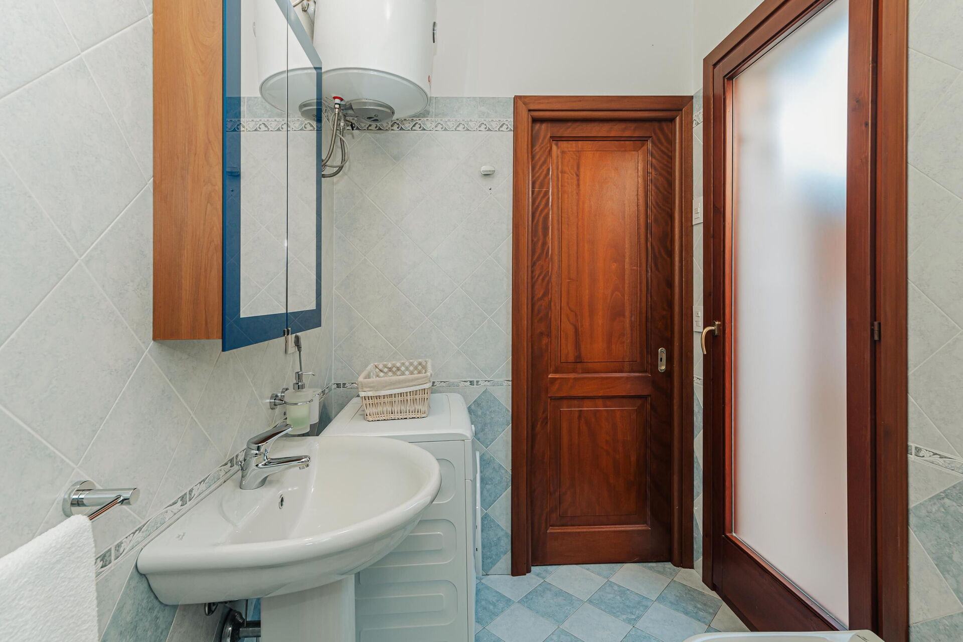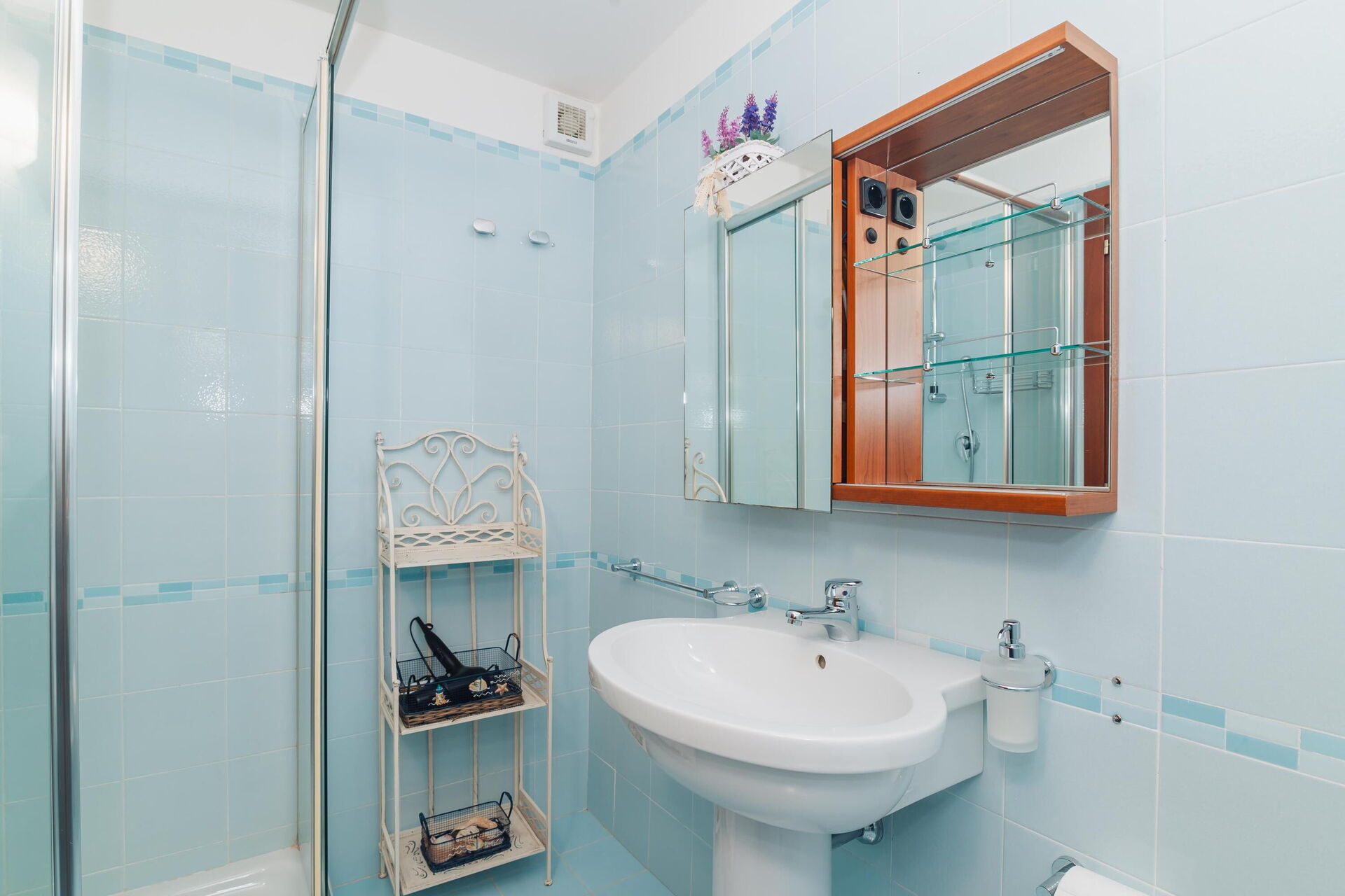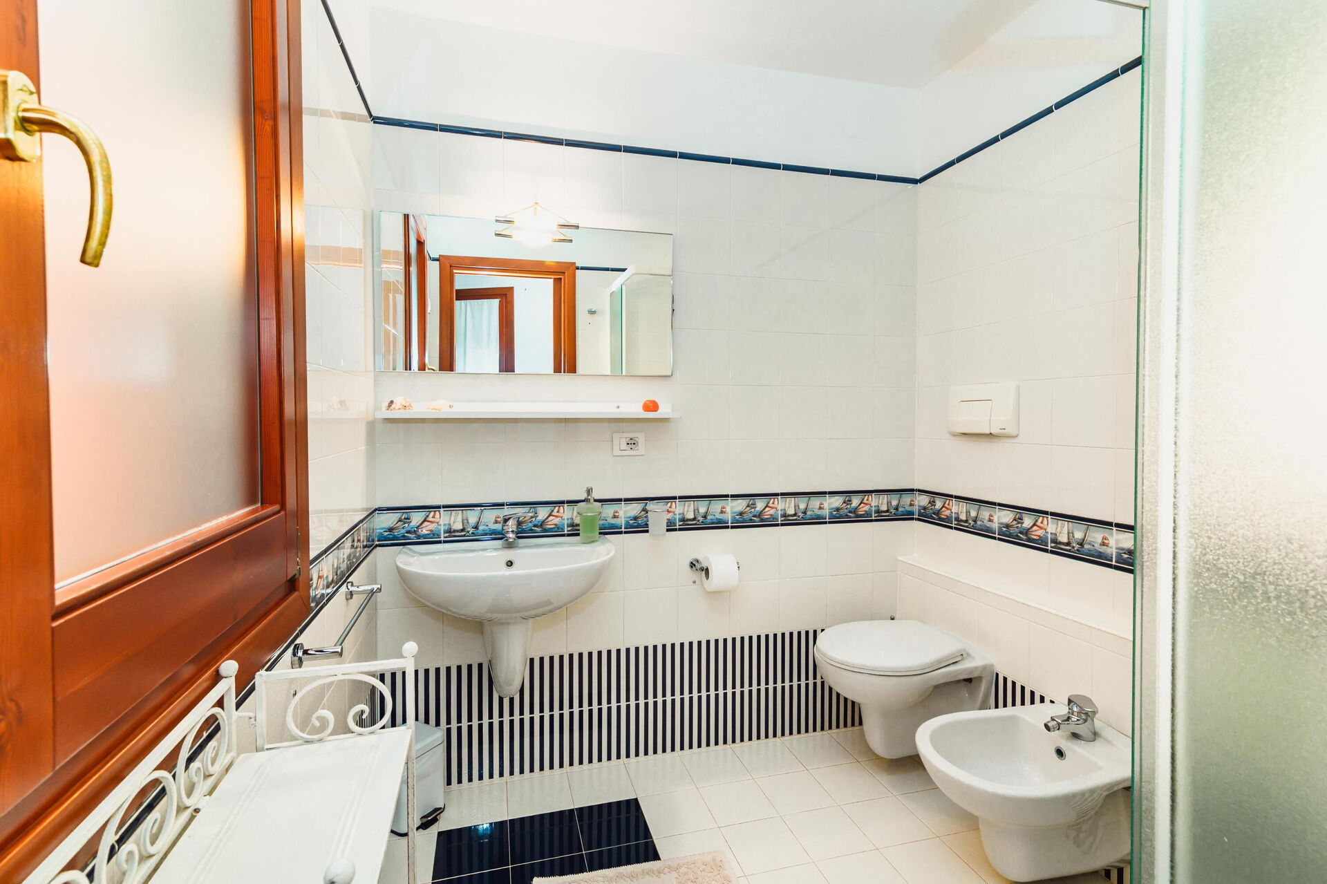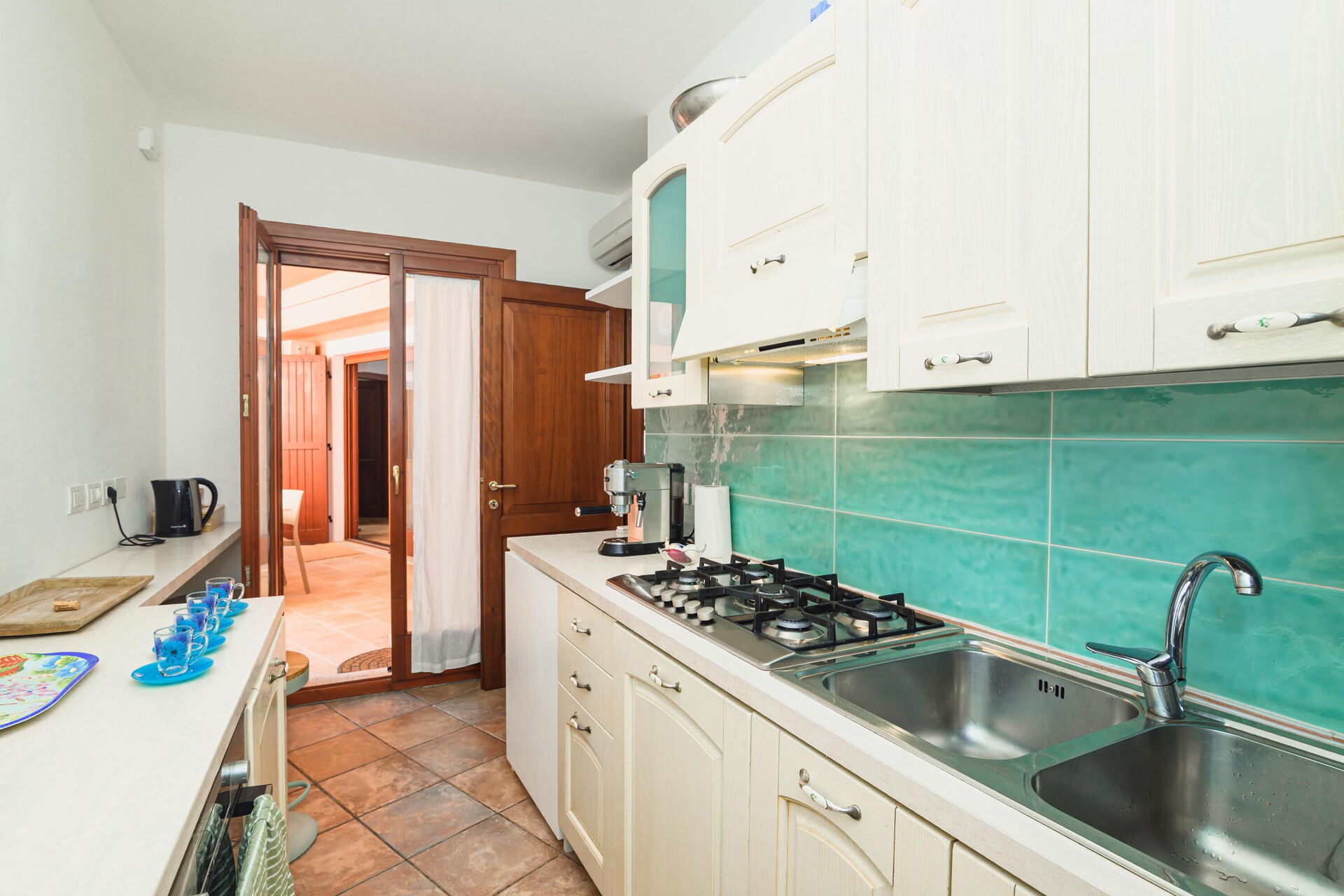 4 trappsteg upp: matsal (luftkonditionering), kök (häll, ugn, kylskåp, frys, diskmaskin, mikrovågsugn, espressokaffemaskin, brödrost), badrum med dusch (tvättmaskin), dubbelrum (luftkonditionering) med utgång till utsidan, badrum med dusch.