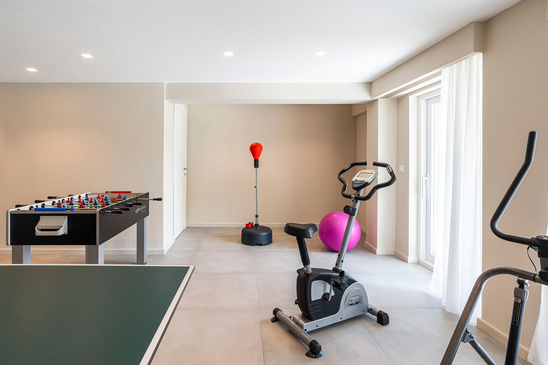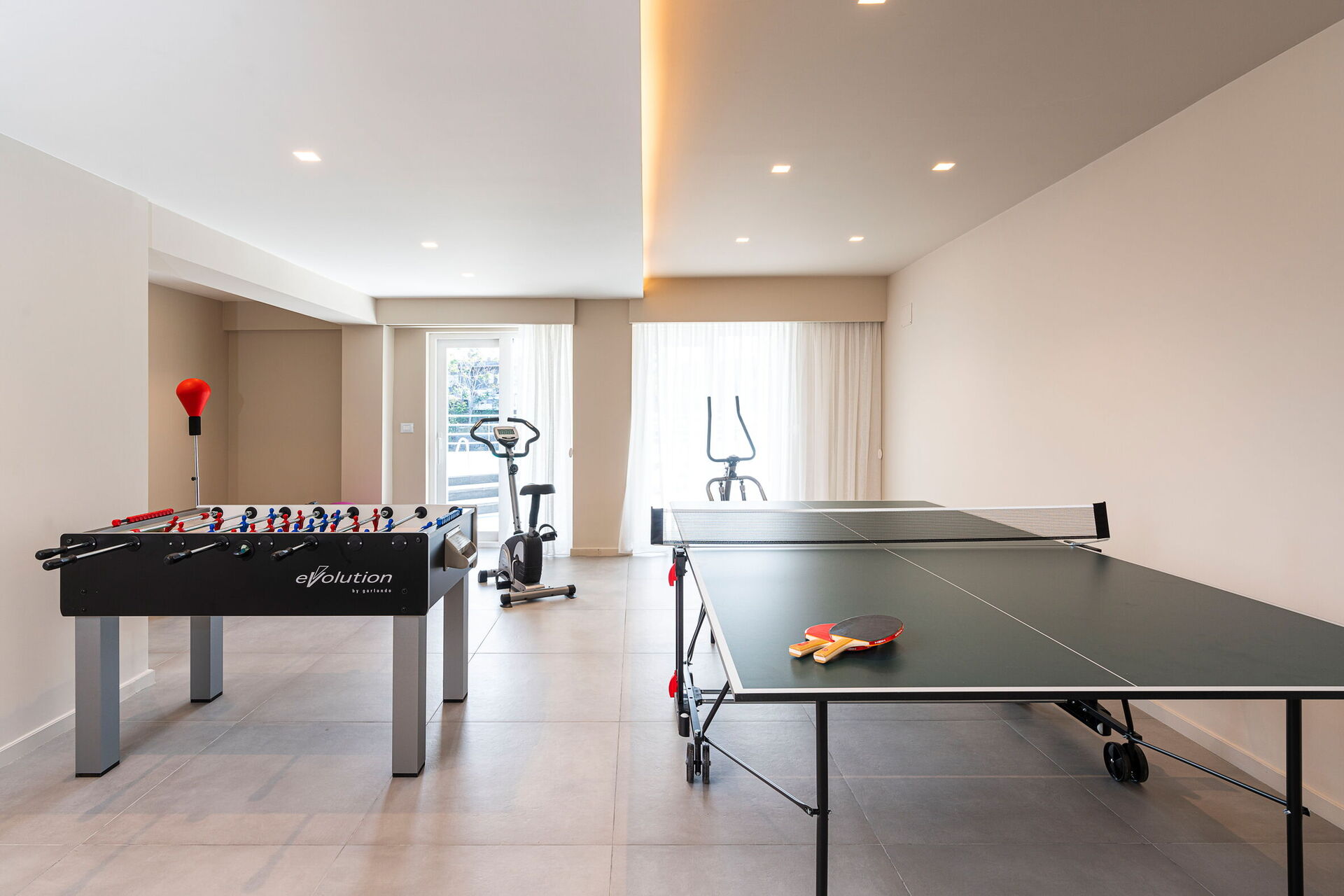 Stort vardagsrum med matplats och kök, 1 dubbelrum (king size-säng) med eget badkar, 1 tvåbäddsrum med eget duschrum, 1 dubbelrum med eget badrum , lekrum med bordtennisbord, bordsfotboll och boxningspåse