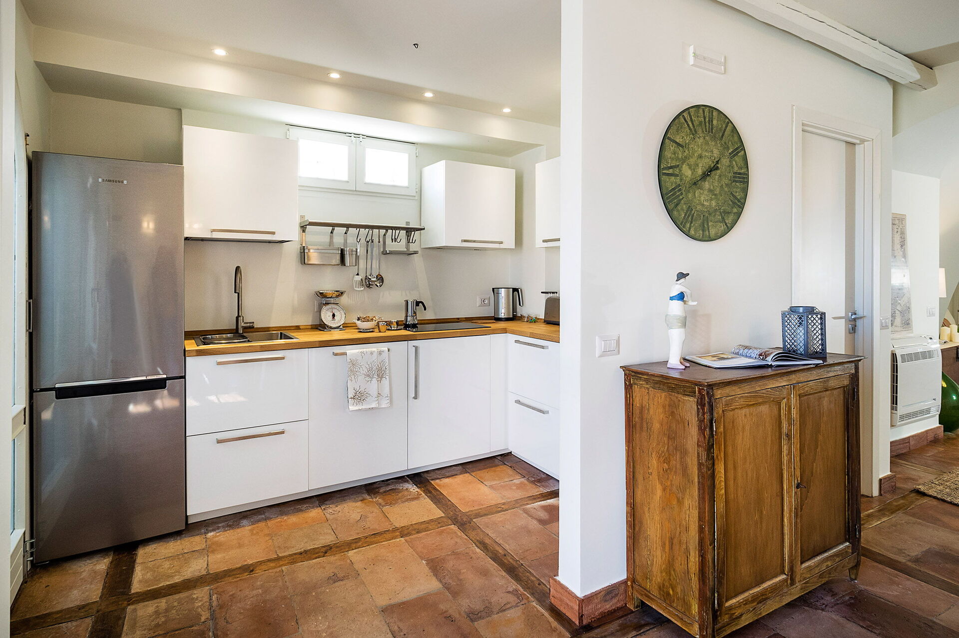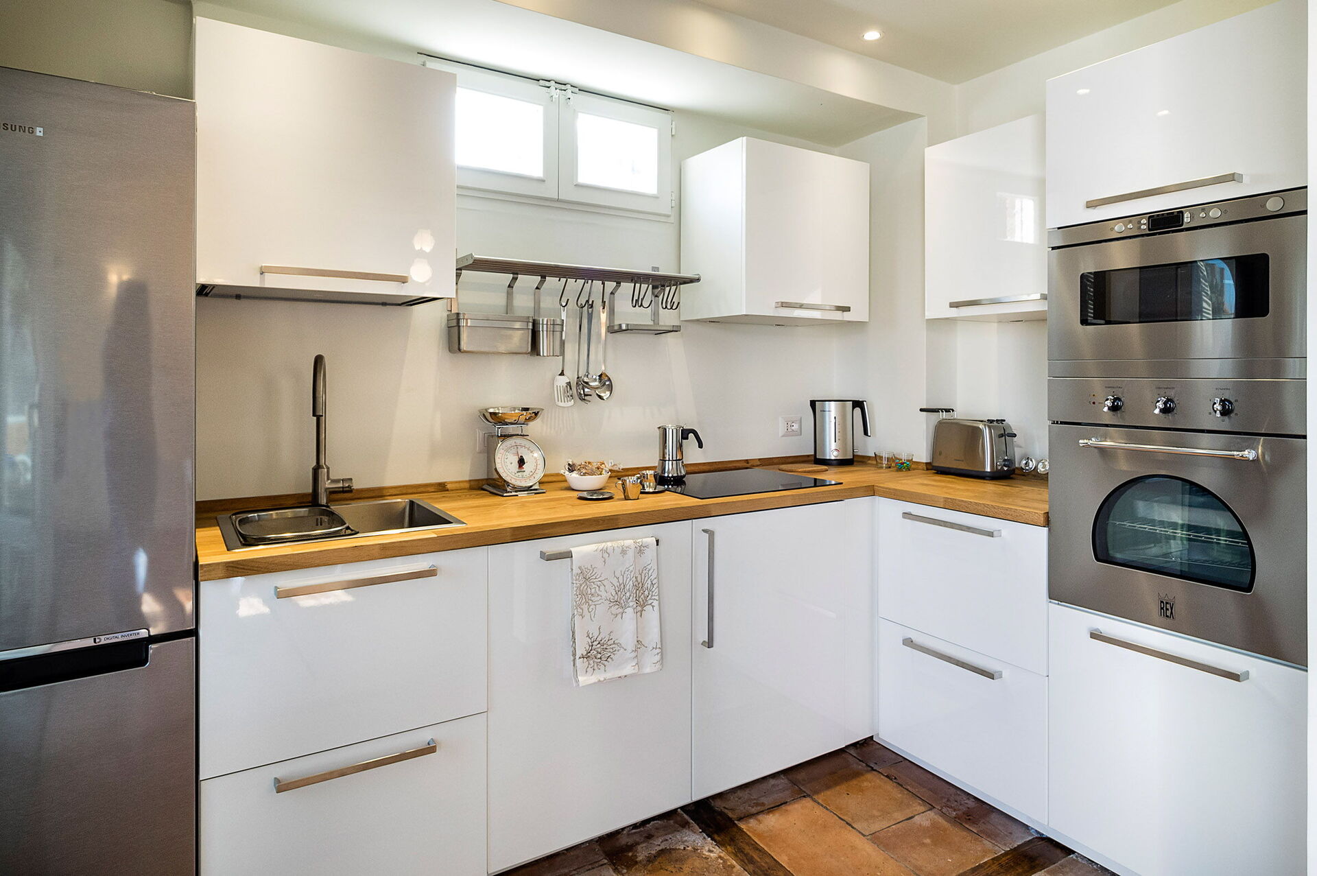 Ingång till vardagsrum (luftkonditionering) med matplats och tillgång till trädgården, kök (spishäll, ugn, kyl, brödrost, mikrovågsugn), badrum med dusch