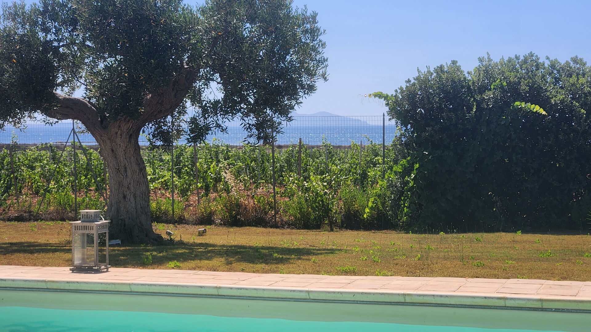 Semesterhuset har en underbar panoramautsikt över havet från poolen och de rymliga terrasserna, inte minst mot grannfastigheten som är en vingård.