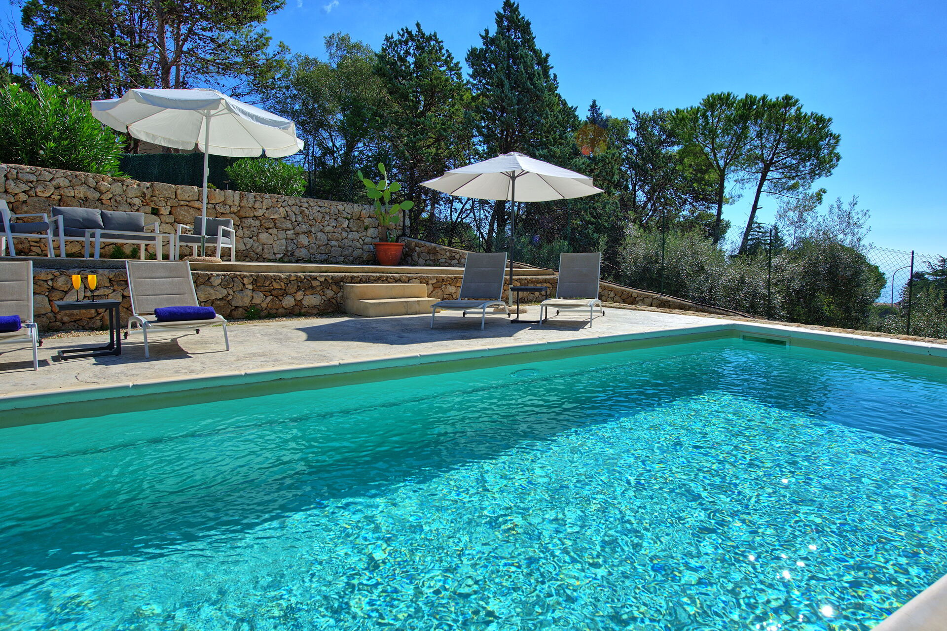 Höjd bottenvåning (åtkomst upp 7 trappsteg från trädgården): vardagsrum med matplats, kök (ugn, frys, mikrovågsugn, diskmaskin, 4-brännare spishäll, espressomaskin, amerikansk kaffebryggare) och tillgång till den täckta, möblerade terrassen; 3 dubbelrum alla med eget badrum med dusch.