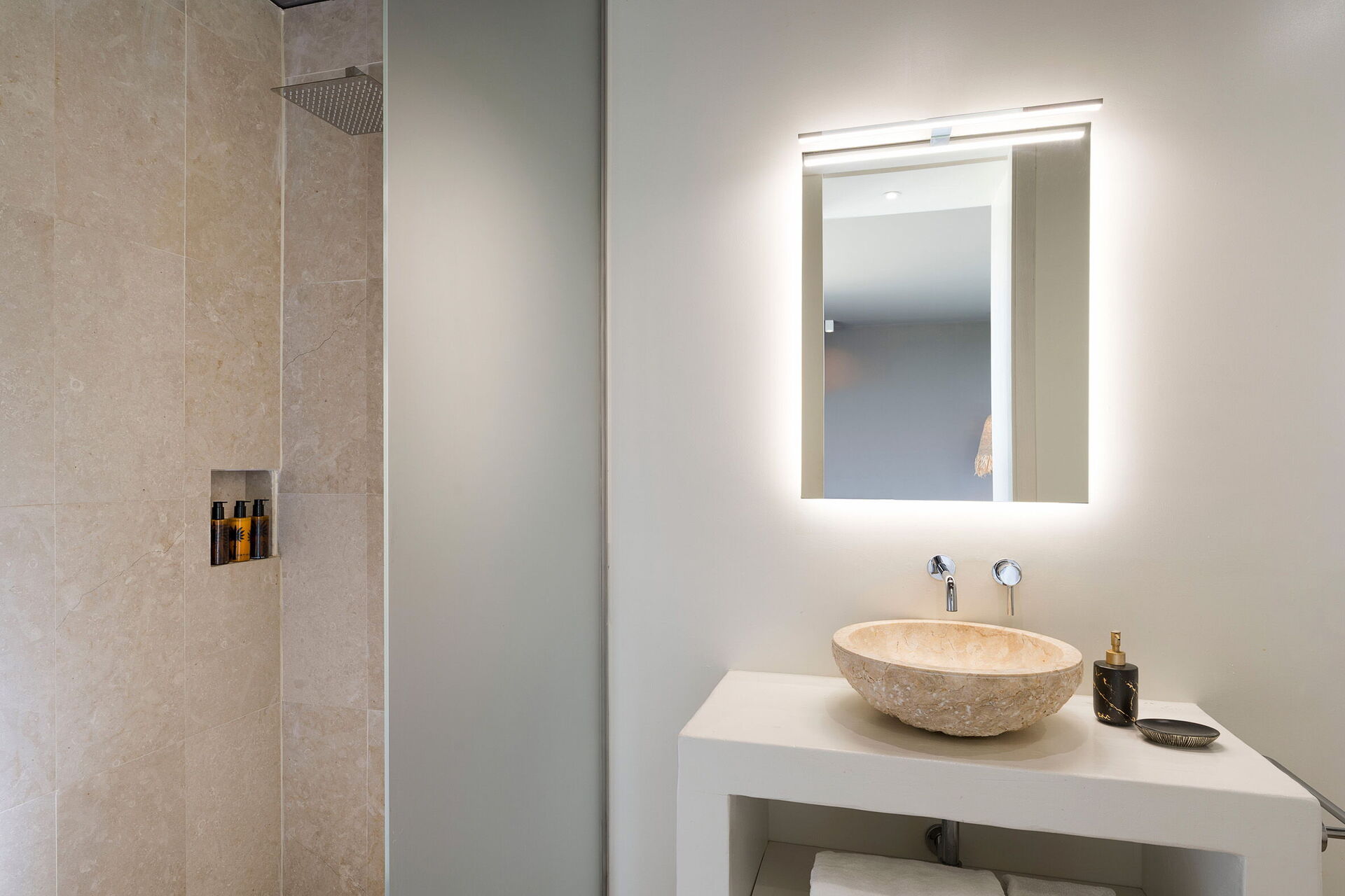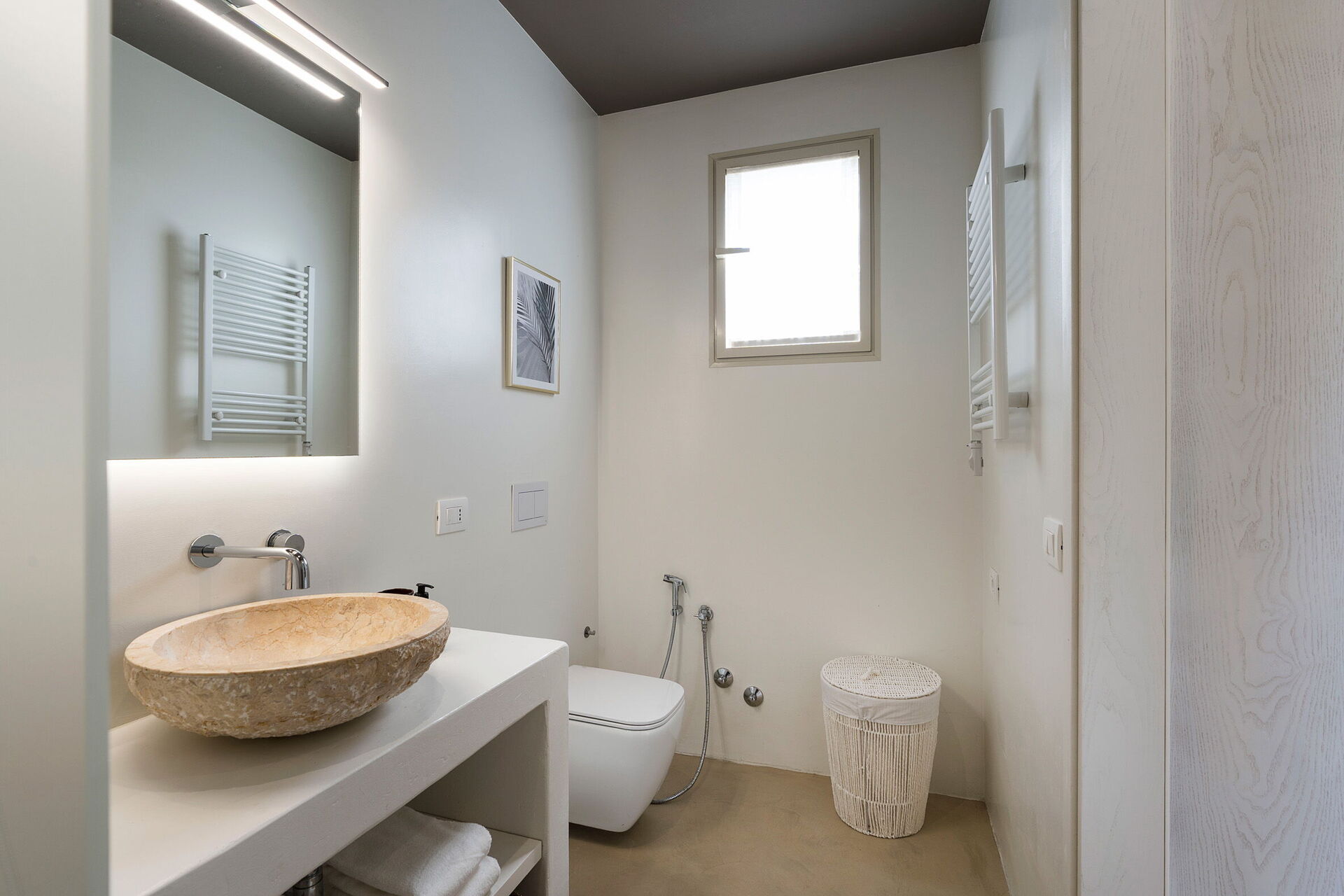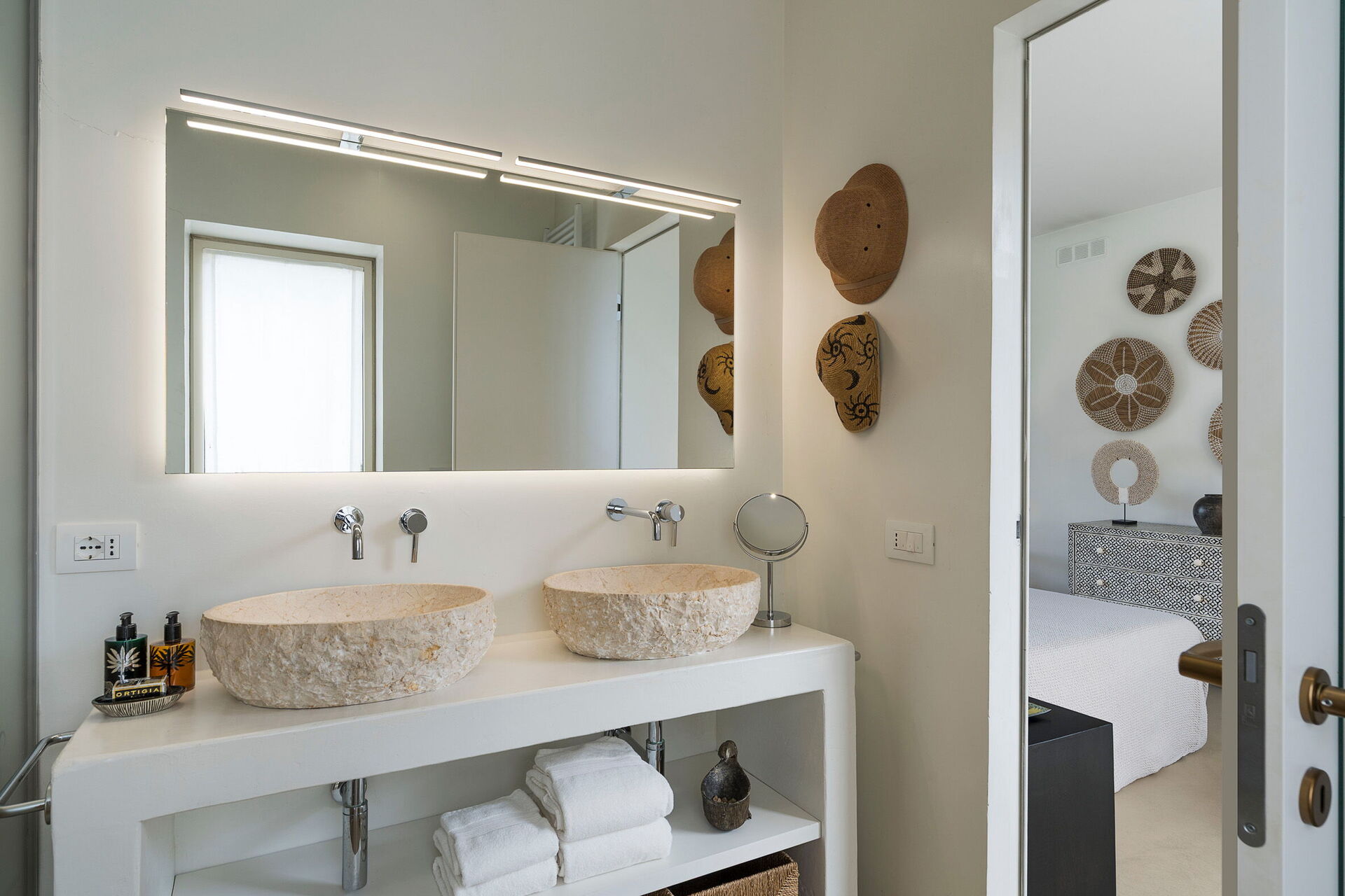 Bottenvåning (endast tillgänglig utifrån och inte ansluten till resten av villan inifrån): dubbelrum (sängmått: 160 x 190 cm) med eget badrum med dusch; sovrum med dubbelsäng (kan delas till 2 enkelsängar på begäran; sängmått: 160/80 x 190 cm) med eget badrum med dusch.