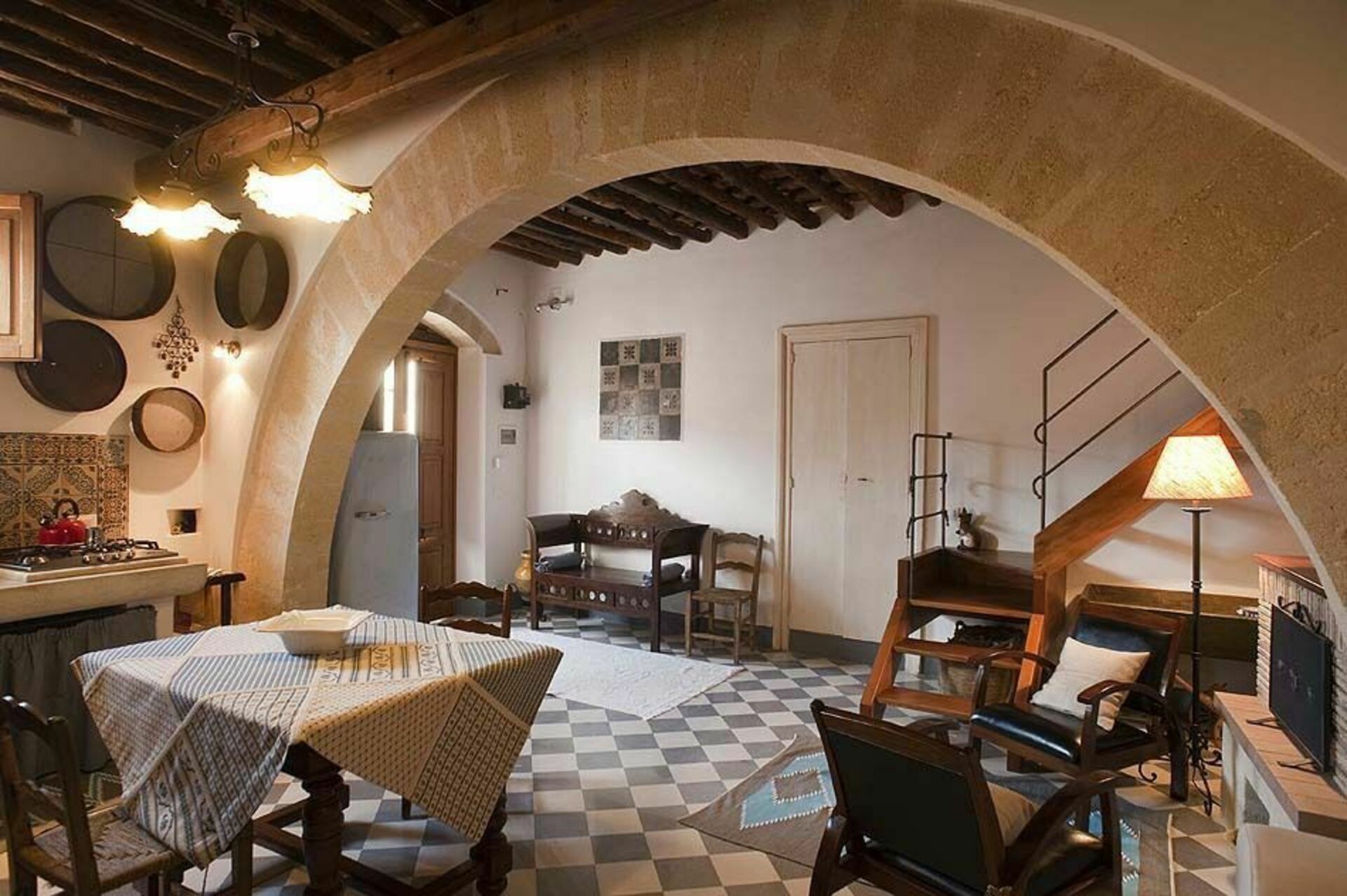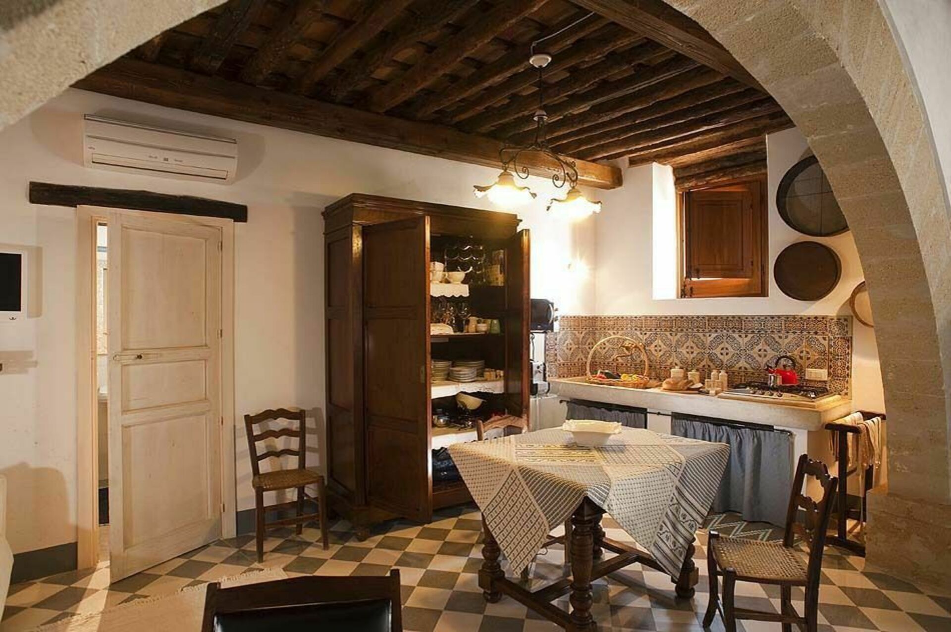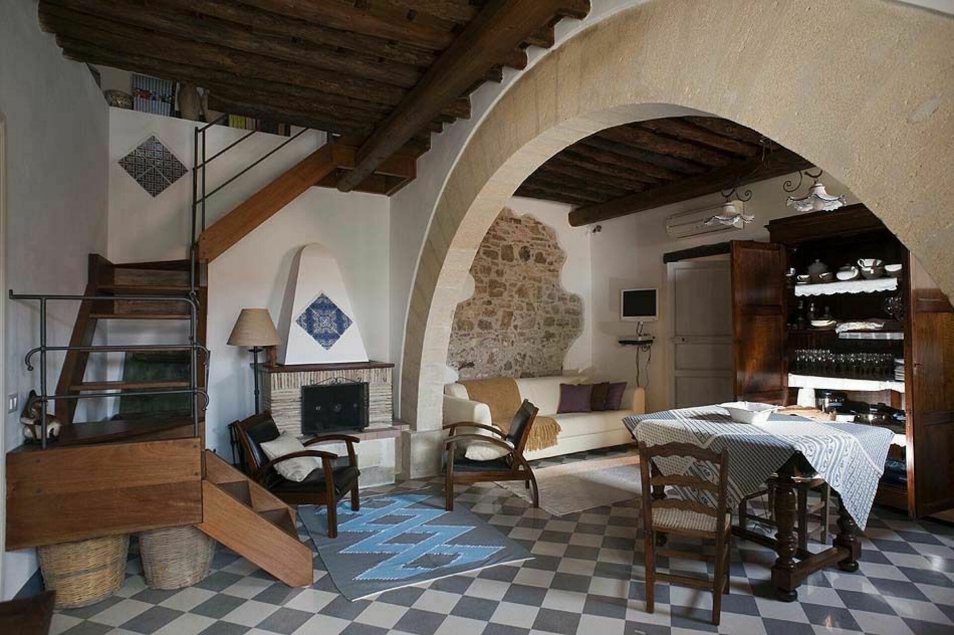 Träbjälkar i taket och tjocka stenväggar, vardagsrum med öppen spis, ett välutrustat kök som vetter mot terrassen, två bekväma dubbelrum, ett genomgångsrum med två enkelsängar och två badrum.